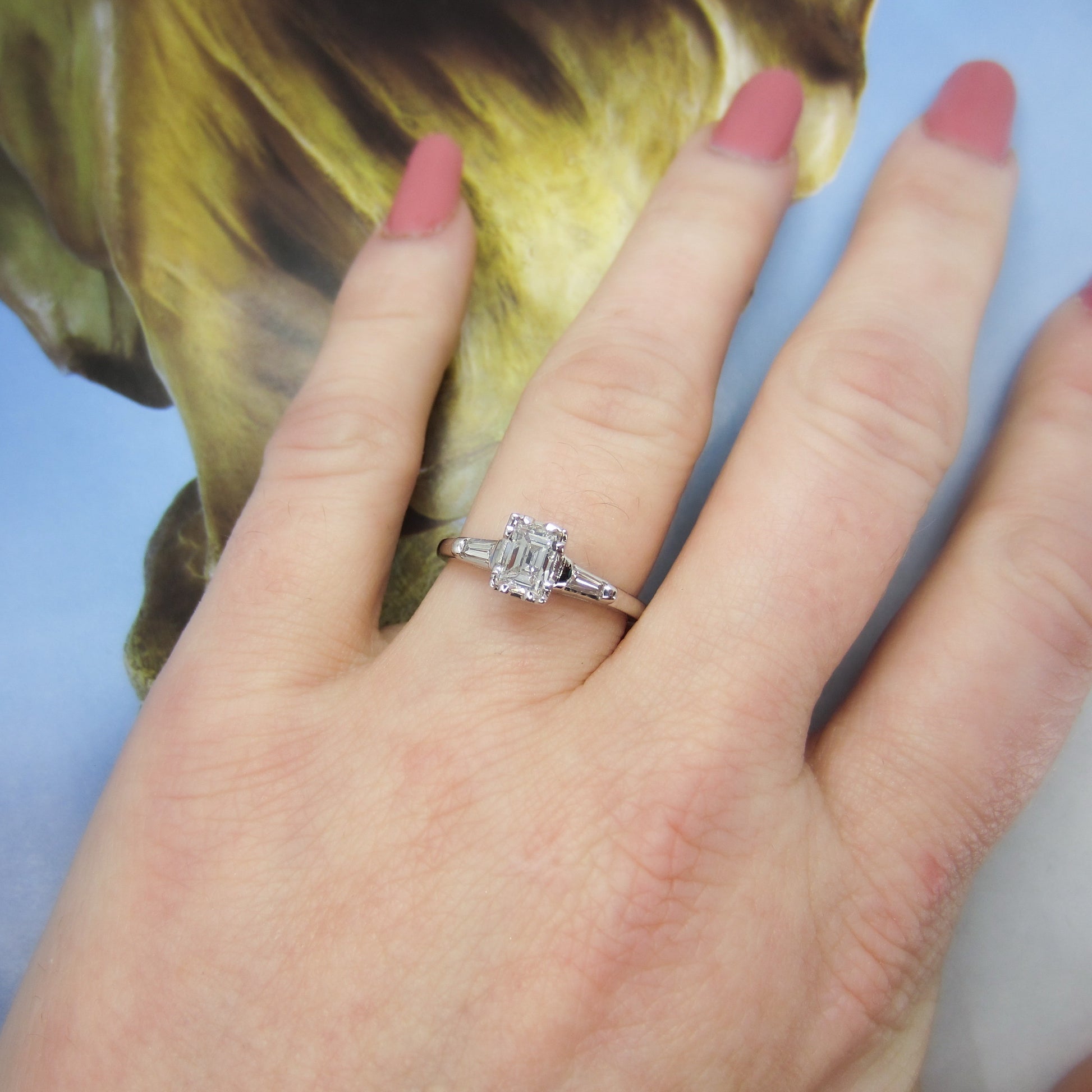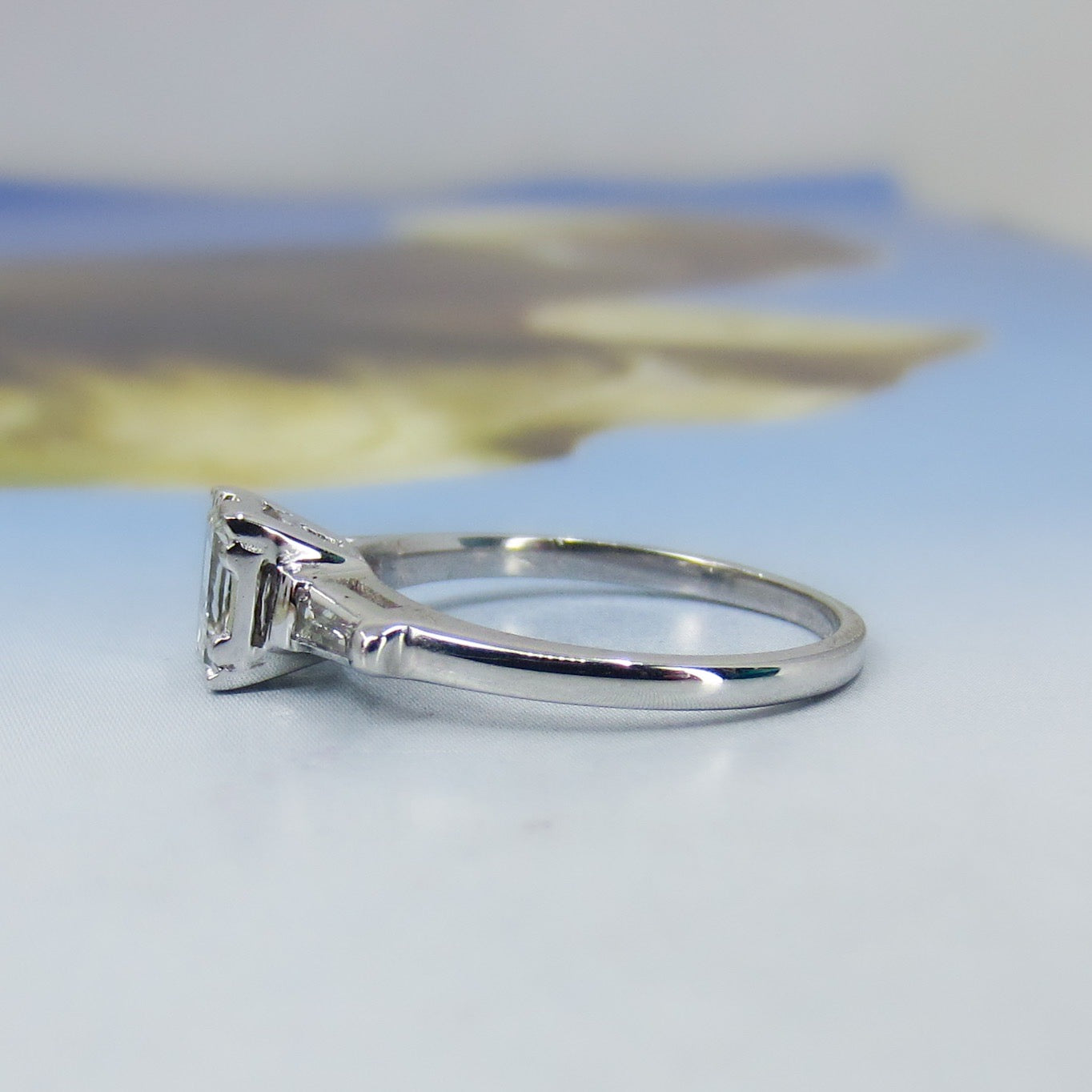 A classic Art Deco Emerald Cut diamond engagement ring, made in 14k white gold and set with two tapered baguette cut diamonds on the shoulders. Circa 1940.