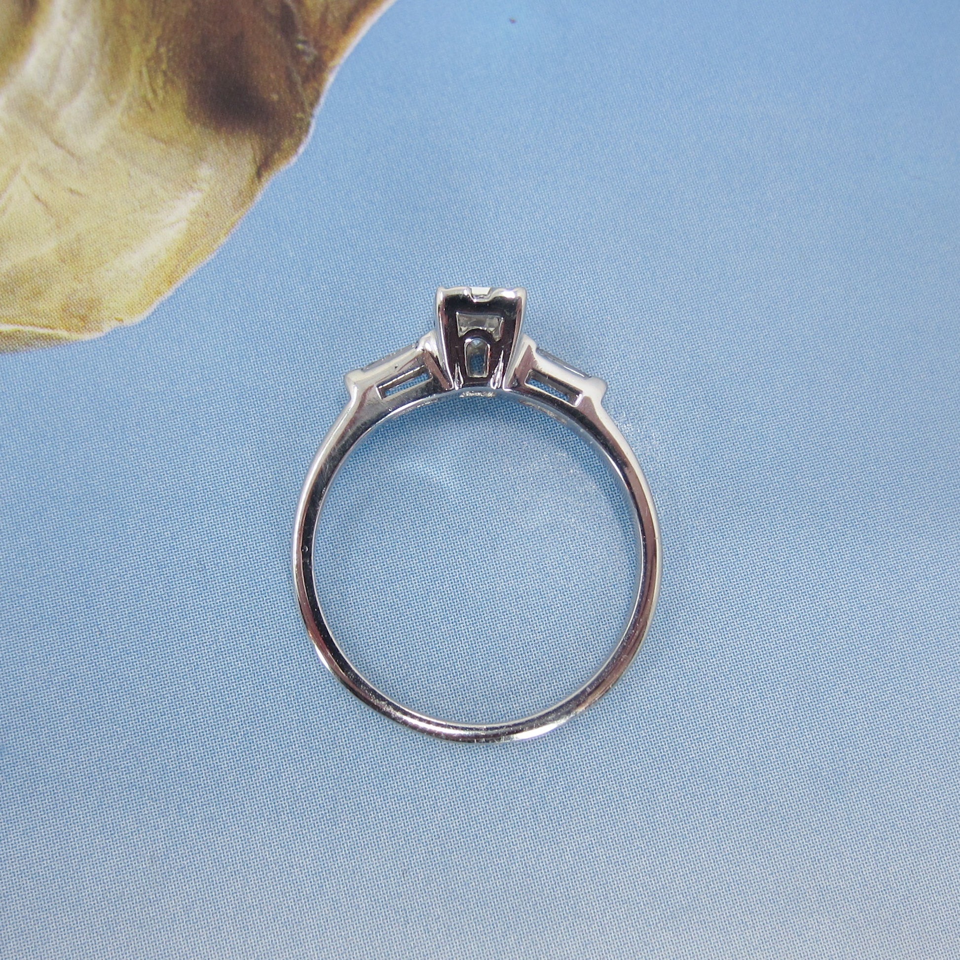 Contains one natural Emerald Cut diamond weighing approximately .40ct with F-G Color and SI1 Clarity. Also contains two natural tapered baguette cut diamonds weighing approximately .24ctw with G-H Color and VS2-SI1 Clarity.