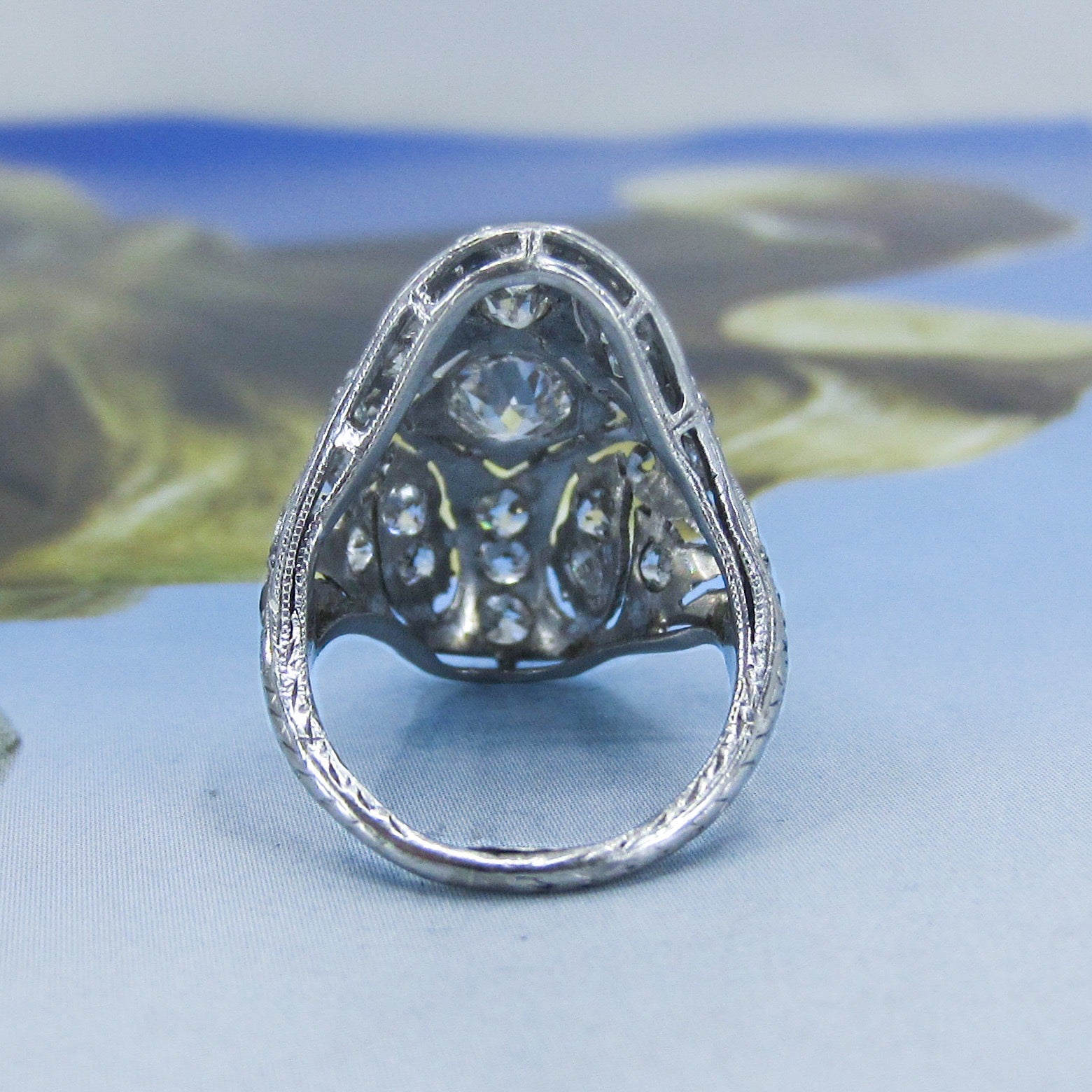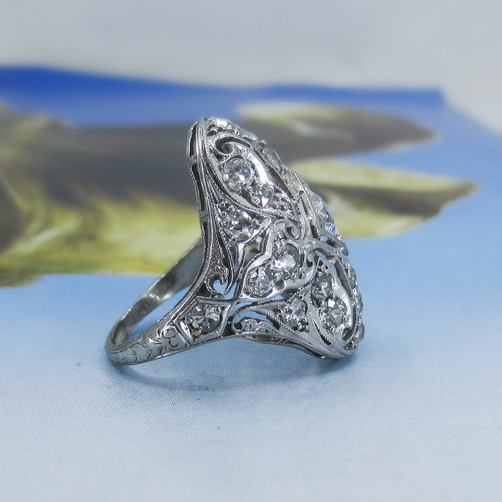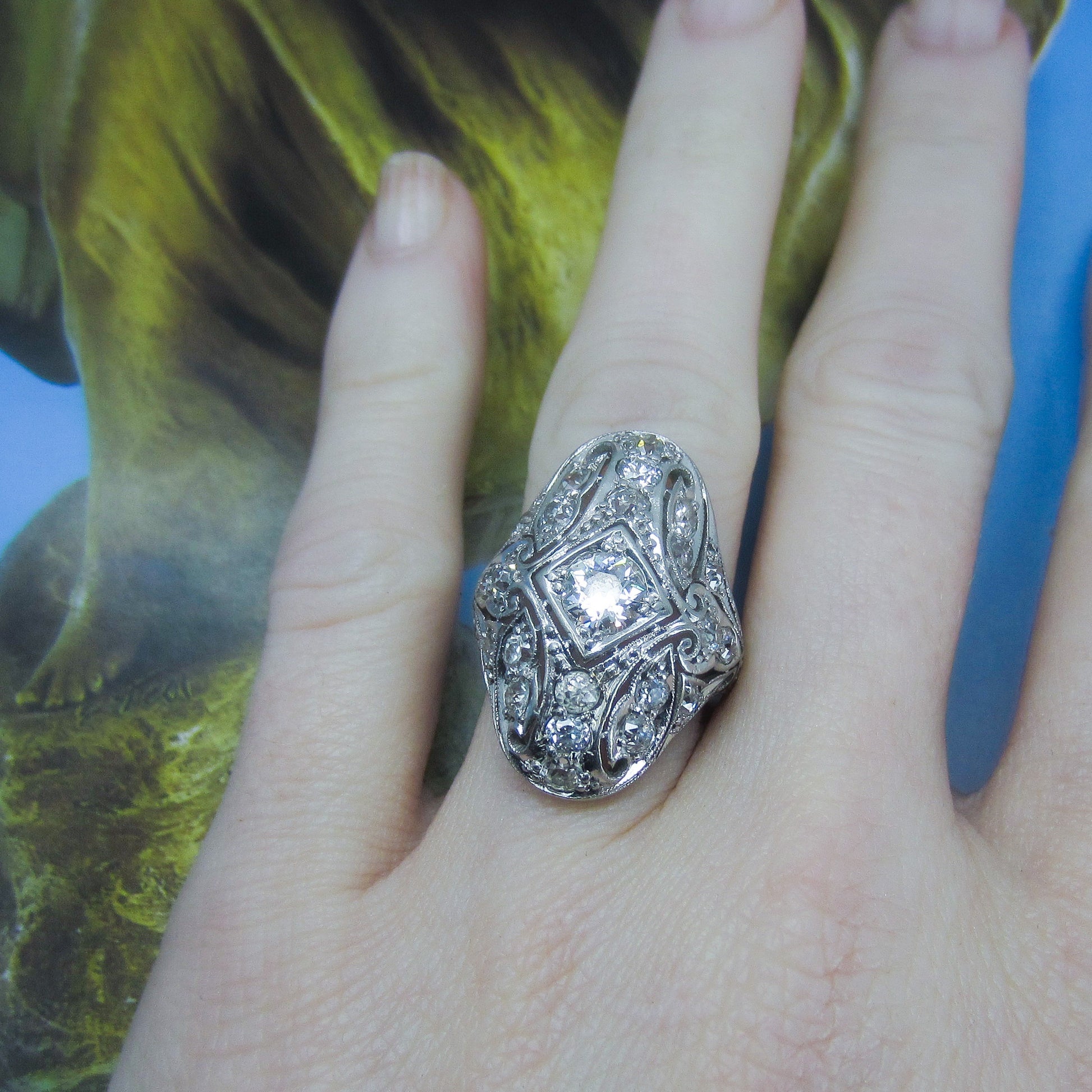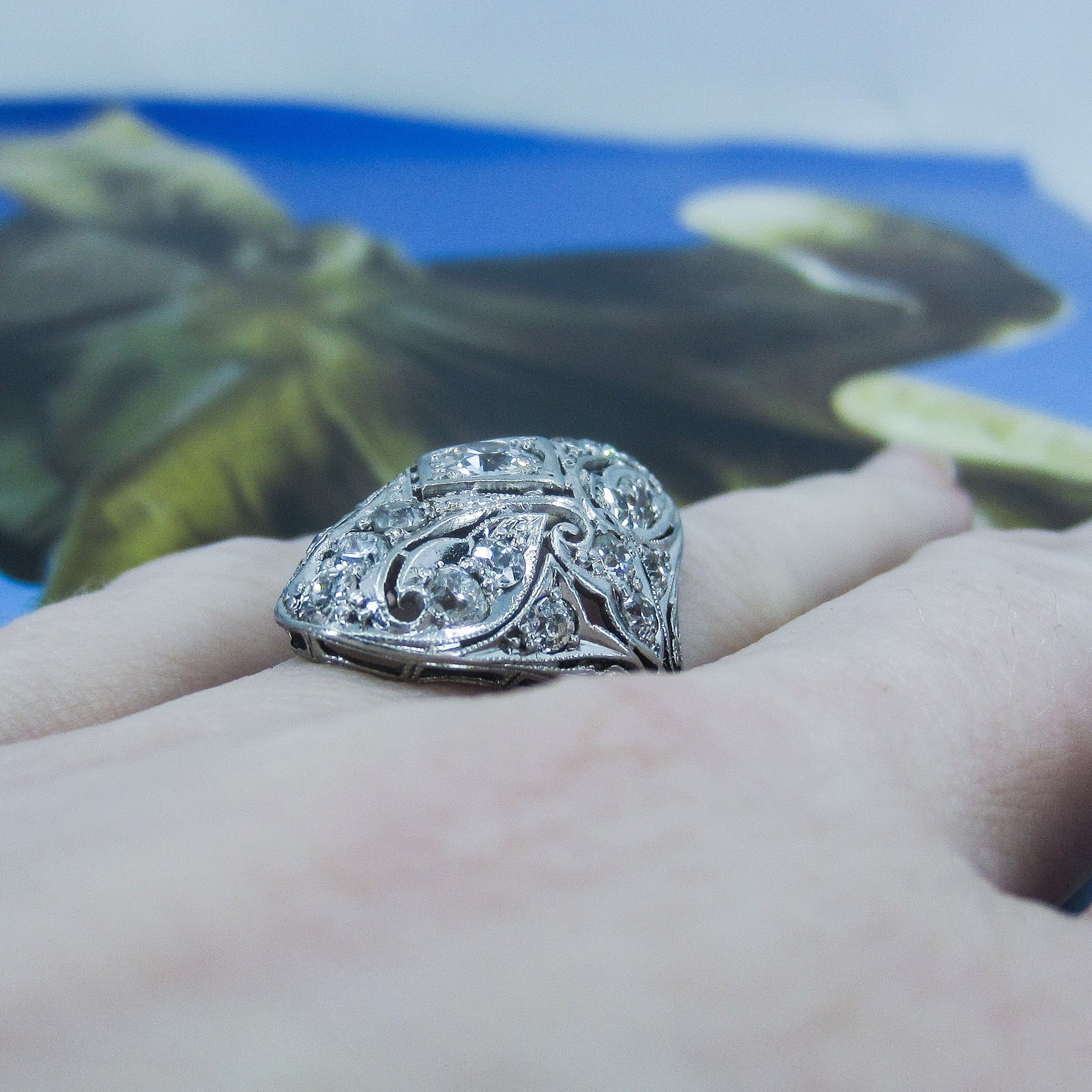 So there are Deco dinner rings and then there are DINNER RINGS. And this ring for sure falls in the latter category. It is absolutely gorgeous, in every way from every angle. Made in platinum circa 1930, this ring is a symphony of Old European Cut diamond encrusted openwork, making what could have been a chunky piece into a lacy dream. It is incredibly romantic and just truly, do they even make ANYTHING like this anymore? Could this be from any other time period than the Art Deco era? We are so lucky pieces like this still exist for us to see and touch and hold and wear. Sometimes it amazes me that these pieces make it to the current day and that is a testament to both their previous owners and their makers. If you haven't seen this one in person come into the store if you can, it will not disappoint! This ring would make the most spectacular alternative engagement ring!