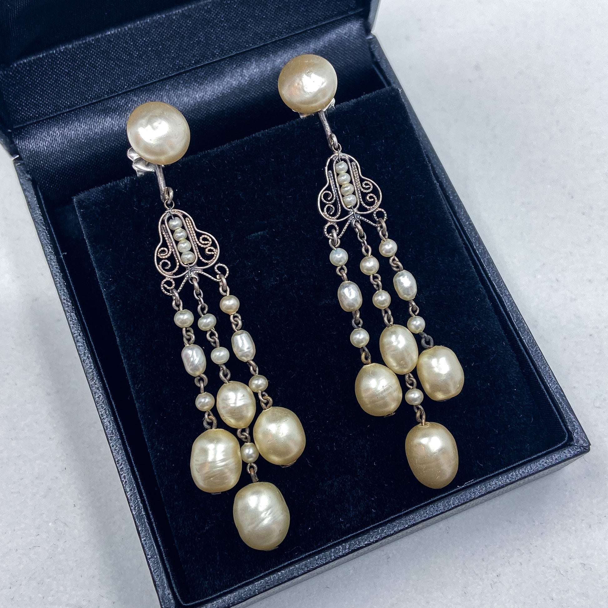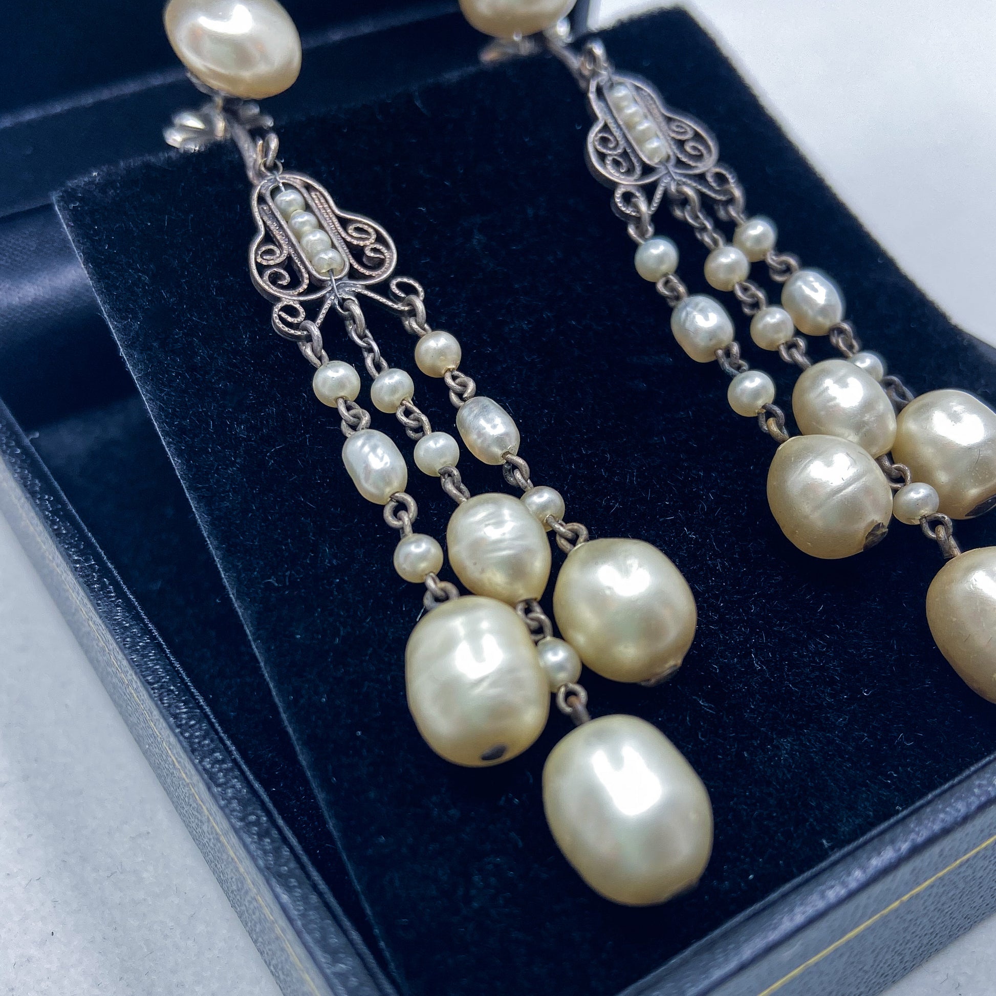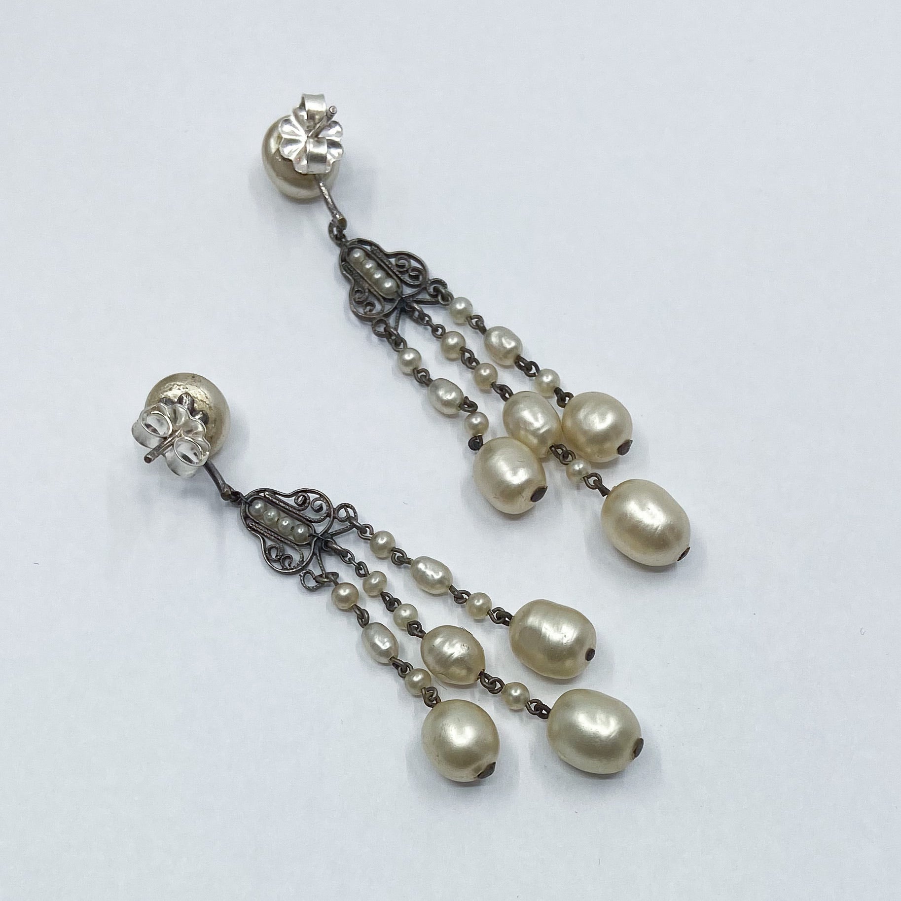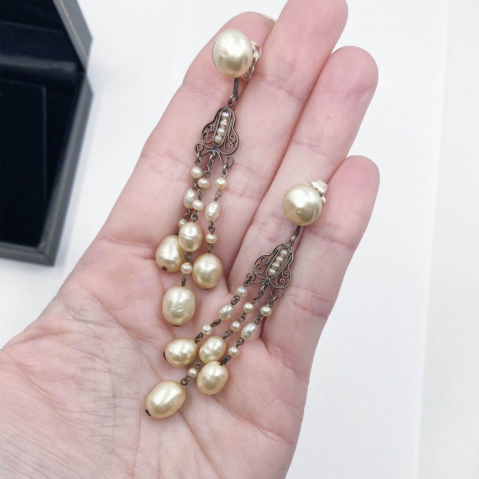 This is a pair of absolutely stunning Art Deco era faux pearl and filigree earrings, made of brass and already converted to sterling silver posts (they would have originally been screw back). They boast a dramatic length of nearly 2 7/8 and would make AMAZING wedding earrings!