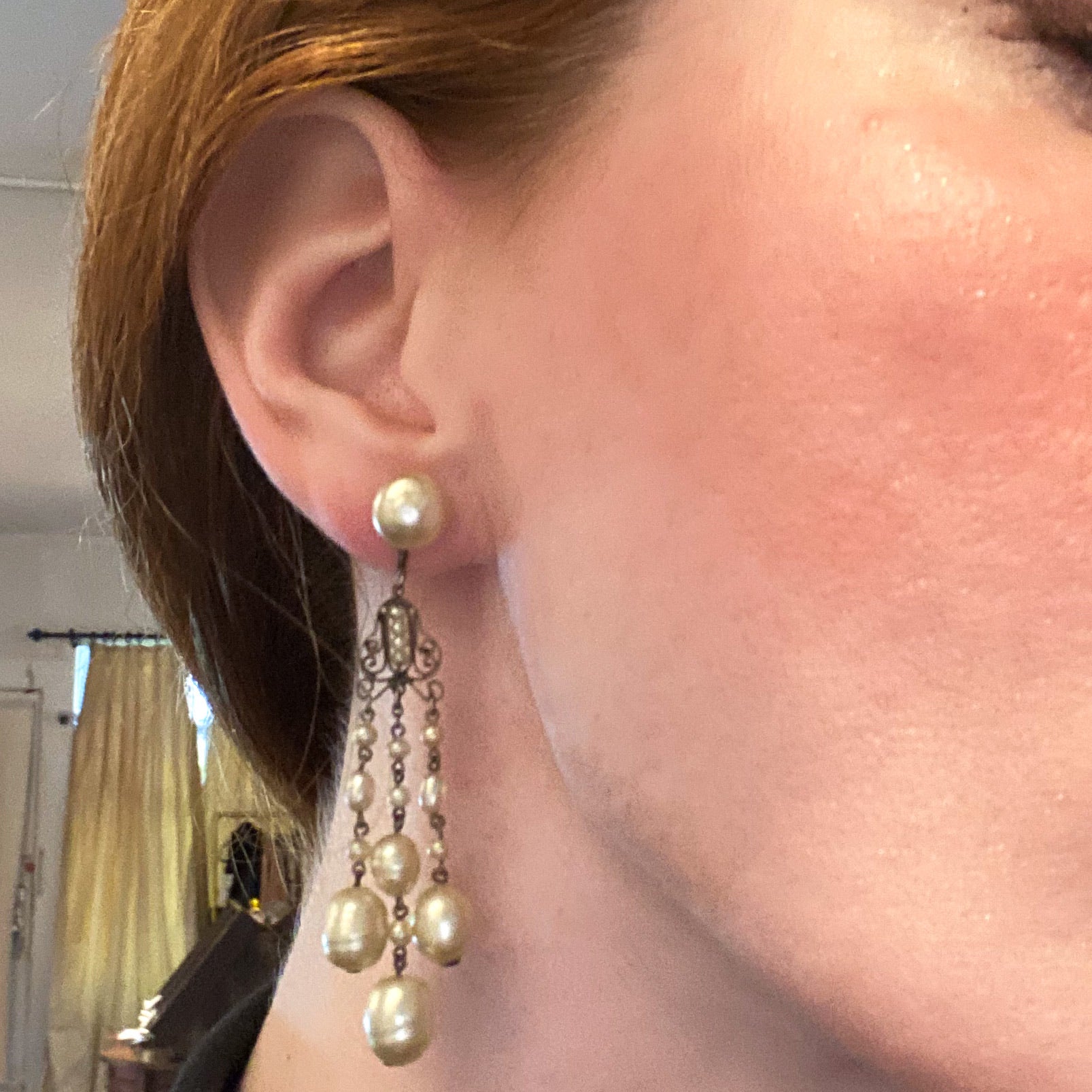 SOLD--Art Deco Long Faux Pearl Chandelier Earring Brass/Sterling c. 1930