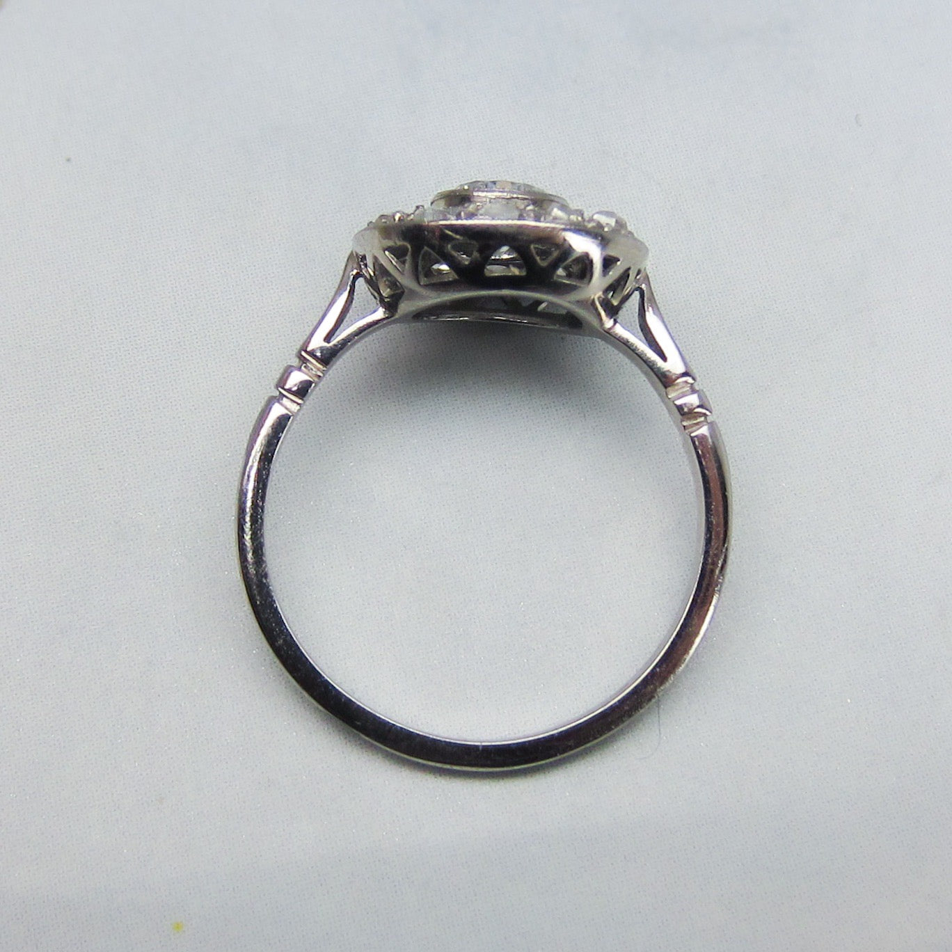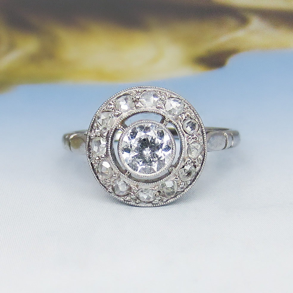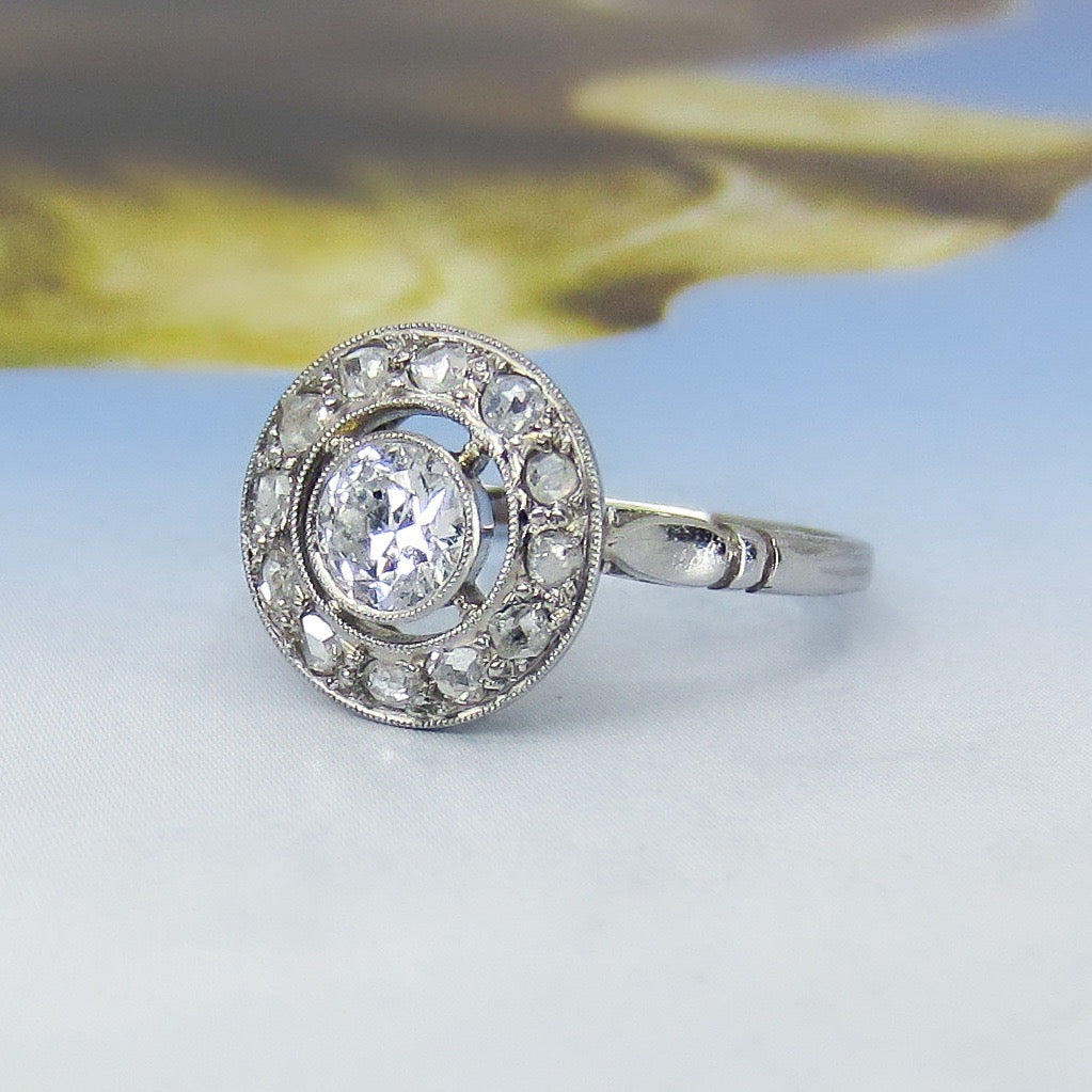 A super special ring, French made which we know means top quality workmanship and design, and hailing from the 1930's. A bezel set central .41ct Old European Cut diamond sits within a frame of bead set Rose Cut Diamonds. Made in 18k white gold. Beautiful on the hand and sit lows.
