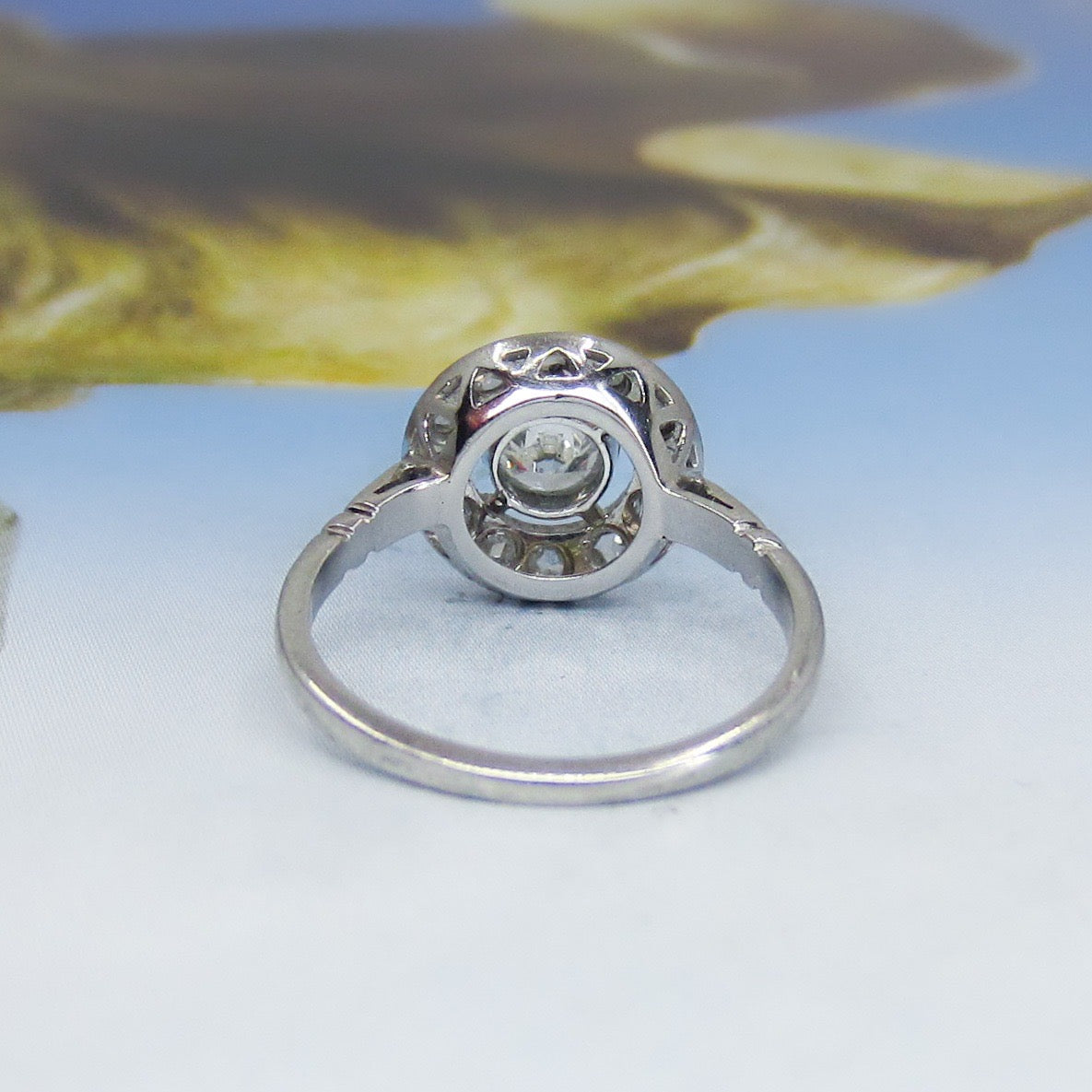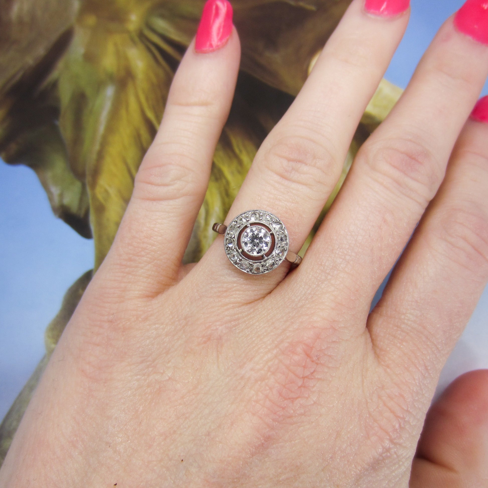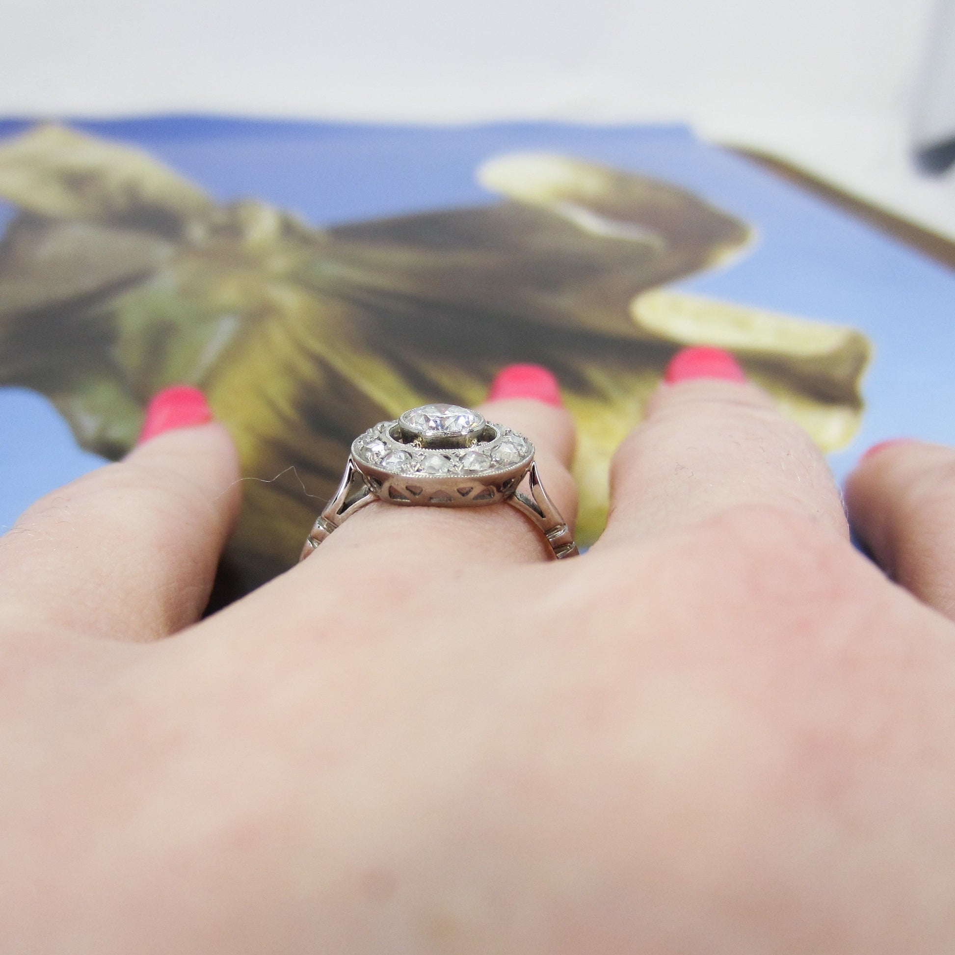 A super special ring, French made which we know means top quality workmanship and design, and hailing from the 1930's. A bezel set central .41ct Old European Cut diamond sits within a frame of bead set Rose Cut Diamonds. Made in 18k white gold. Beautiful on the hand and sit lows.
