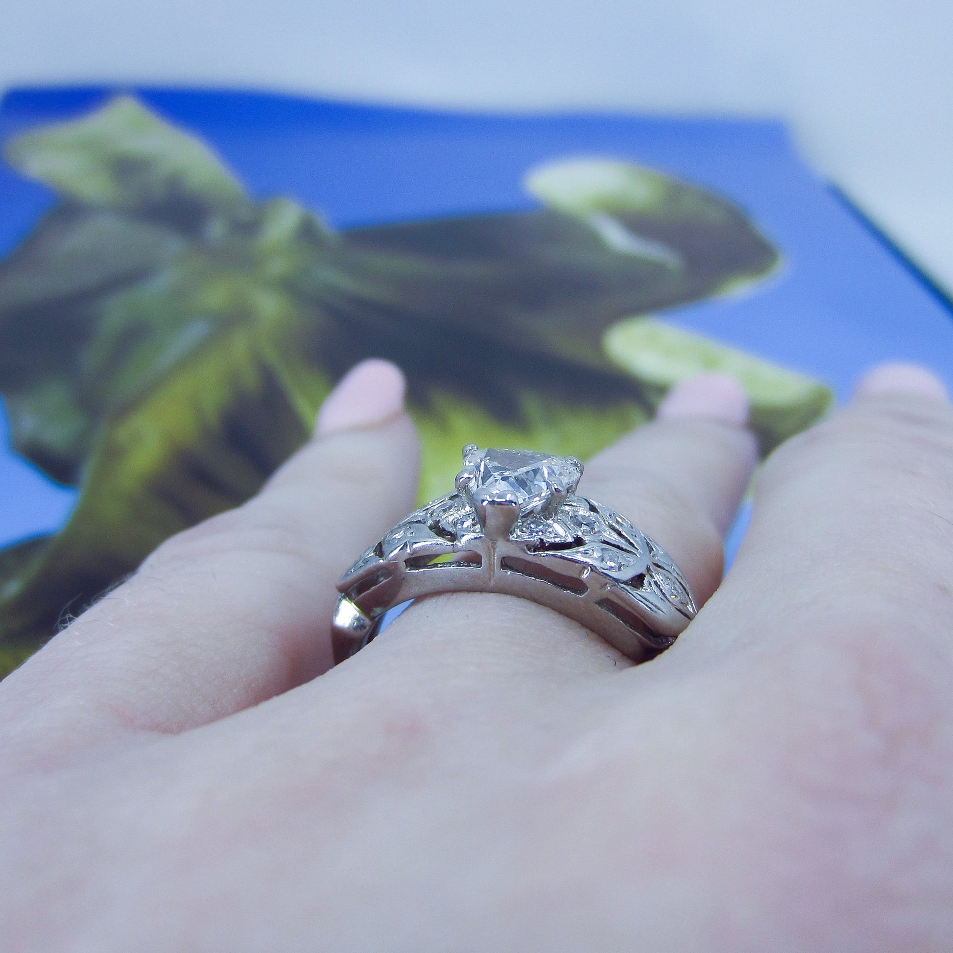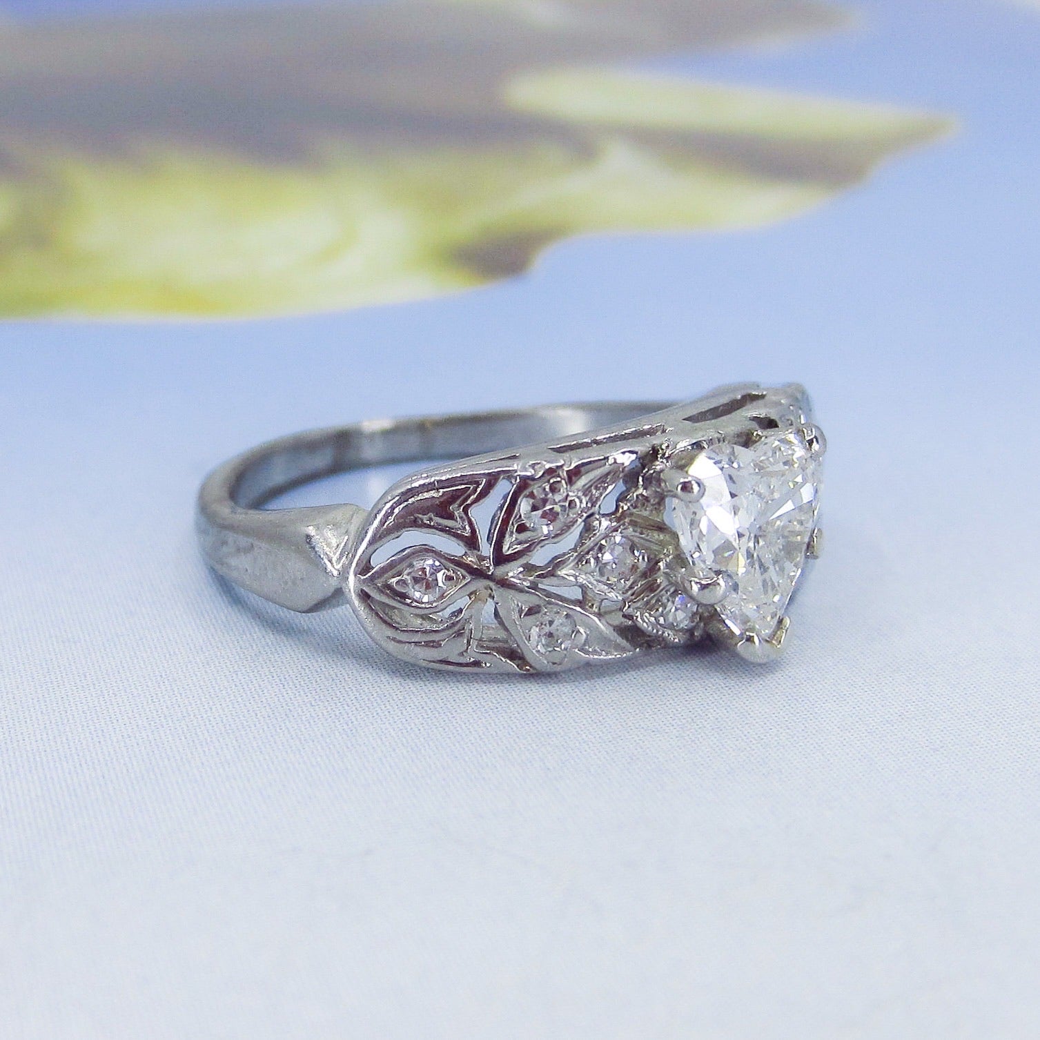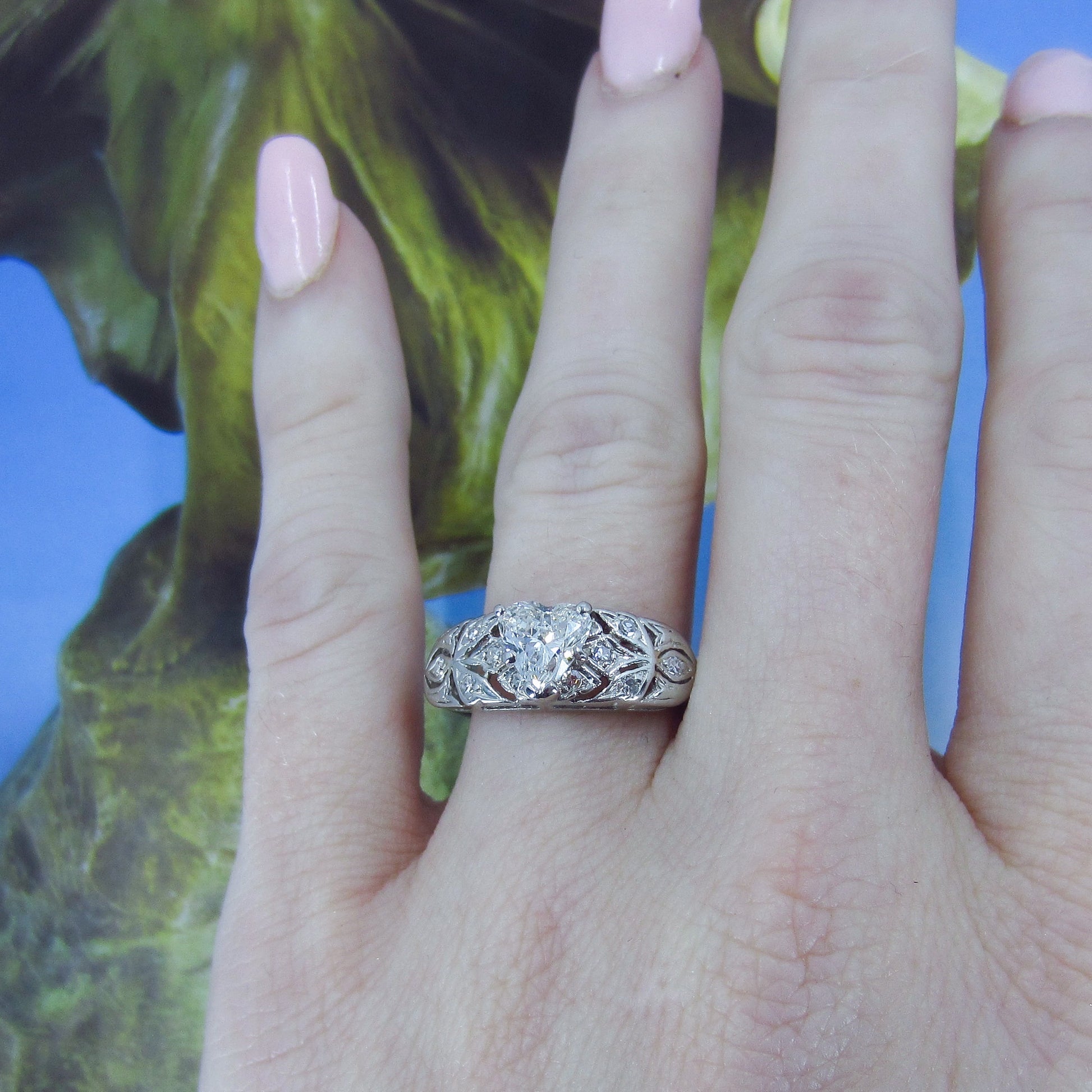 This is it folks, look at this beauty and yes, it has an ANTIQUE HEART CUT DIAMOND!!!! Made cIrca 1940, this special ring features a spectacular .80ct heart-shaped natural diamond with a big ole culet and pillowy crown. These antique heart cuts are very hard to find and look like nothing else! Full of rainbowy sparkle, this heart cut is flanked by openwork leafy shoulders studded with single cut diamonds in platinum. This ring is just exquisite, it looks absolutely gorgeous on, would sit flush with a wedding band. It is nothing like you’ve ever seen!