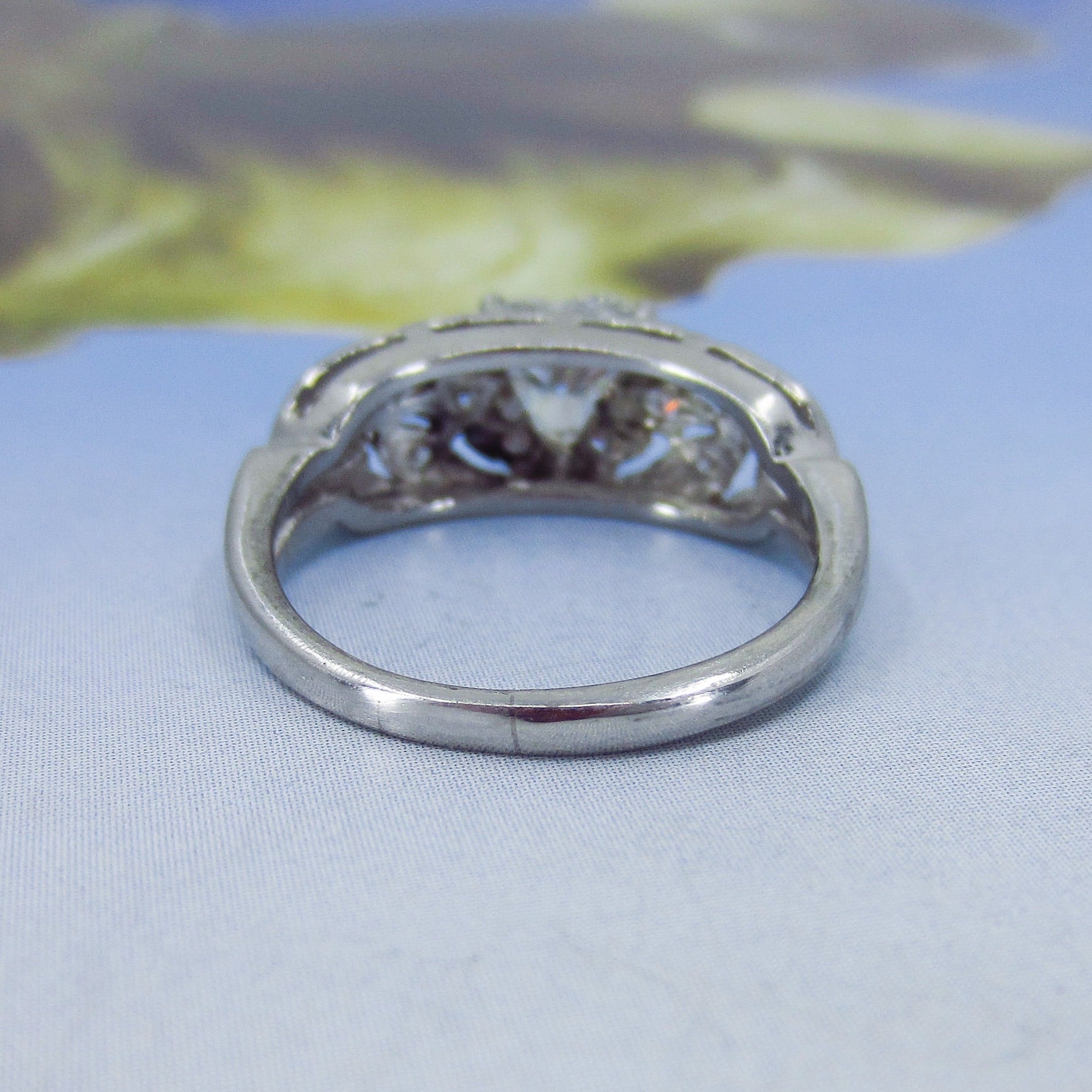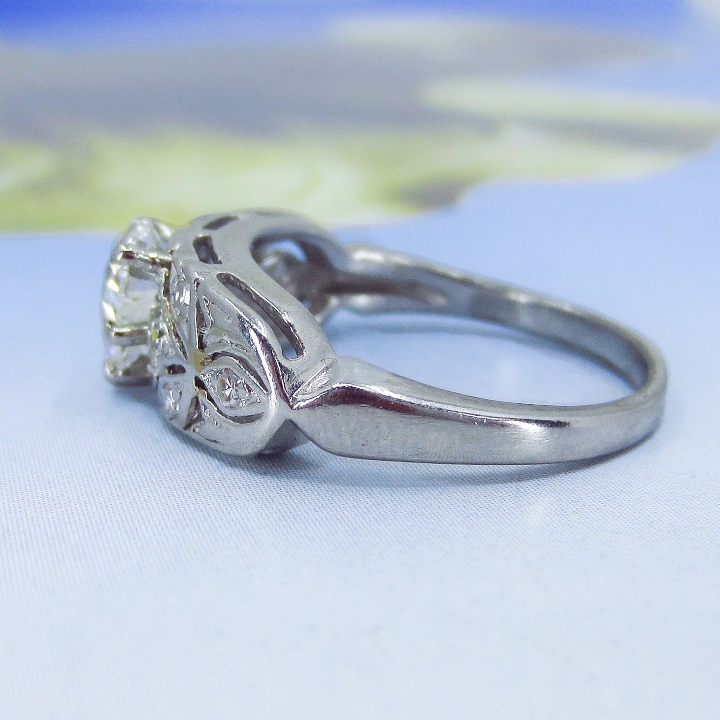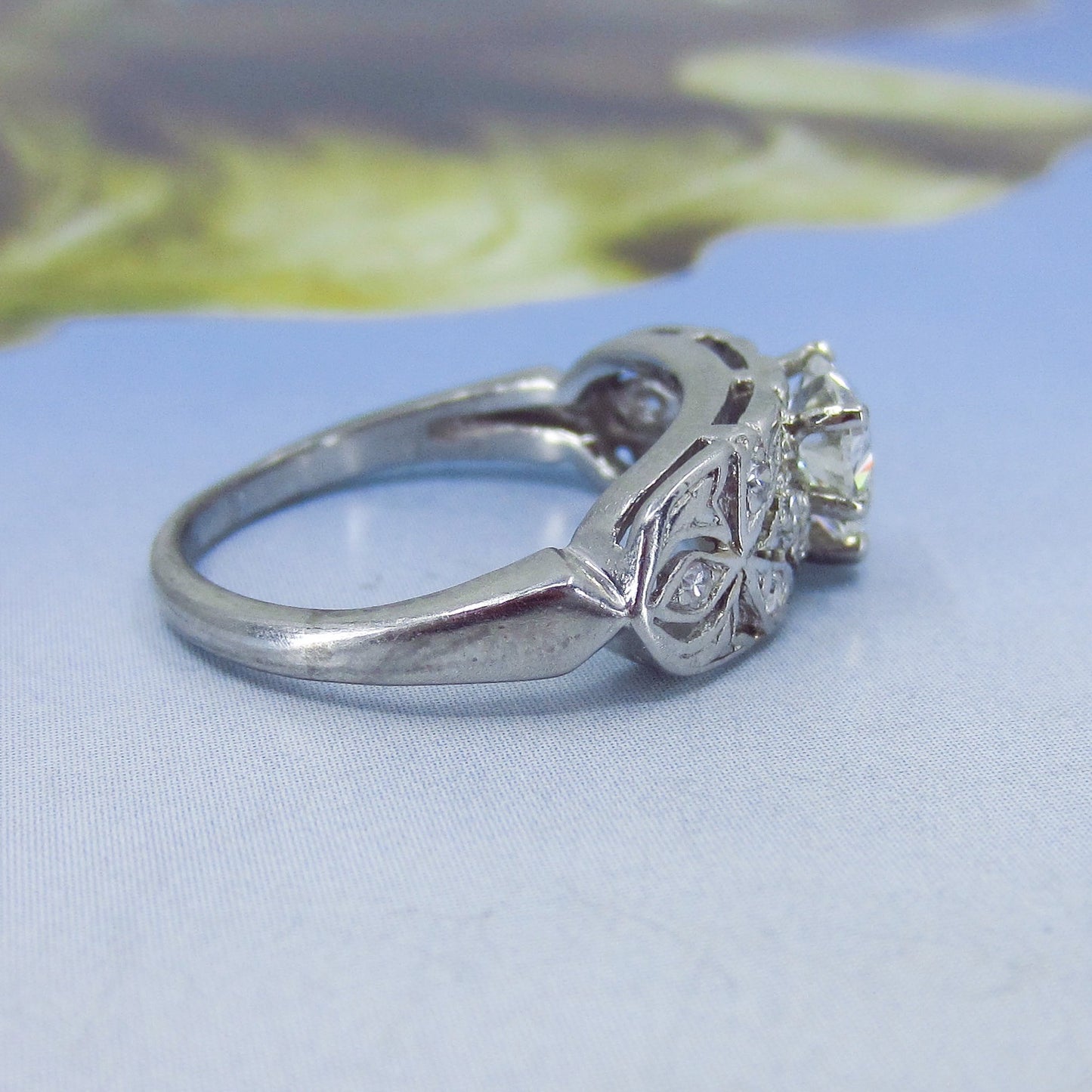 This is it folks, look at this beauty and yes, it has an ANTIQUE HEART CUT DIAMOND!!!! Made cIrca 1940, this special ring features a spectacular .80ct heart-shaped natural diamond with a big ole culet and pillowy crown. These antique heart cuts are very hard to find and look like nothing else! Full of rainbowy sparkle, this heart cut is flanked by openwork leafy shoulders studded with single cut diamonds in platinum. This ring is just exquisite, it looks absolutely gorgeous on, would sit flush with a wedding band. It is nothing like you’ve ever seen!