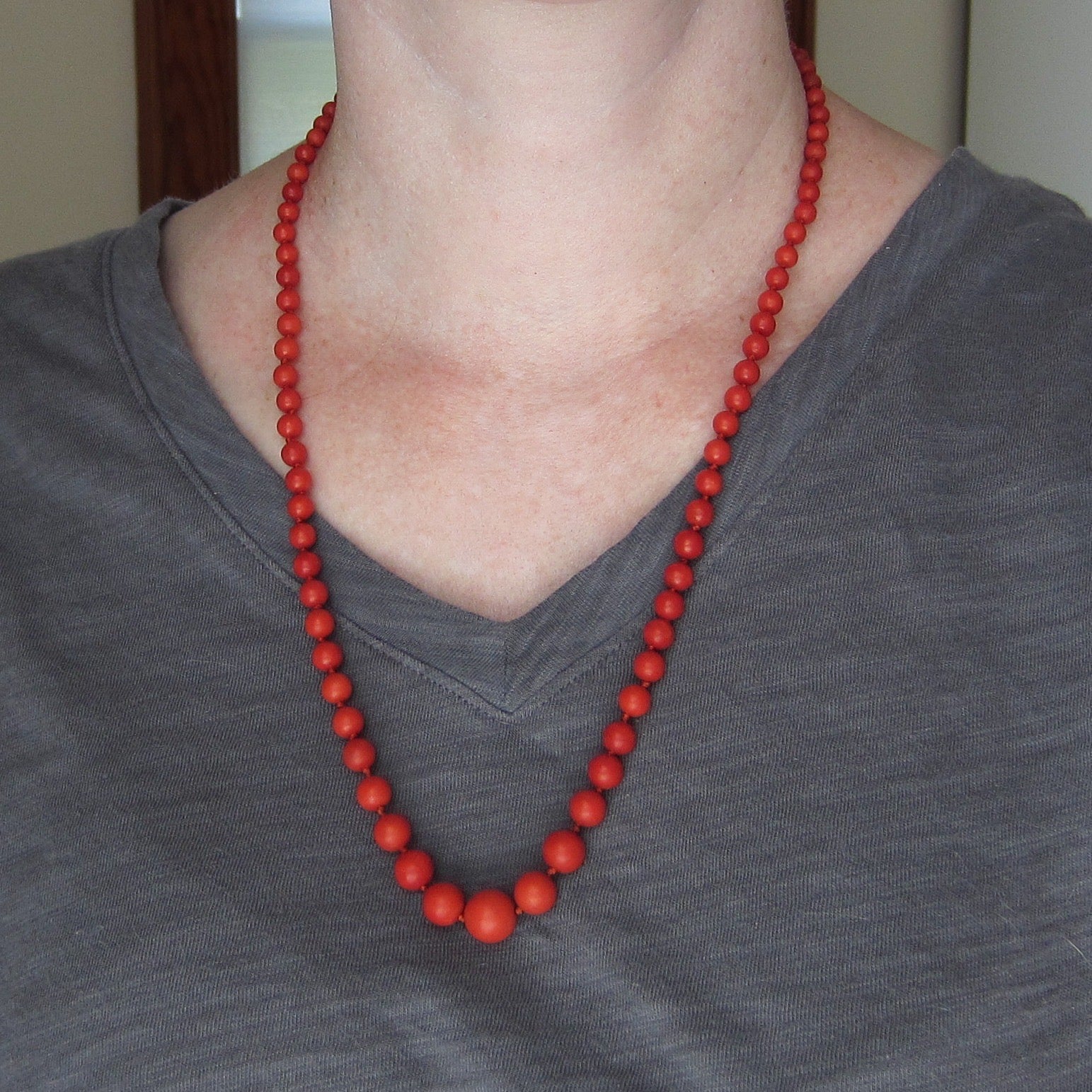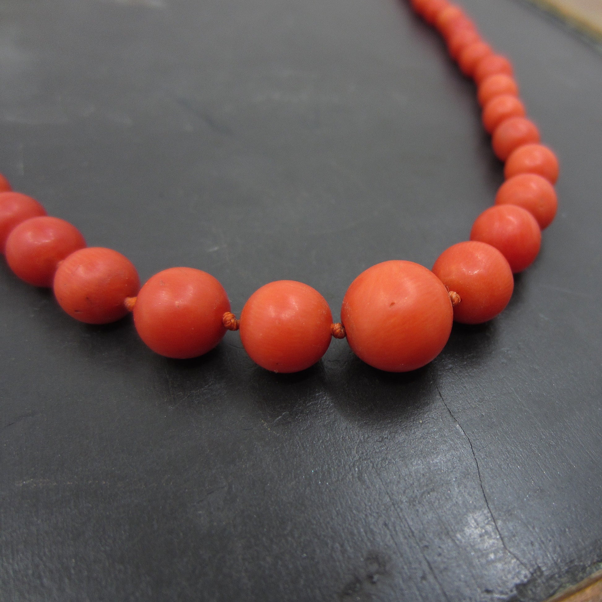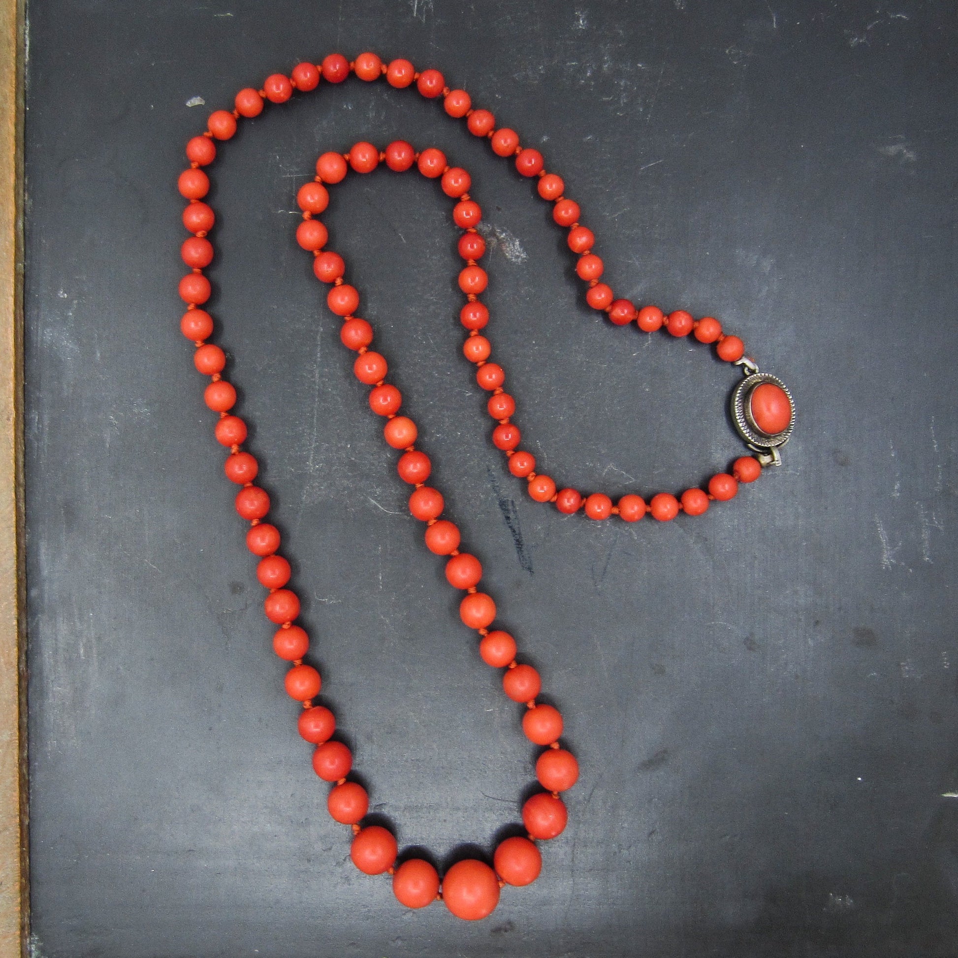 An Art Deco era necklace from Italy, featuring graduated natural coral beads, hand-knotted on silk with an 800 silver clasp. The color of this coral is absolutely beautiful! Circa 1920.
