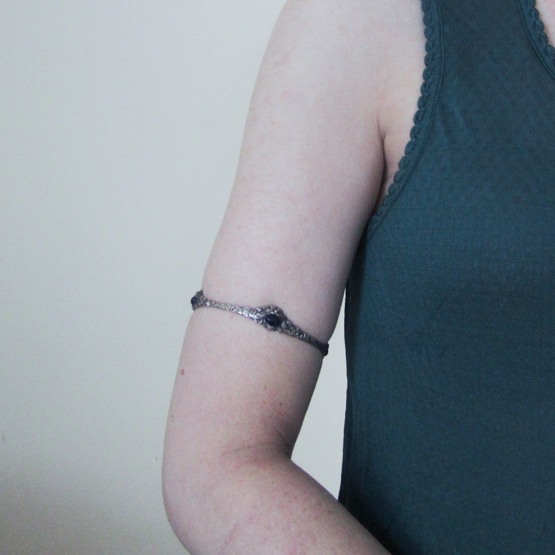 These antique armlets are getting harder and harder to find--some of you who visit the store may know that I often wear a Deco snake armlet and I love having one! Made circa 1920, this piece is either a large bangle bracelet to be worn up at the top of the forearm or if you have a thinner arm, an armlet made to be worn above the elbow. Four intricately designed lions heads hold a vibrant lapis lazuli cabochon in their mouths. This piece is very much in the Italian style of the day but there are no markings. A special, unusual piece--please see the measurements below to see if it will fit you!