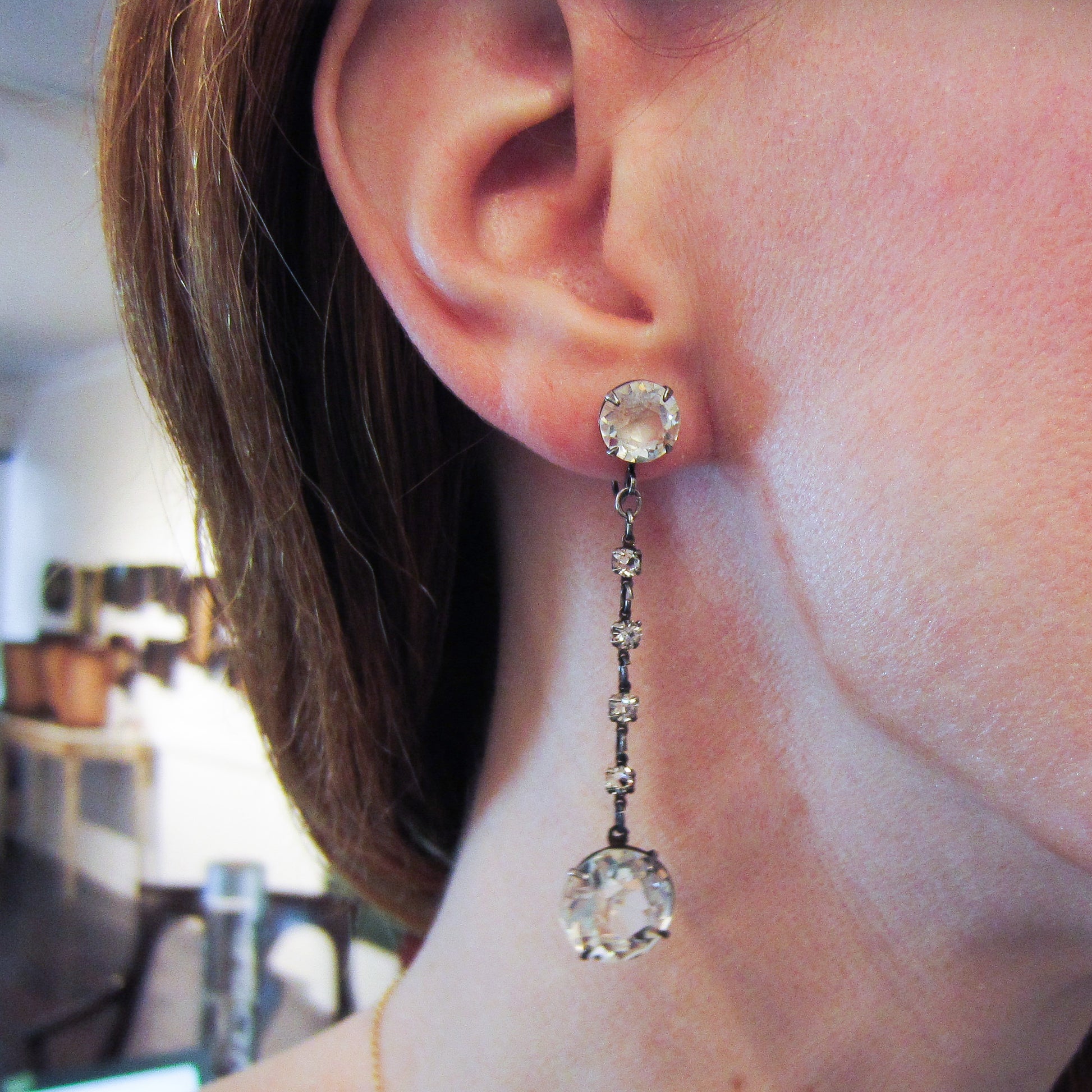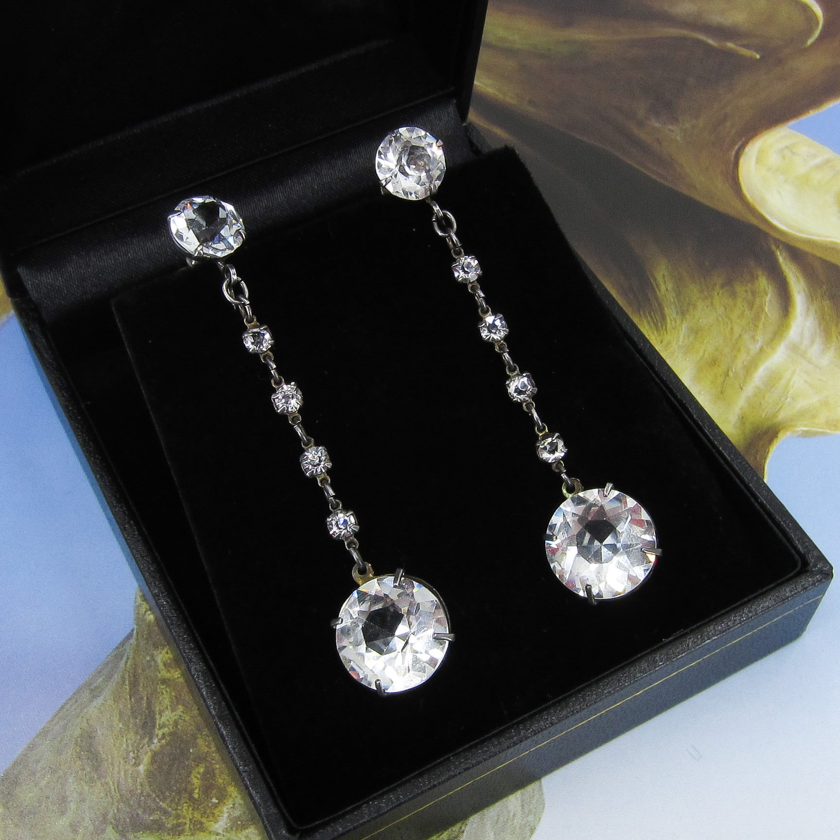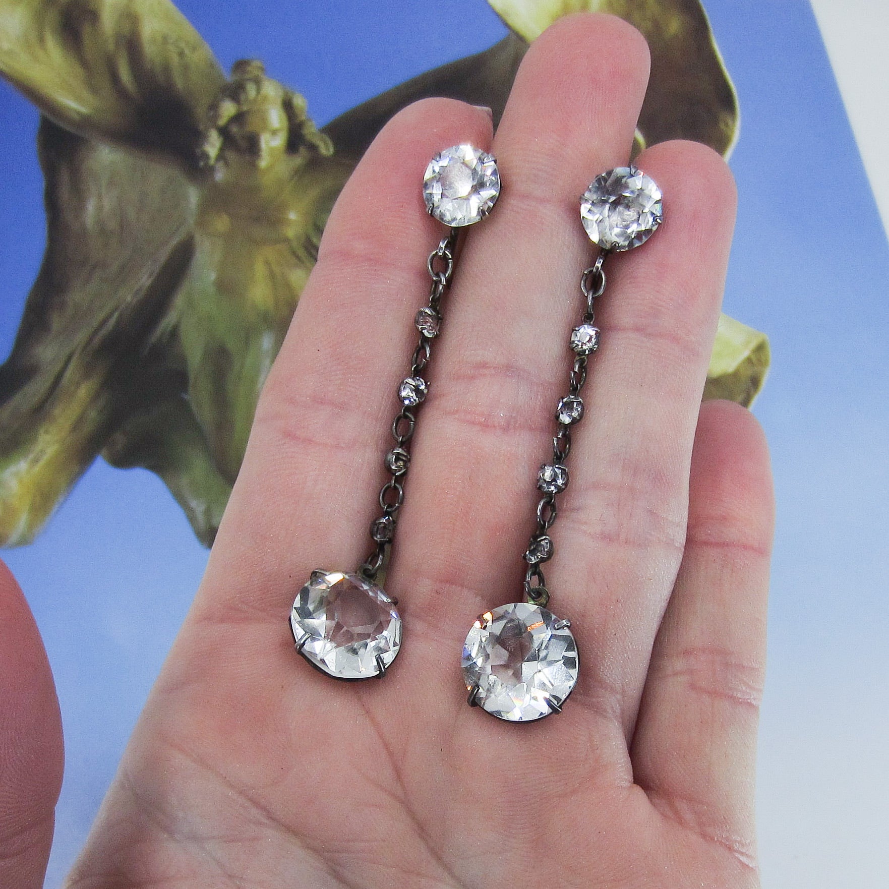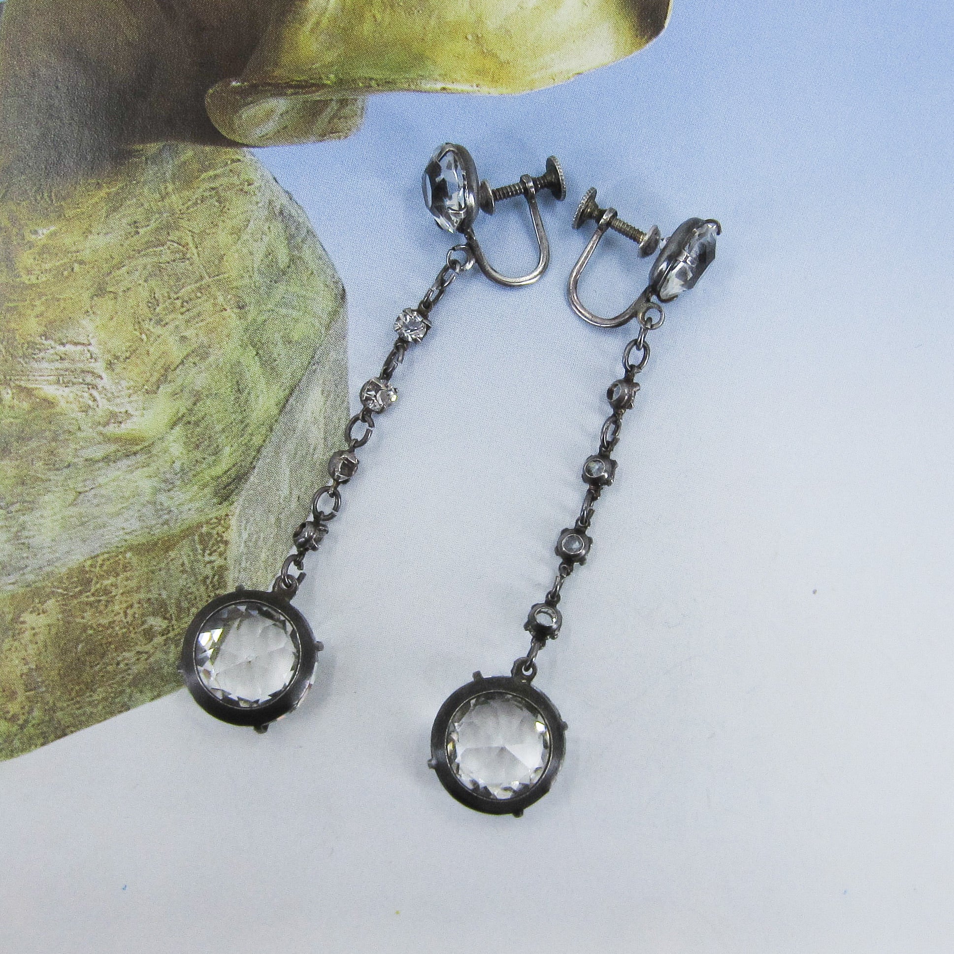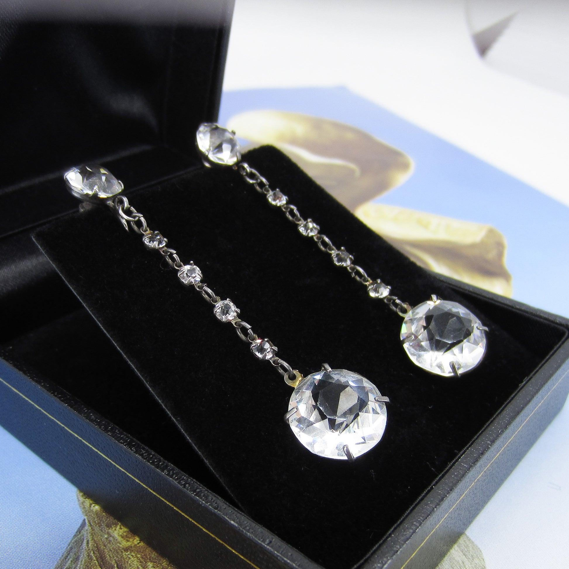 This beautiful pair of earrings was made in the Art Deco period circa 1930 and consist of open-backed old cut crystals set in sterling silver. These are some serious party earrings! They are very long and boy do they sparkle, with the crystal drops twirling and swinging and capturing the light. These would also make fantastic wedding earrings!