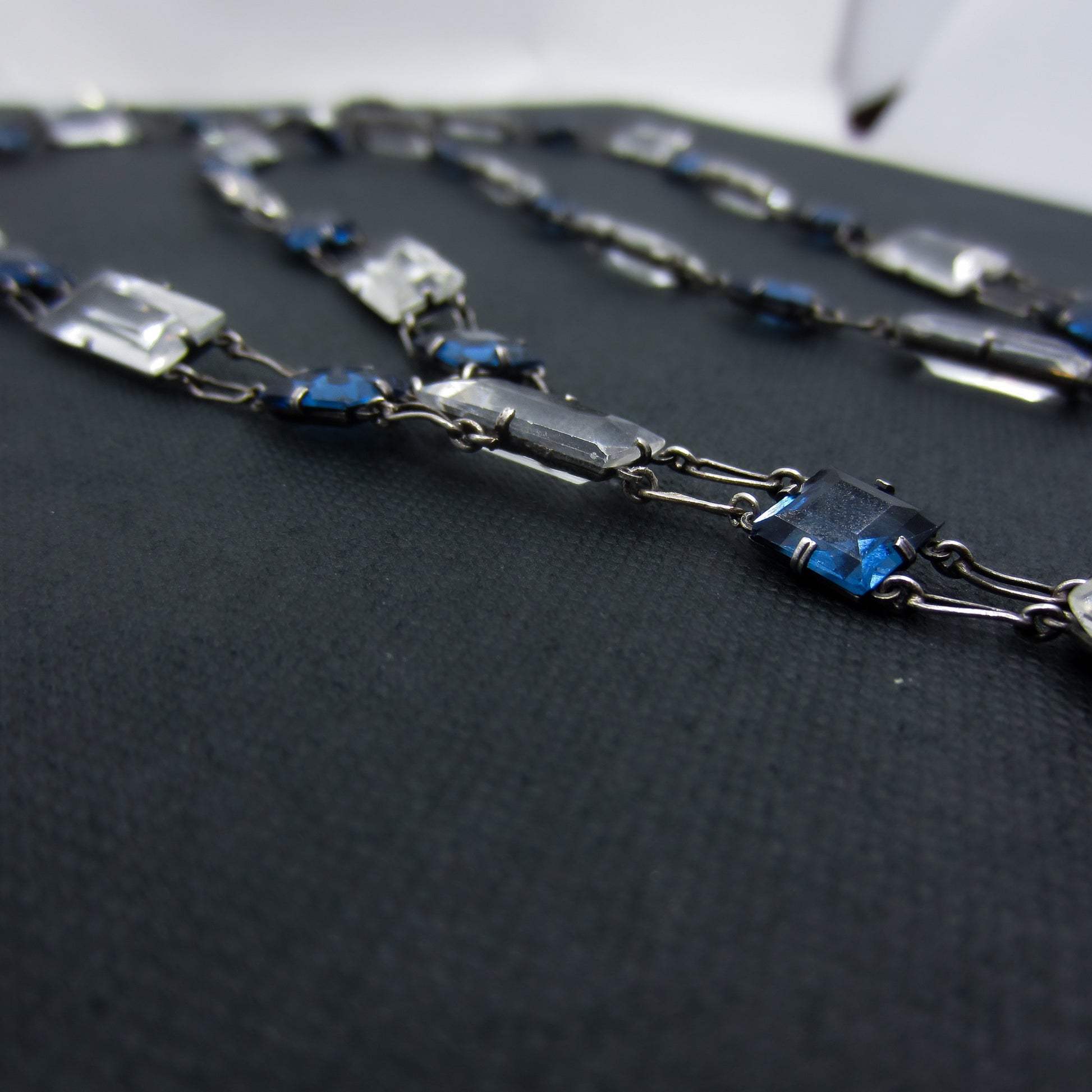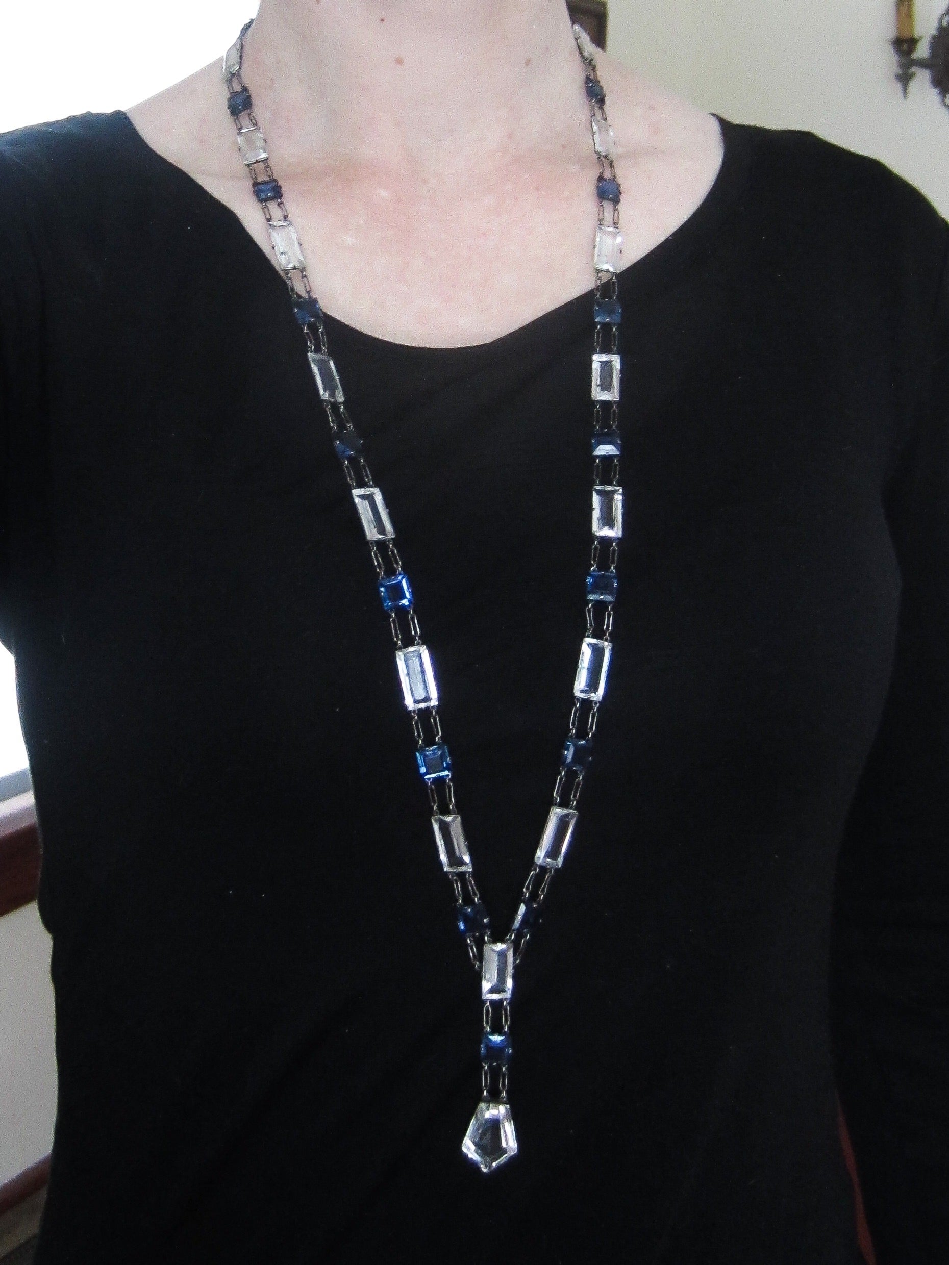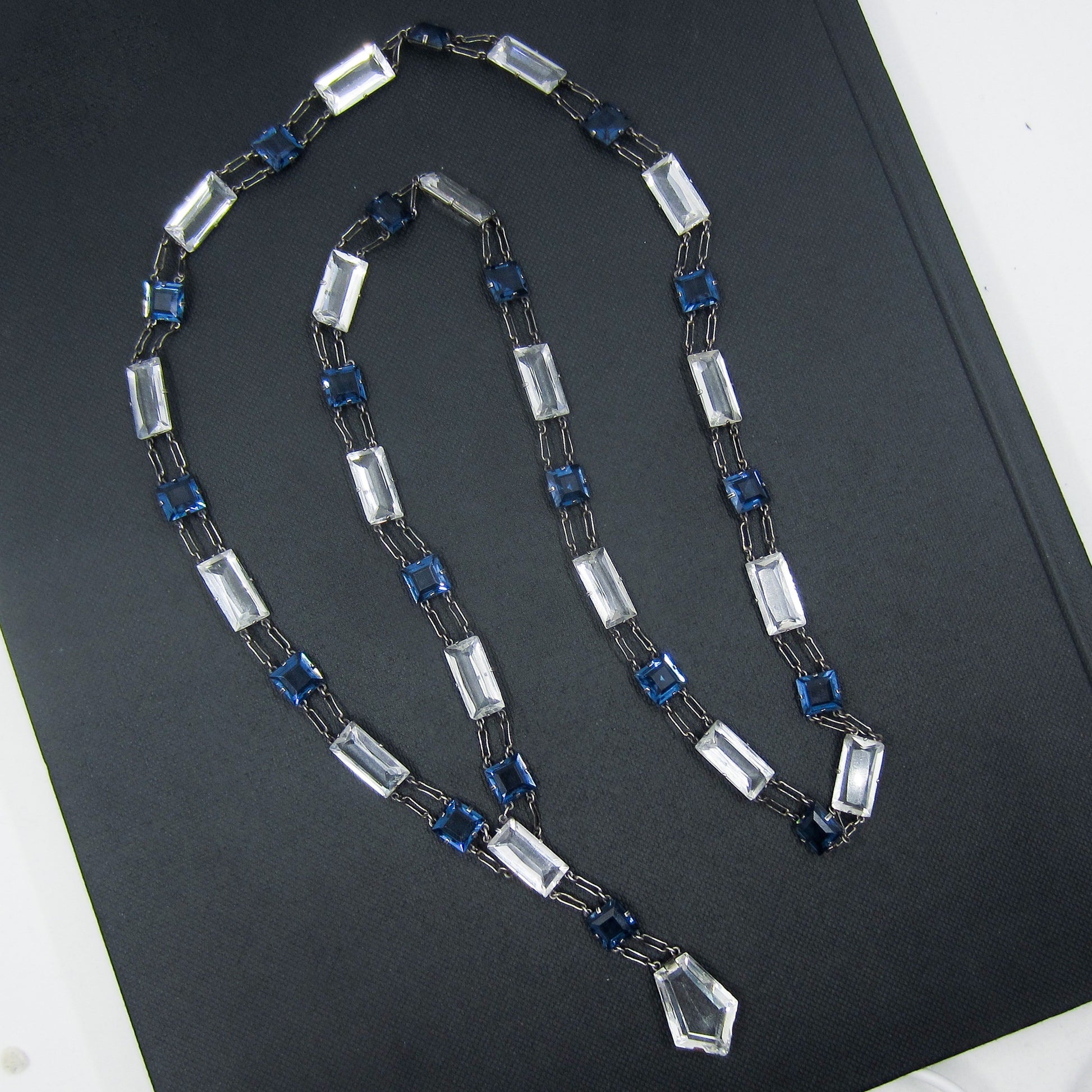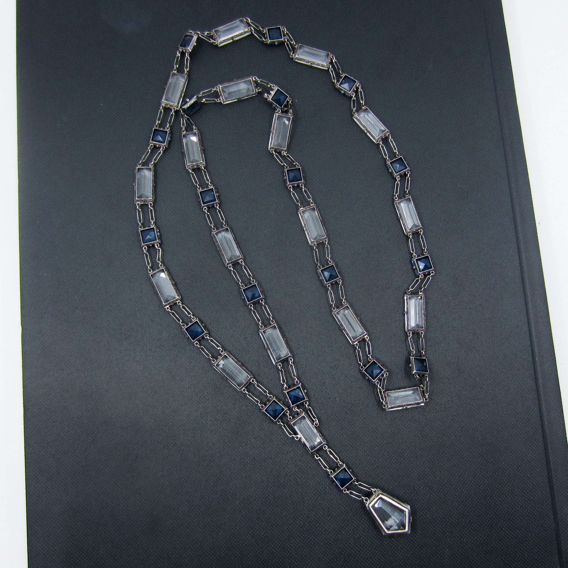 This quintessential Art Deco necklace was designed with rectangular and square cut pastes, meant to imitate diamonds and sapphires, set in sterling silver engraved mounts with a nice sized clear shield shape paste as a drop. This piece was purposely made without a clasp so that it could be worn in the front, as pictured, or worn down the back for an ultra glamorous look. Whichever direction you wear it you are going to feel like the most fabulous Deco lady headed out for a night at the speakeasies under the glittering city lights!
