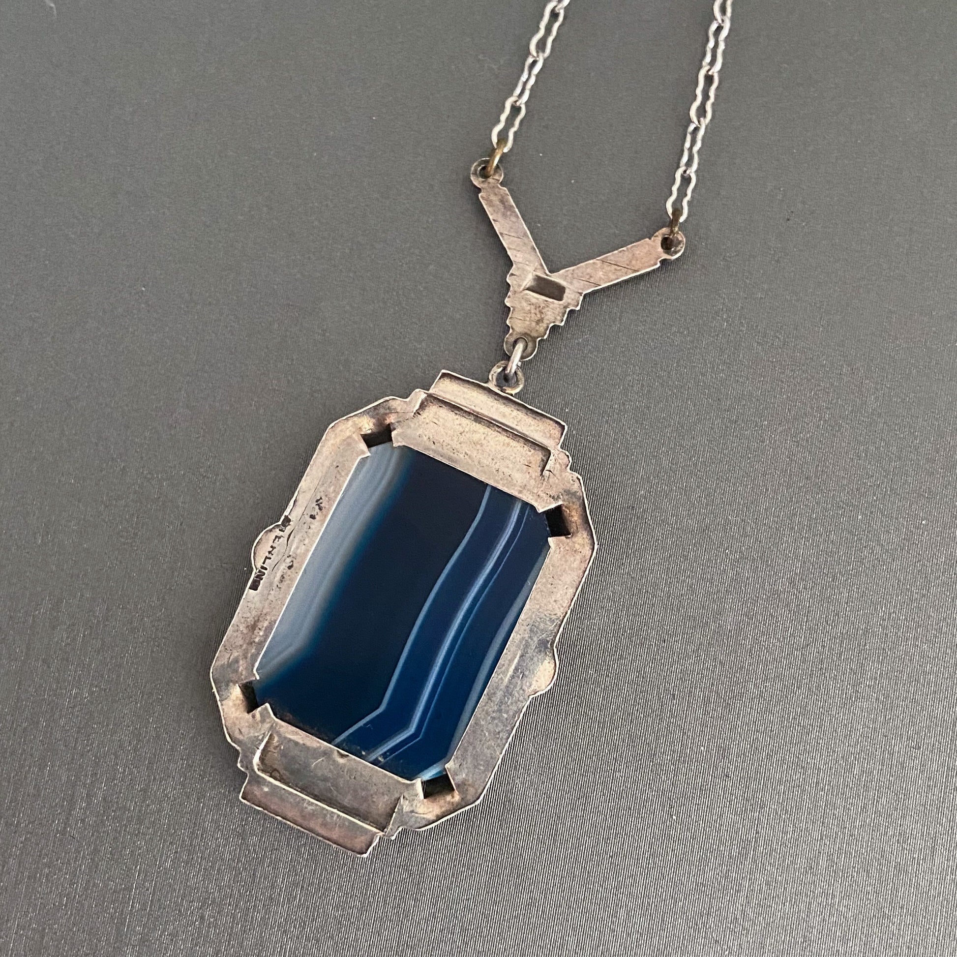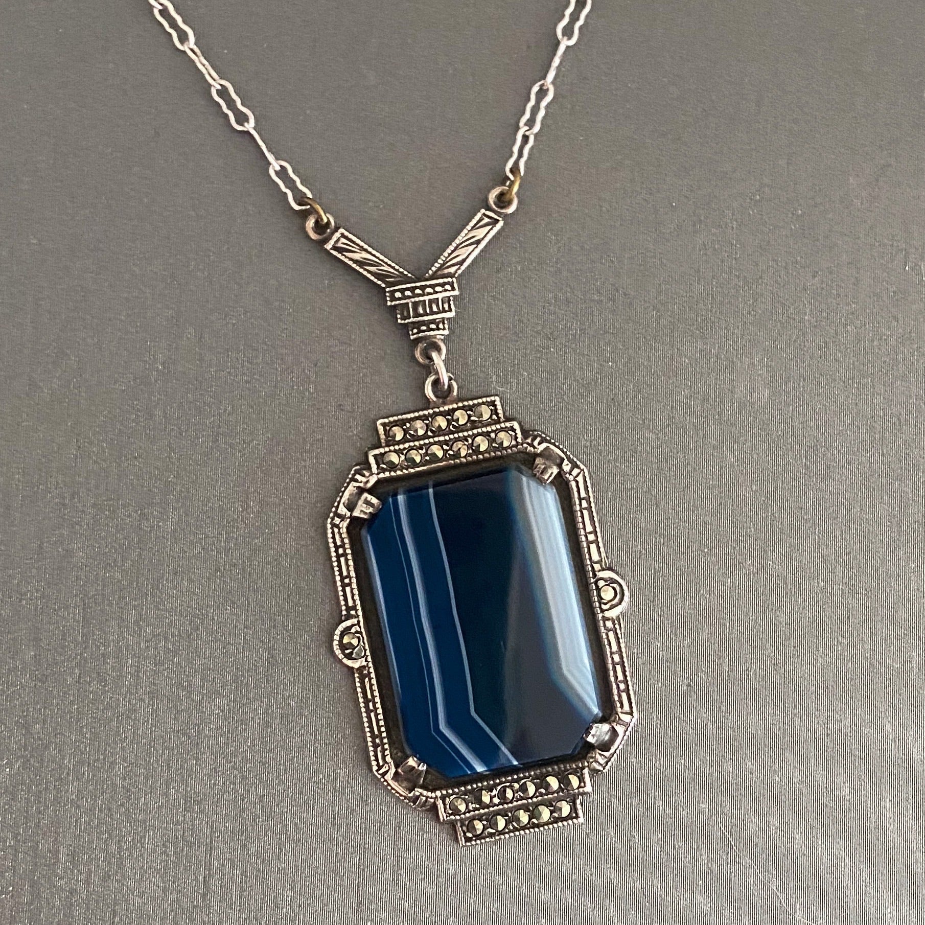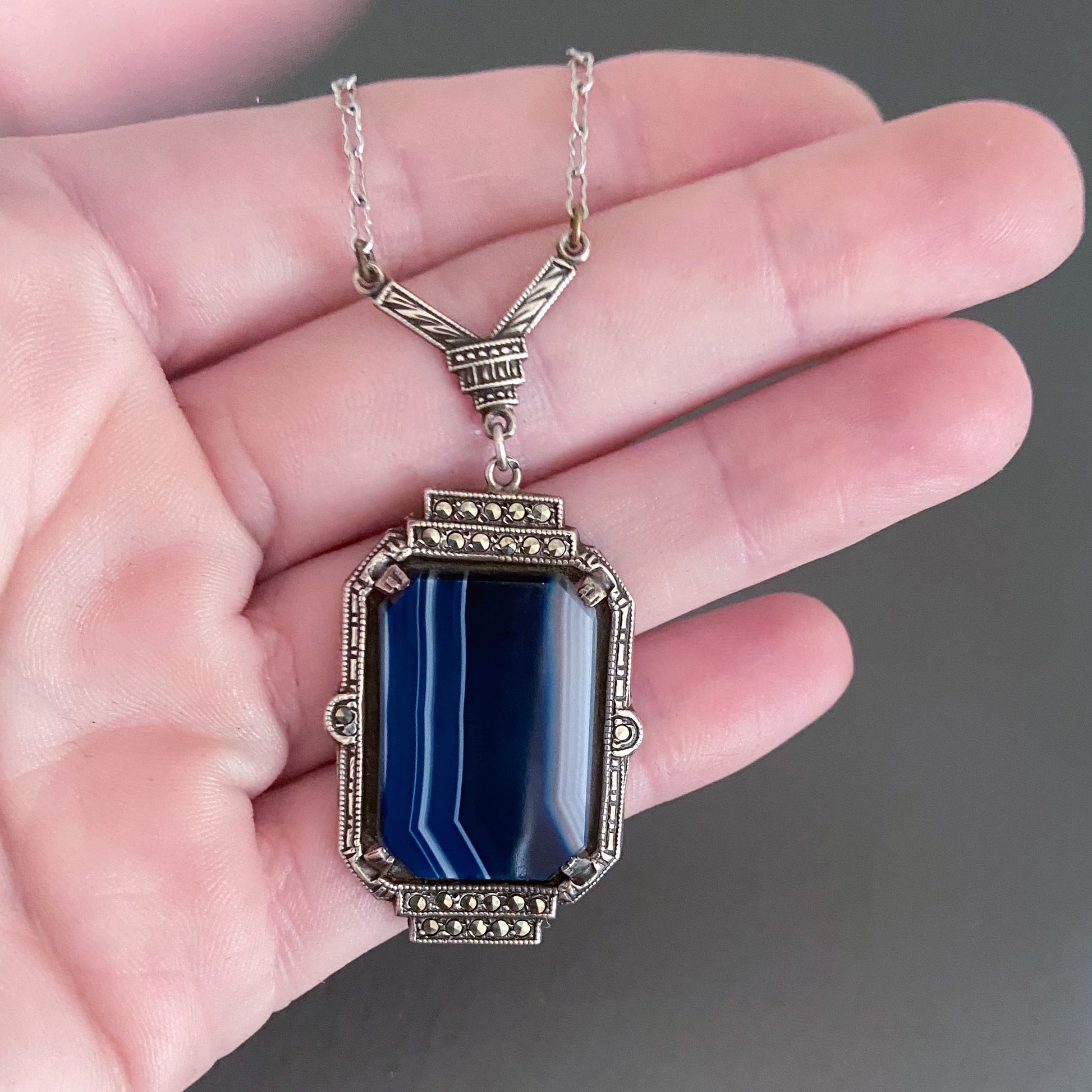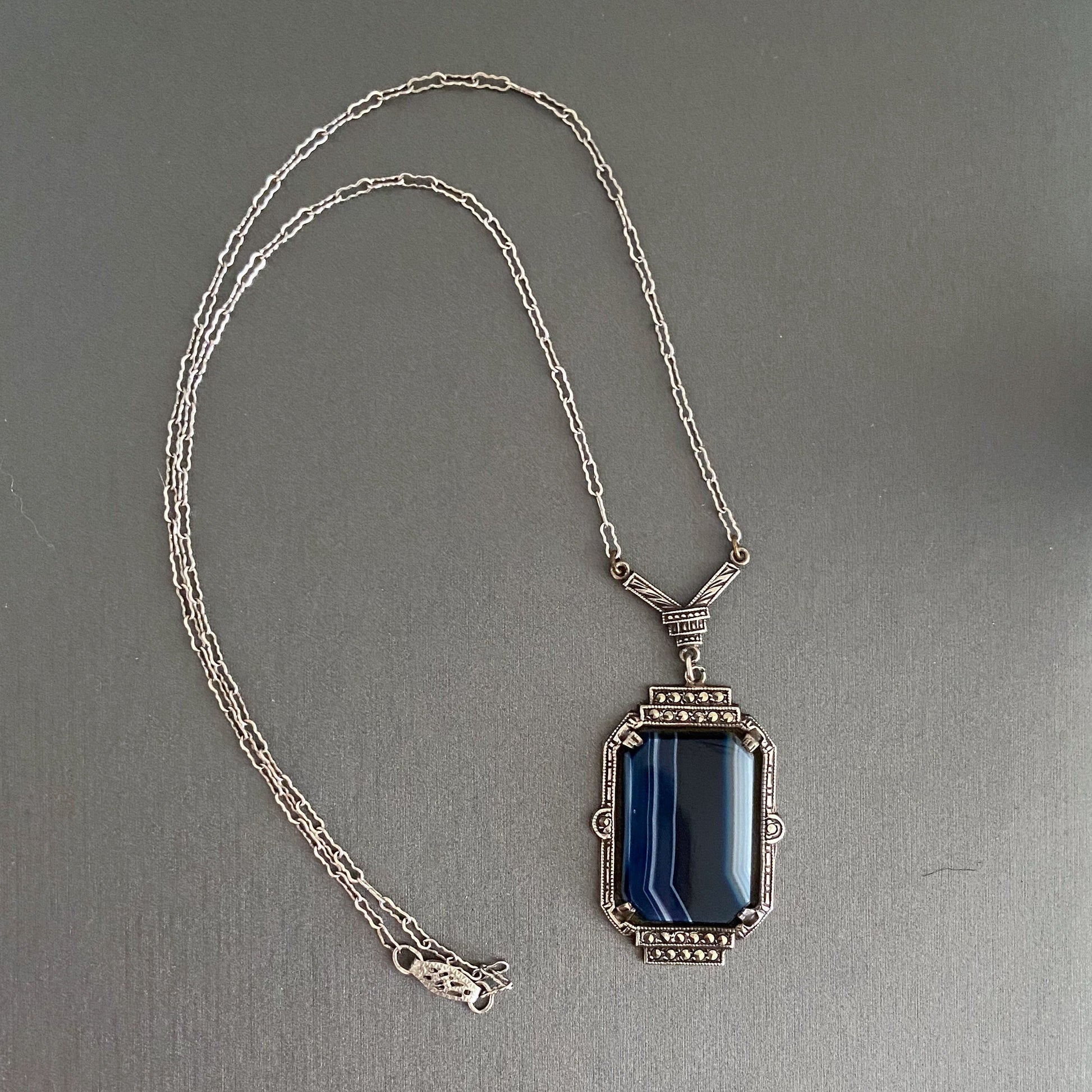 Beautiful and wearable 1930’s Art Deco necklace, made in sterling silver with a banded blue agate in a marcasite studded frame.