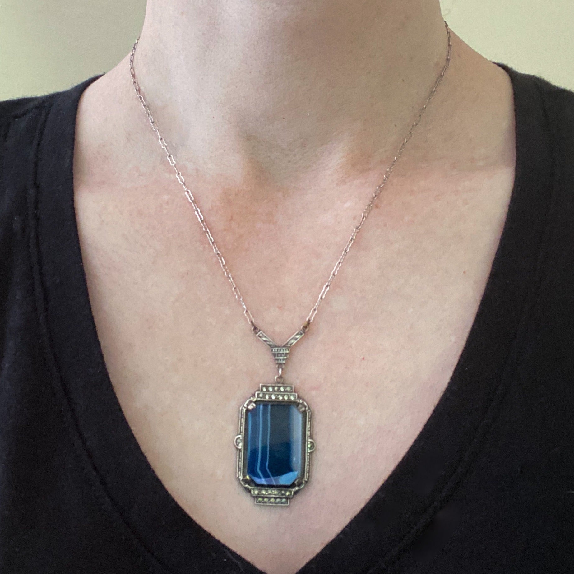SOLD--Art Deco Marcasite and Blue Agate Necklace Sterling c. 1930
