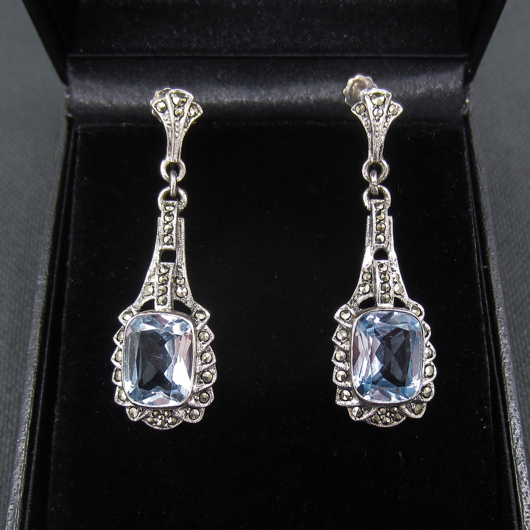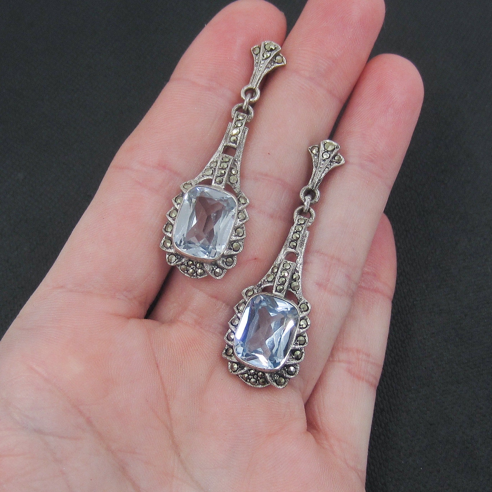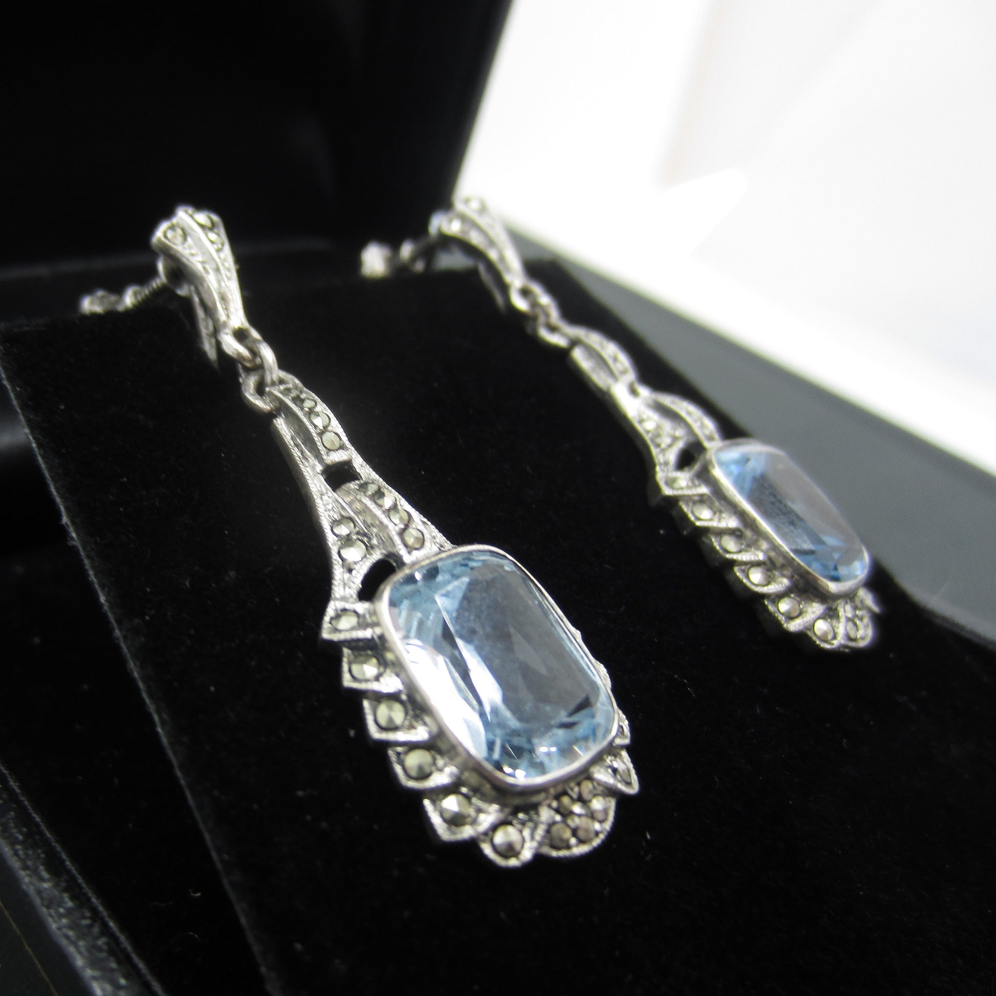 SOLD--Art Deco Marcasite and Synthetic Blue Spinel Drop Earrings Sterling c. 1930