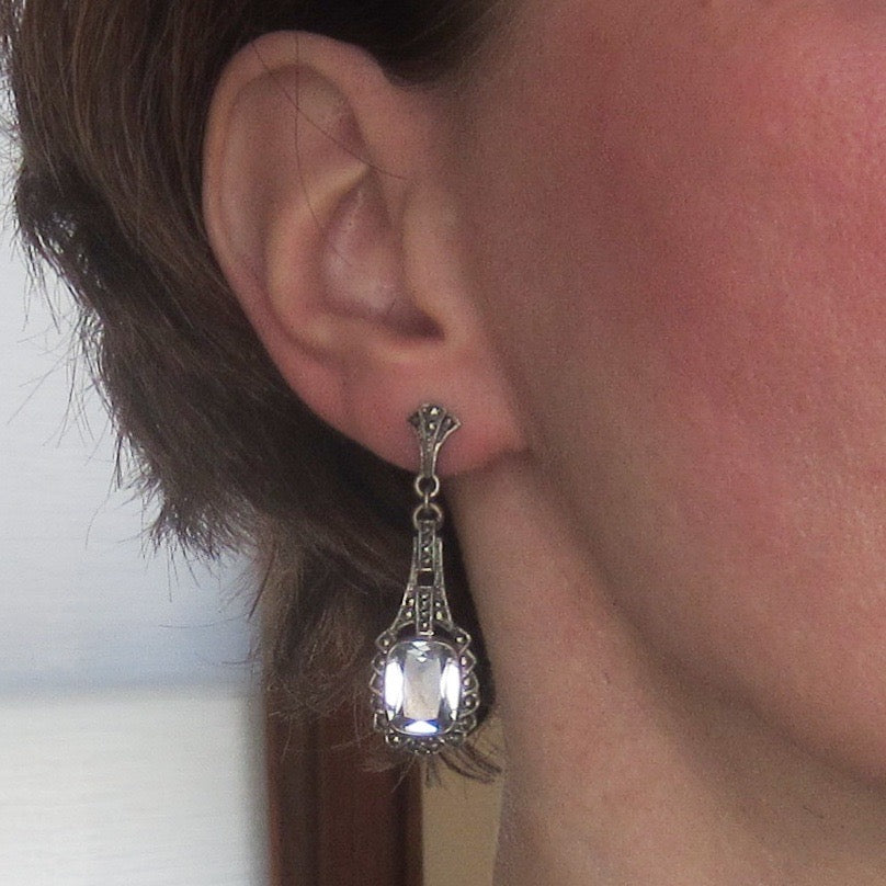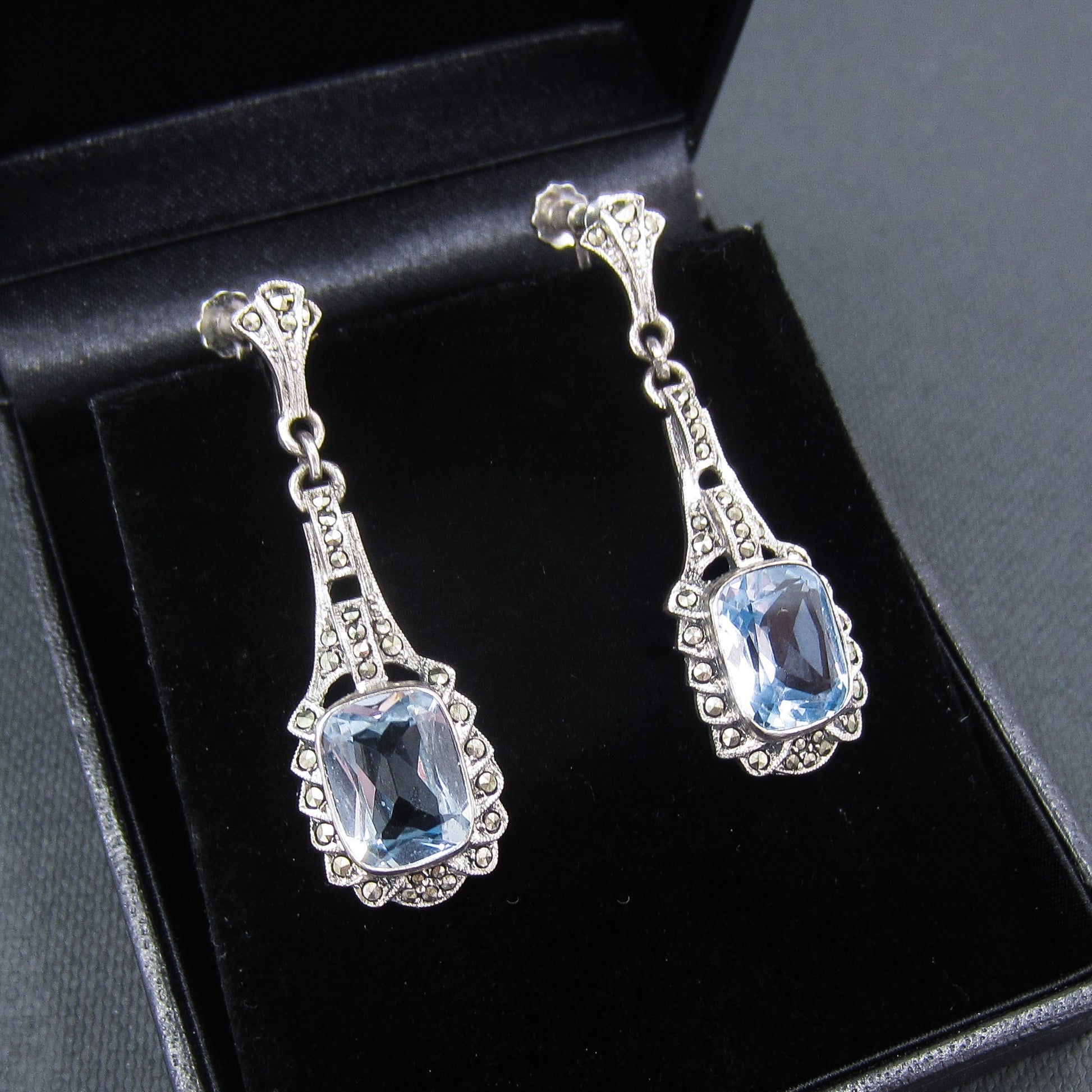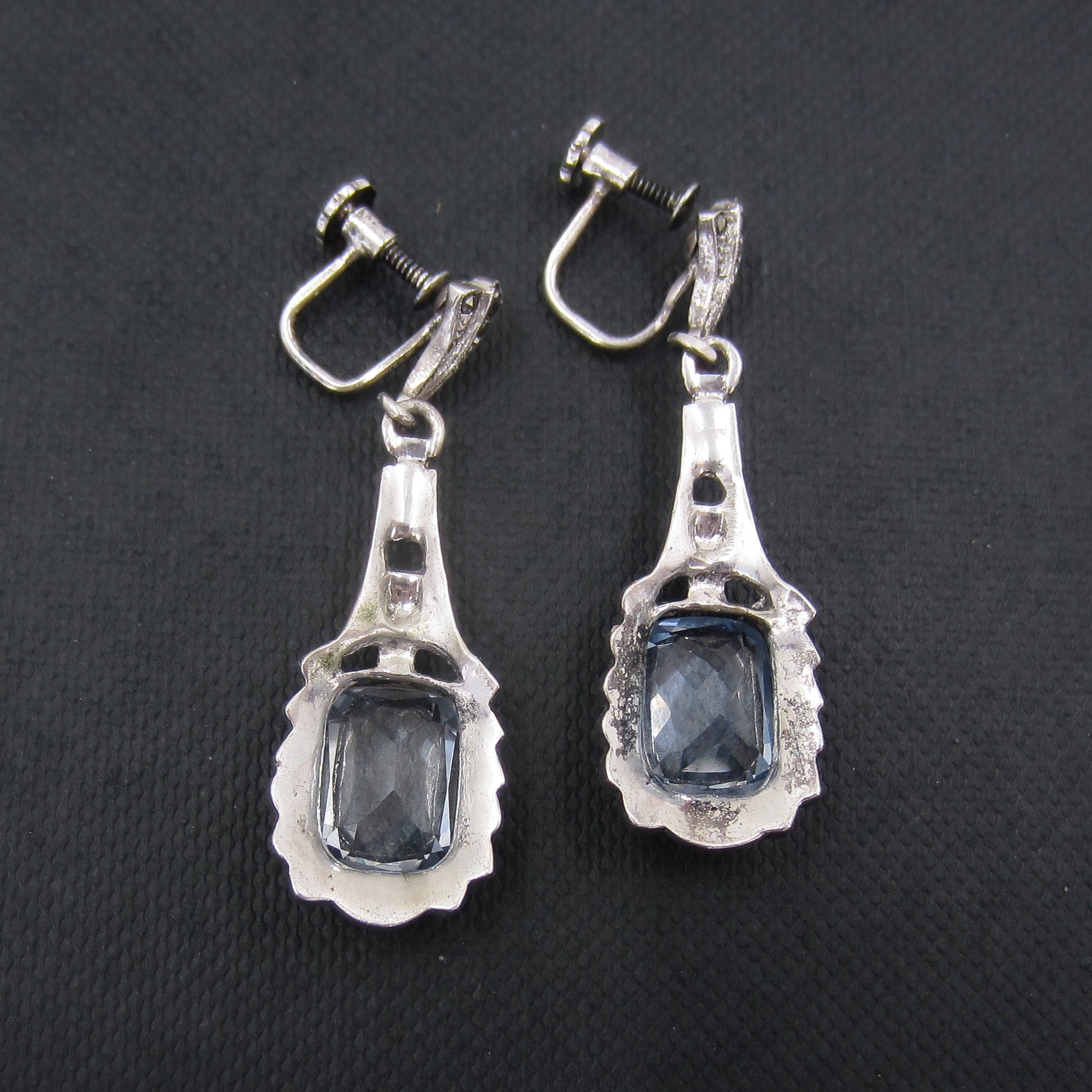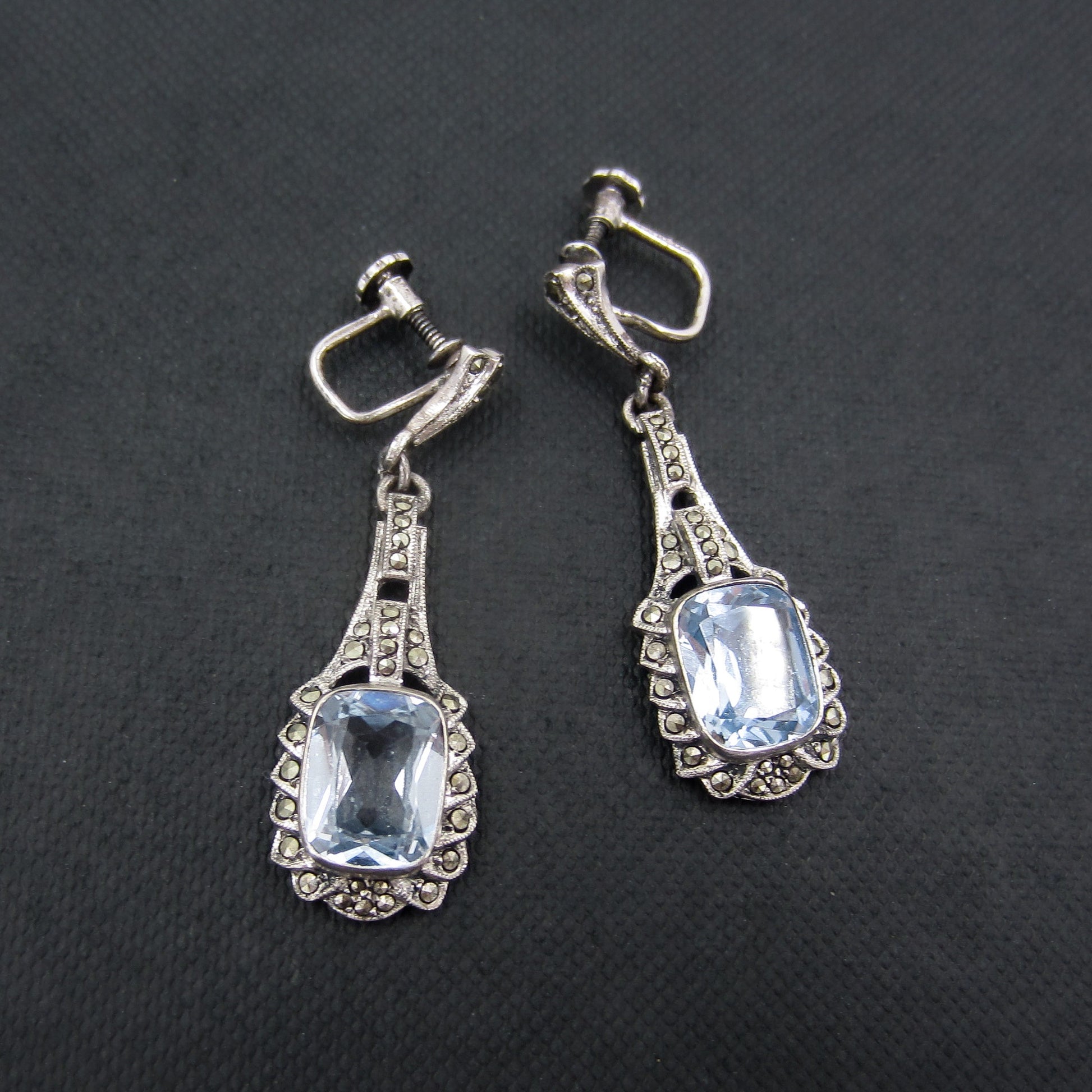 Here we have a pair of true Art Deco era earrings, designed with that inimitable Deco geometry and studded with sparkling marcasites surrounding a bright, light blue faceted synthetic spinel. These earrings are screw backings but we can convert them! Synthetic stones were very popular in later Deco jewelry, they are the exact same chemical composition as the real version but were man-made. These would be perfect for a bride who wants a special vintage wedding day look without breaking the bank!