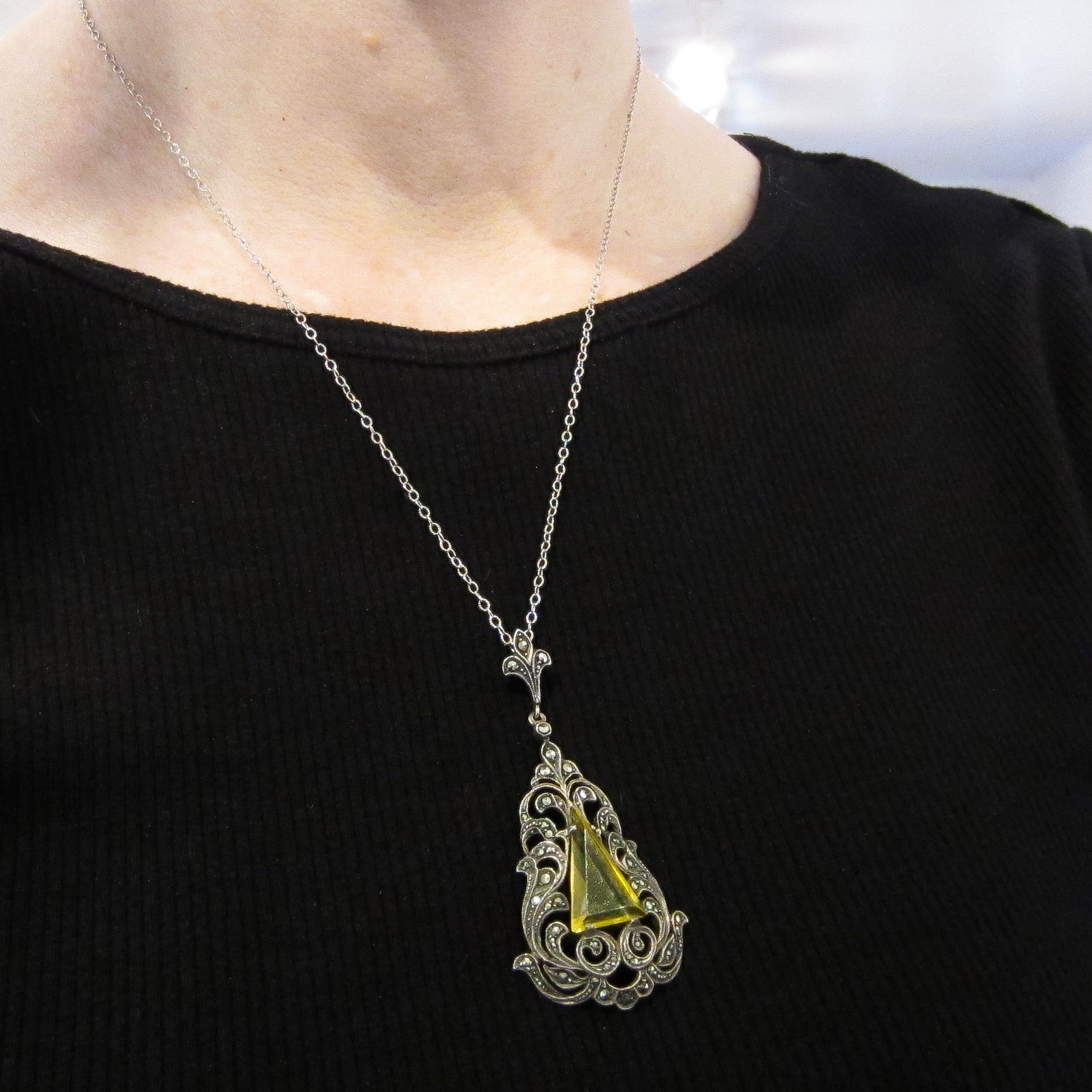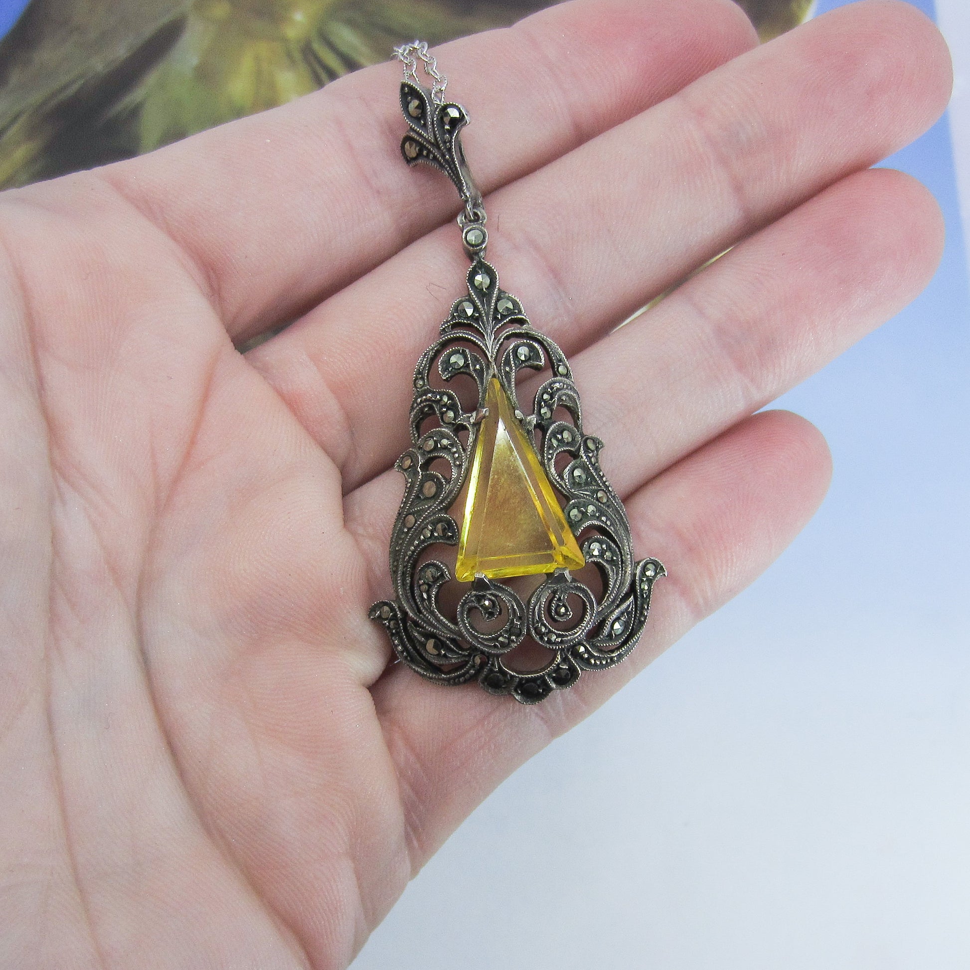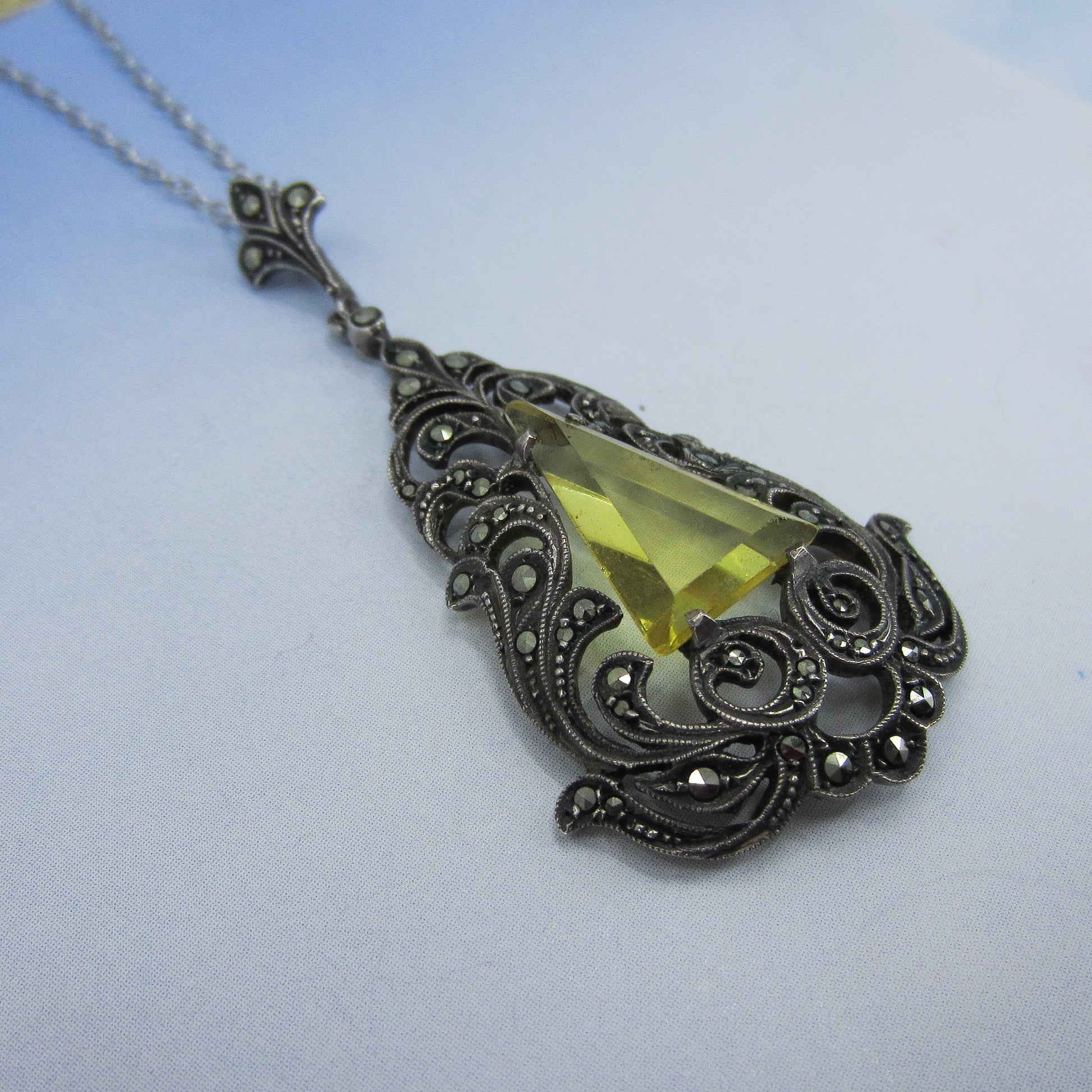 SOLD--Art Deco Marcasite and Yellow Glass Pendant Sterling Silver c. 1930