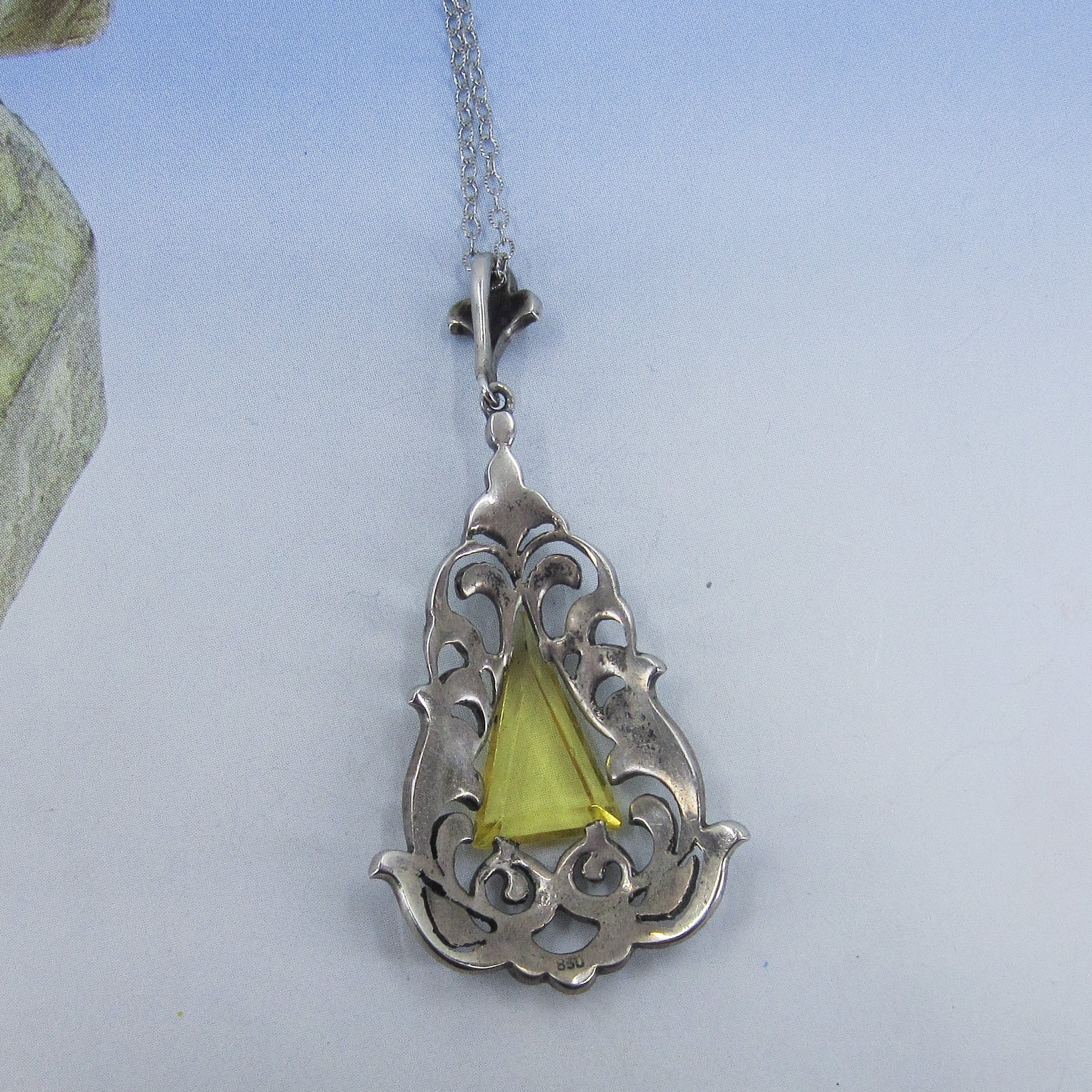 What a gorgeous, romantic piece. This Art Deco era pendant was most likely made in Norway circa 1930 and features a vibrant yellow triangular glass piece held in a scrolling, marcasite sparkling sterling silver setting. I'll never get over the absolutely beauty of these European Deco pieces and I love to imagine what the rest of the world must have looked and felt like when this was the style of the times!