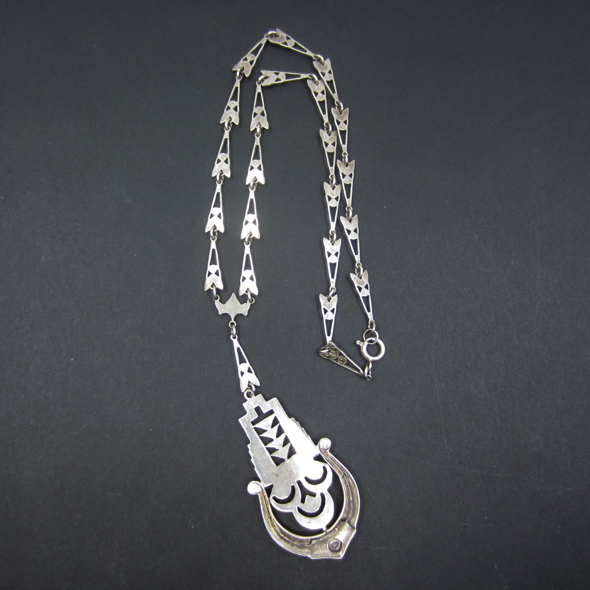 This is one of the better, if not the best, Art Deco marcasite necklace we've had at the store. It's got everything--insane Deco geometric design, sparkling marcasites and size--it's delicate but not dainty! Made circa 1930's in sterling silver and though it's not stamped, looks very German. In excellent condition and is so good it NEEDS to be worn STAT!!