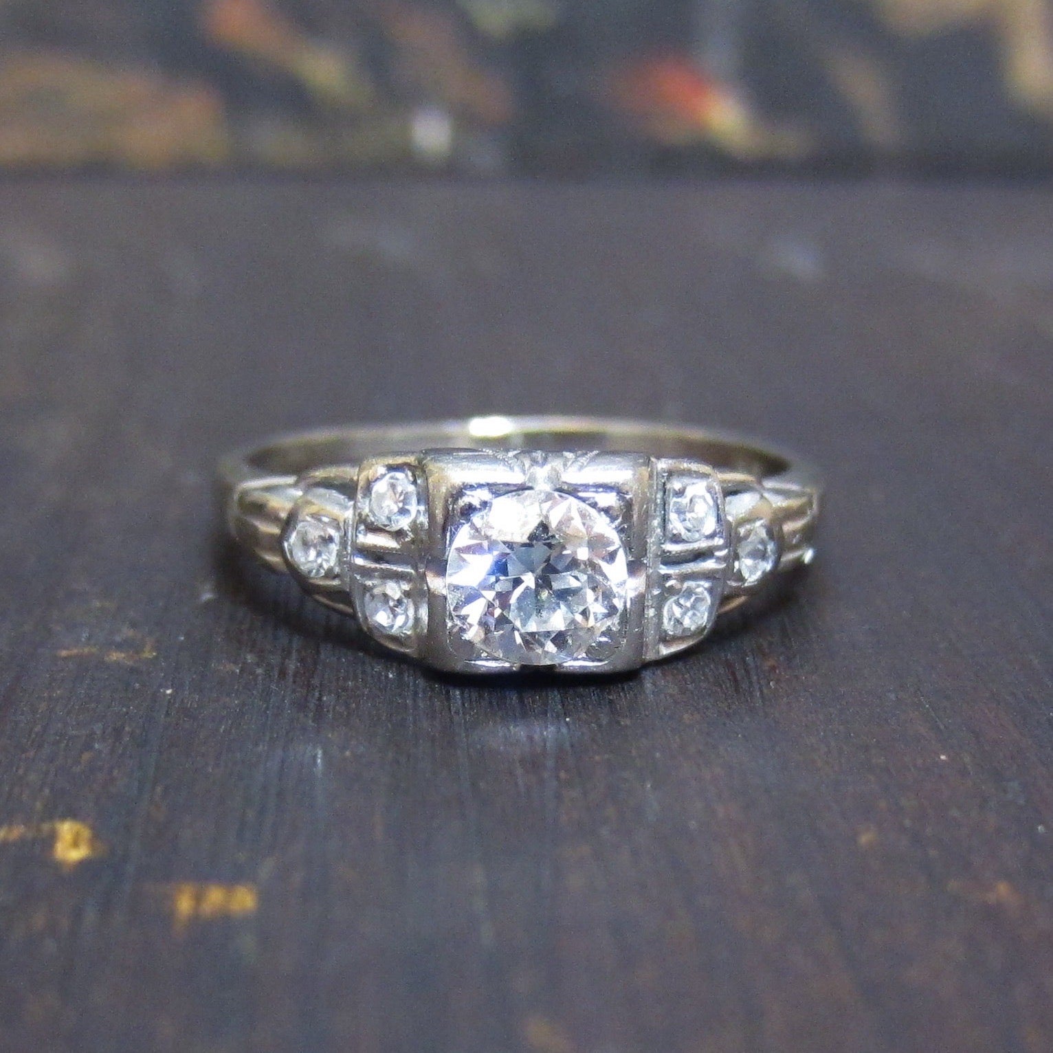 This is a gorgeous Art Deco era engagement ring with bright and sparkling old cut diamonds set amidst all the fantastic Deco details you could possibly want! Made in 18k white gold circa 1920, this ring features a central .41ct natural Old European Cut diamond and six natural single cut diamonds on the sides. With a low profile and geometry for days, this is the wearable Deco engagement ring of your dreams!