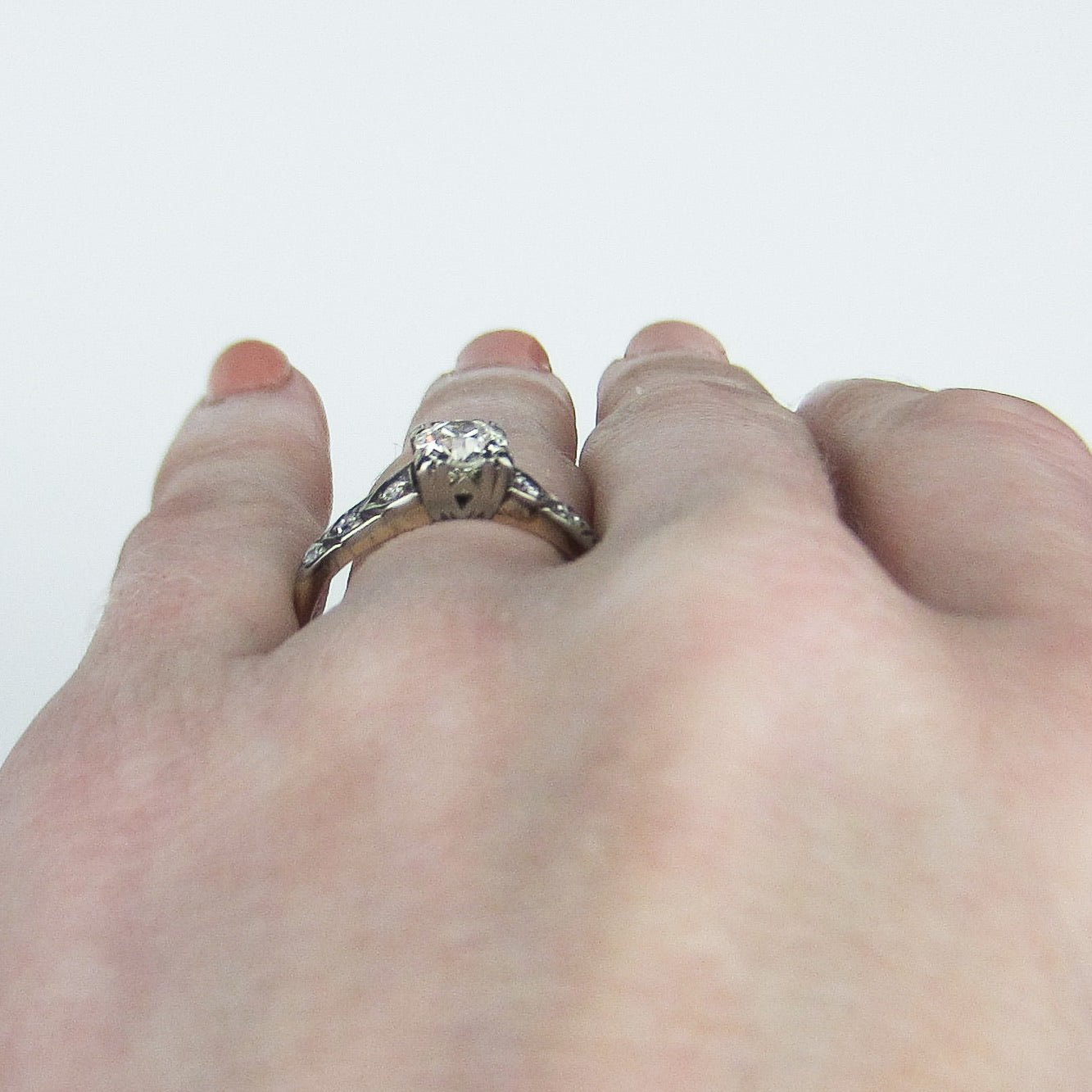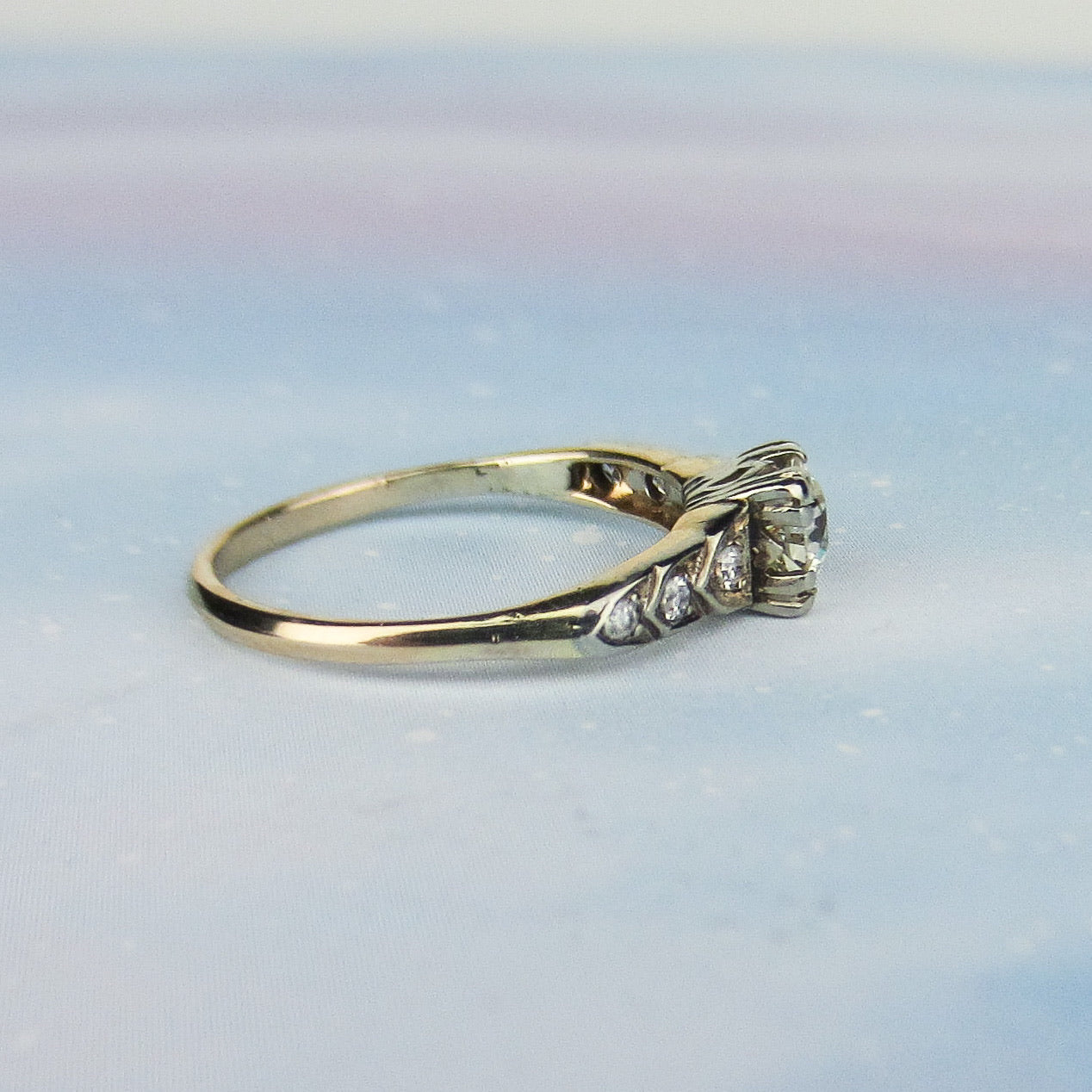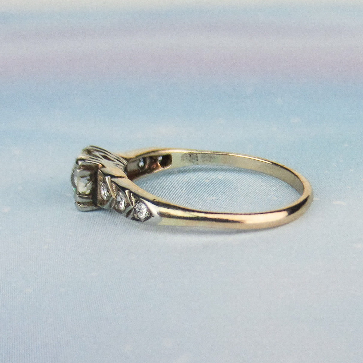 This is a beautiful Art Deco circa 1930's engagement ring with a lively Old European cut diamond weighing approximately .63ct with six single cut diamonds on the shoulders set in 14k white gold with a 14k yellow gold band. You get everything with this ring--a classic nice sized central diamond and all that great Deco detail on the sides!