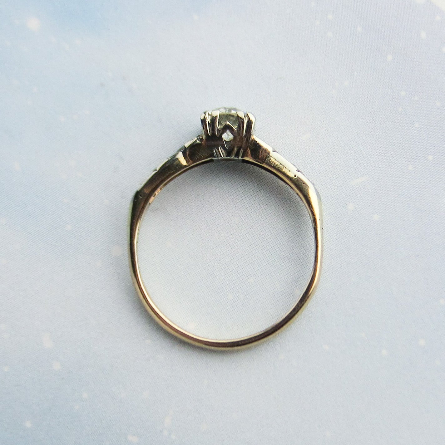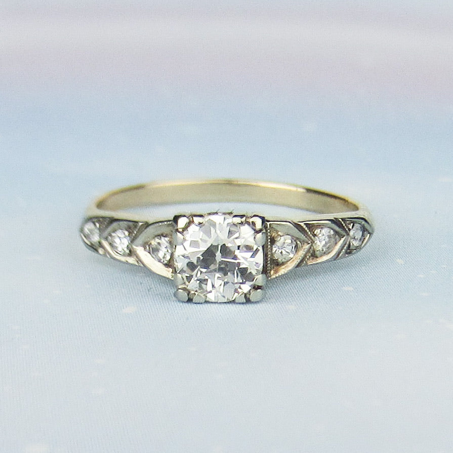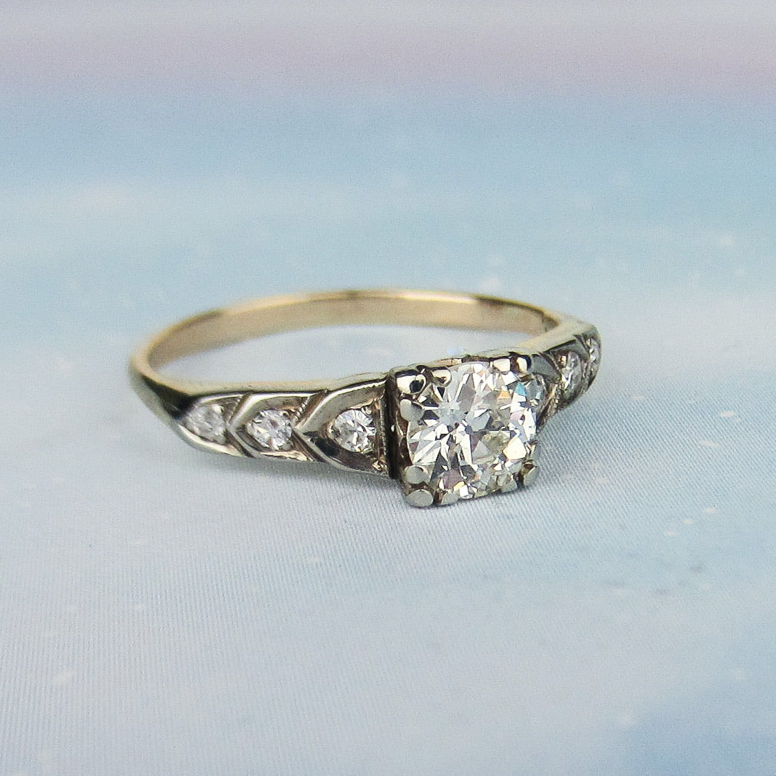 This is a beautiful Art Deco circa 1930's engagement ring with a lively Old European cut diamond weighing approximately .63ct with six single cut diamonds on the shoulders set in 14k white gold with a 14k yellow gold band. You get everything with this ring--a classic nice sized central diamond and all that great Deco detail on the sides!