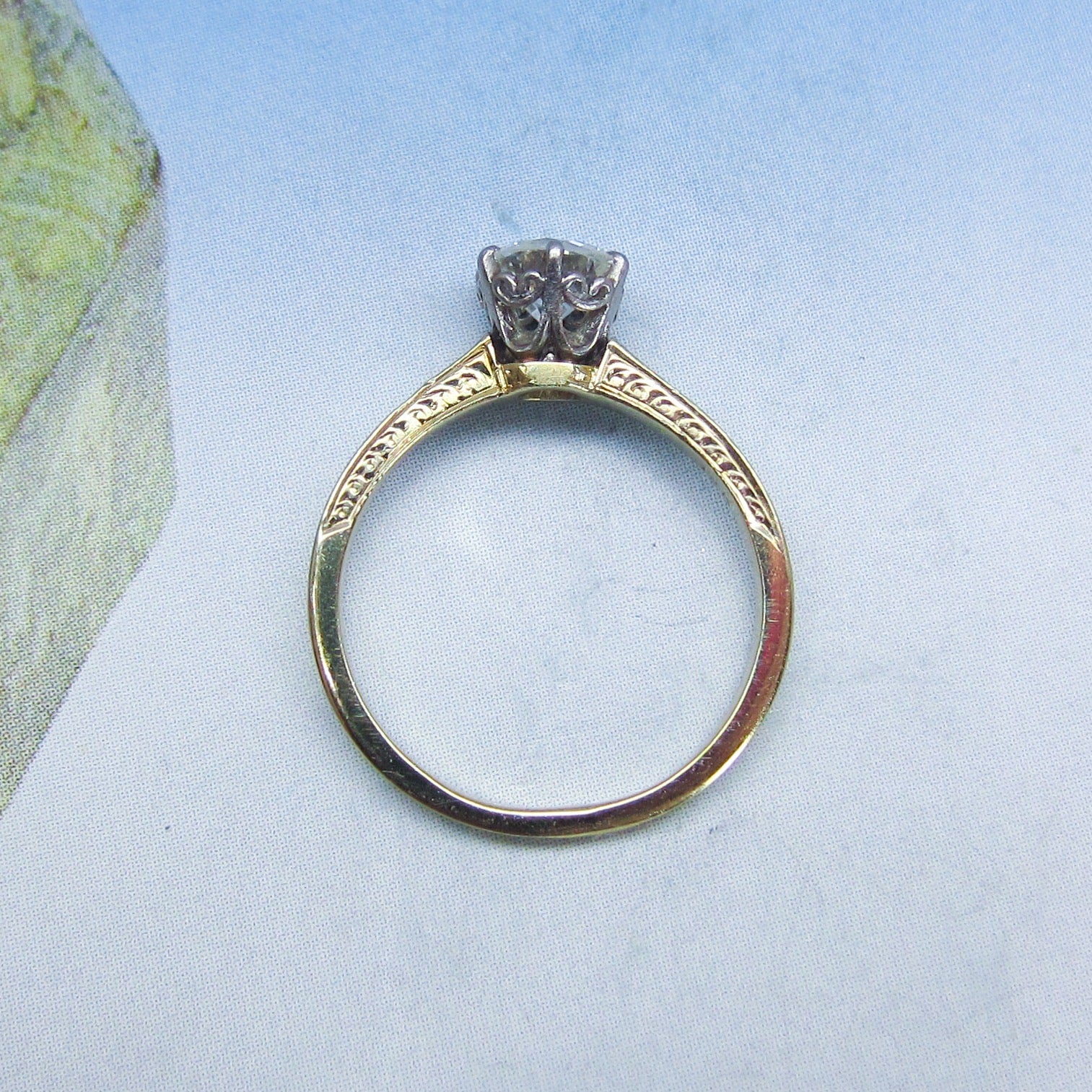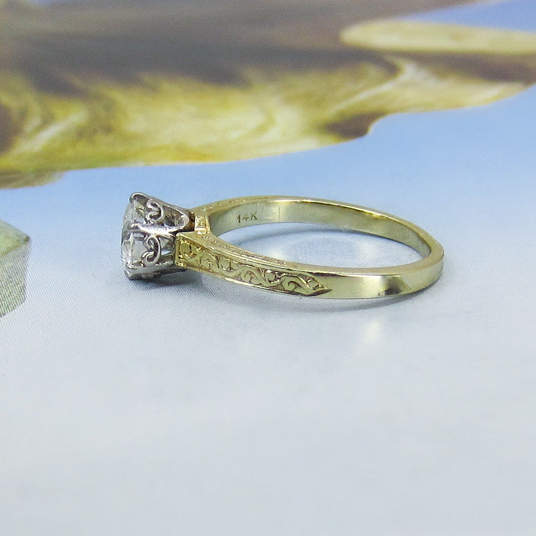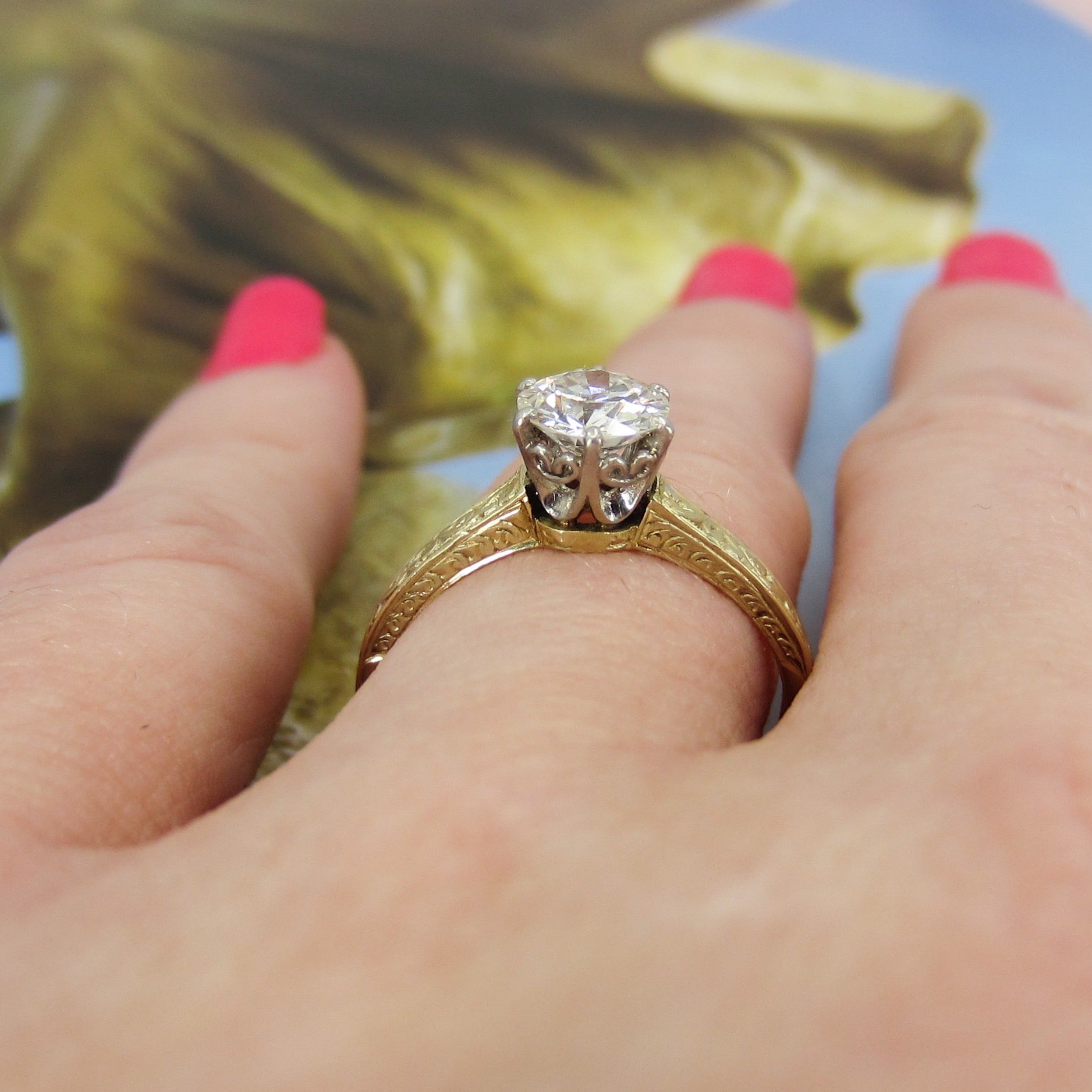 This antique engagement ring is EXQUISITE, from the beautiful, beautiful mounting to the excellence of the cut of this stone--it is lovely, bright and elegant. Made circa 1920, this is a solitaire engagement ring holding a .71ct Old European diamond in a platinum crown basked set in a scrollwork engraved 14k yellow gold band. This diamond grades GHVS1 and it is so well cut that you can see it sparkle from across the room. I cannot say enough about this ring, it is so beautiful, so perfectly done and so antique that whoever gets this will NEVER get tired of it!