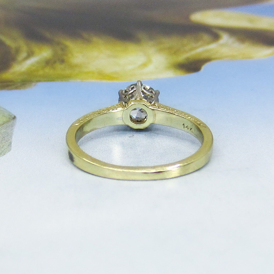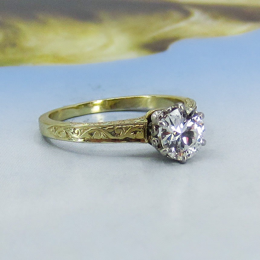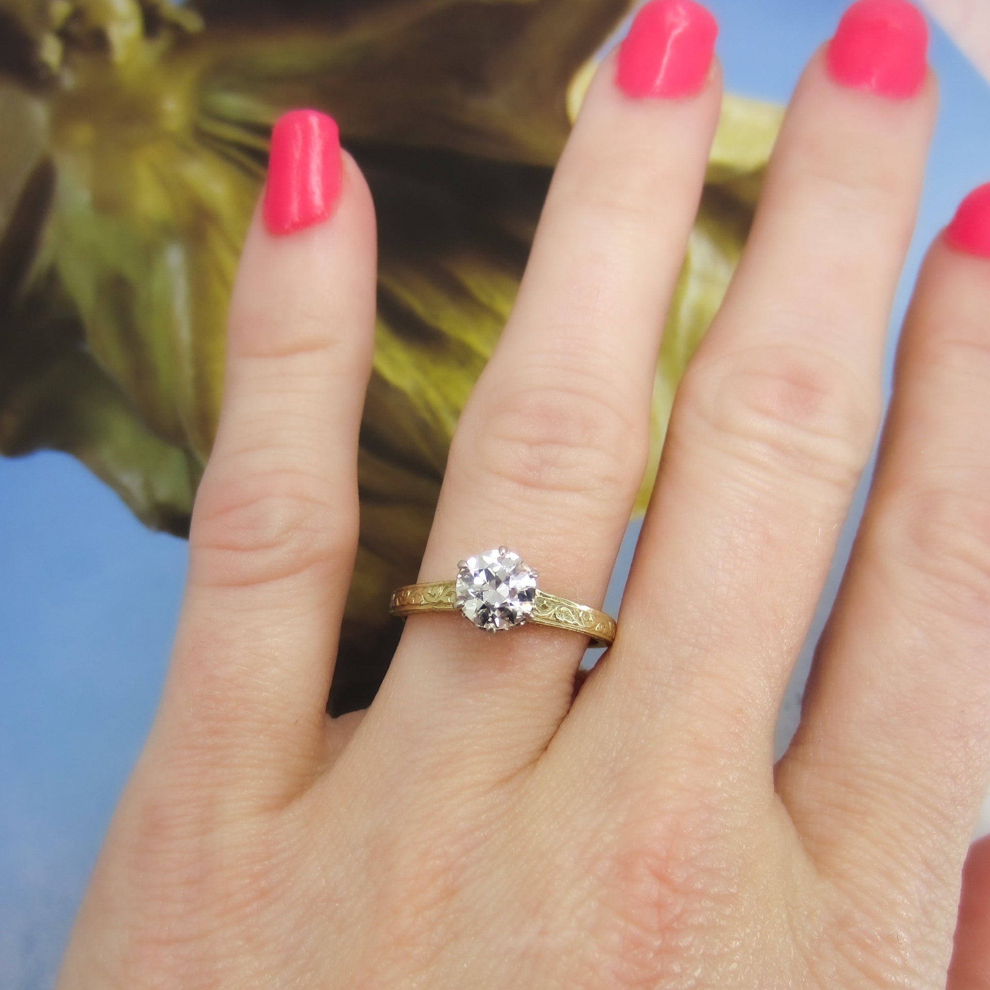 This antique engagement ring is EXQUISITE, from the beautiful, beautiful mounting to the excellence of the cut of this stone--it is lovely, bright and elegant. Made circa 1920, this is a solitaire engagement ring holding a .71ct Old European diamond in a platinum crown basked set in a scrollwork engraved 14k yellow gold band. This diamond grades GHVS1 and it is so well cut that you can see it sparkle from across the room. I cannot say enough about this ring, it is so beautiful, so perfectly done and so antique that whoever gets this will NEVER get tired of it!
