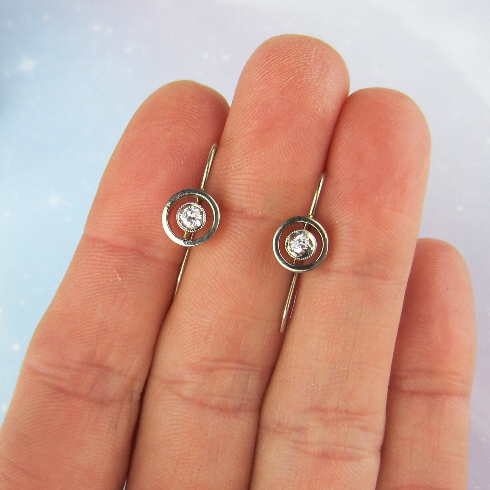 A sweet and wearable pair of Art Deco era earrings with two Old European Cut natural diamonds weighing approximately .10ct each (.20ctw) set in 14k white gold target frames backed with 14k yellow gold. These look great on and are a perfect pair of everyday old cut diamond earrings!