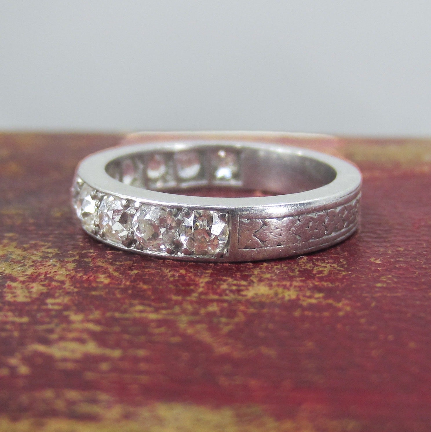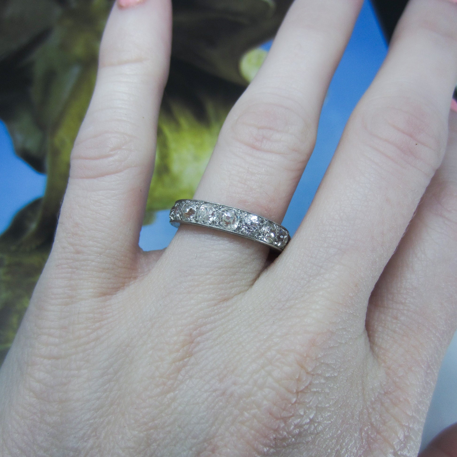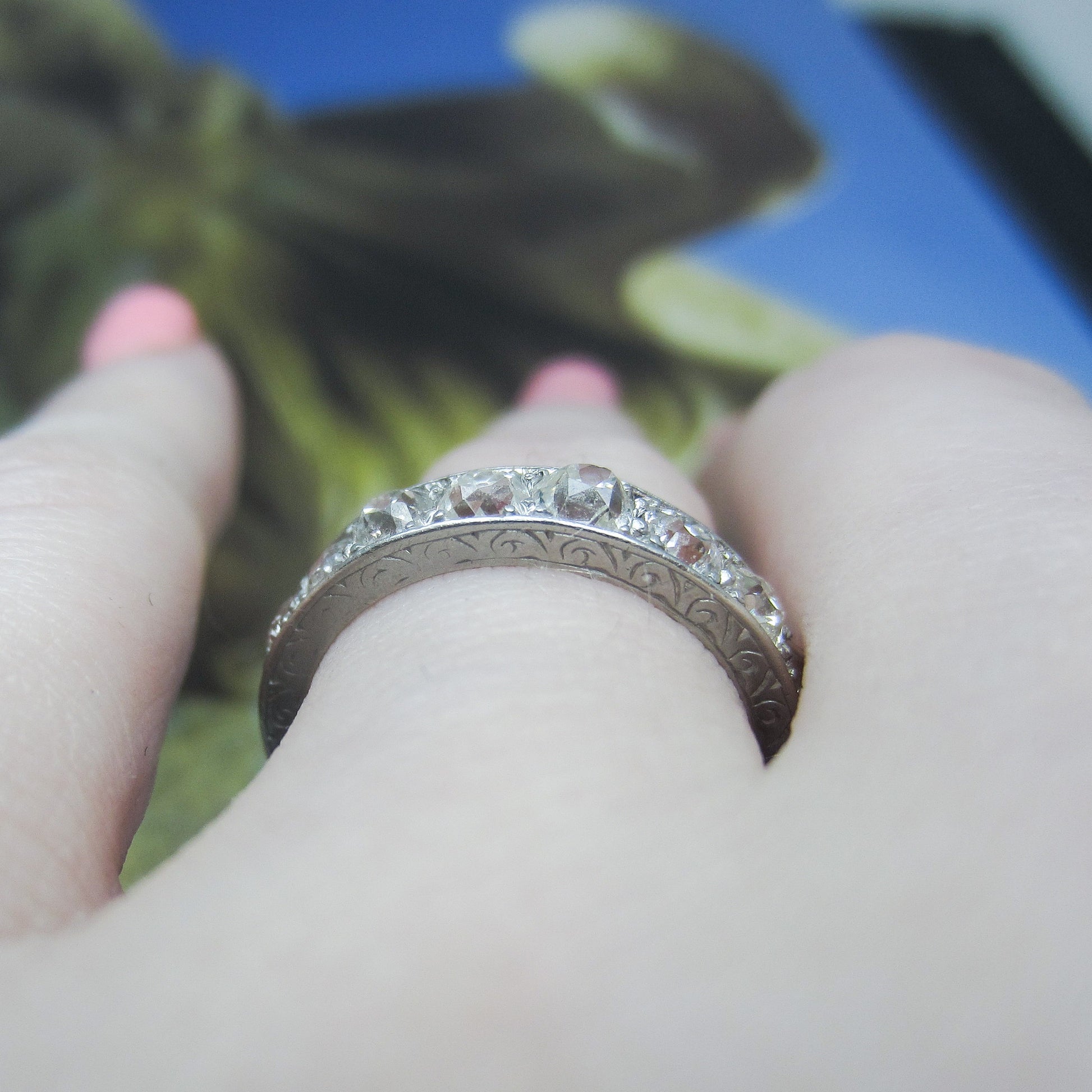 This is a stunner of a band, made in the Art Deco period circa 1920, in platinum with ten CHUNKY Old Mine cut diamonds set halfway around the band. It is GOOOD! Kind of the ultimate old cut diamond band look, these babies are big enough each that you can see their beautiful crowns pillowing up over that mounting--and of course they have that incredible old cut sparkle. The back of the very thick band is engraved with flowers and both sides are gorgeously engraved as well, though only one side is still intact. I'm in love but I'm not a size 6.5! If you are, and are looking for a reaaallly special antique wedding band you have got to try this one on!