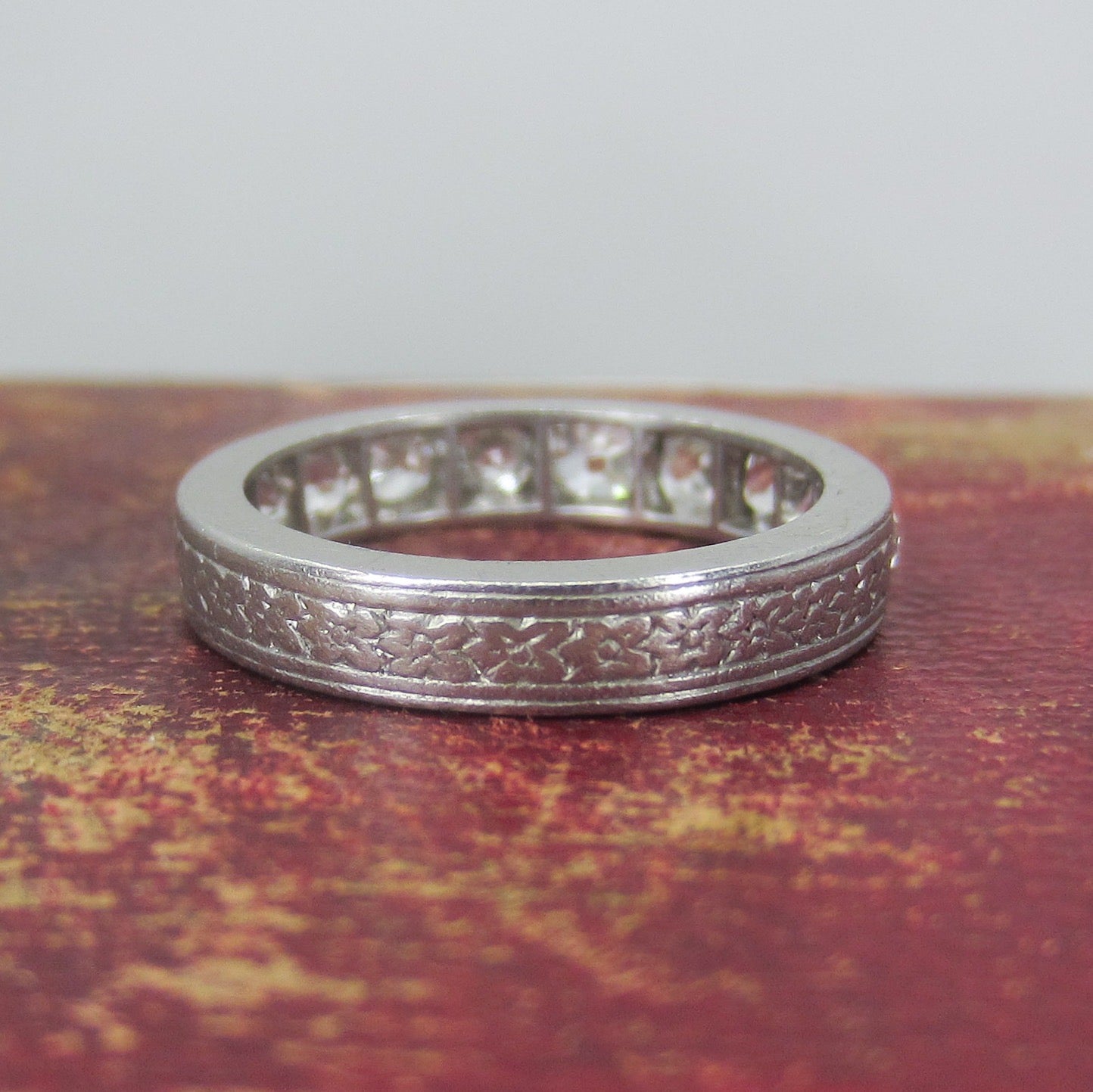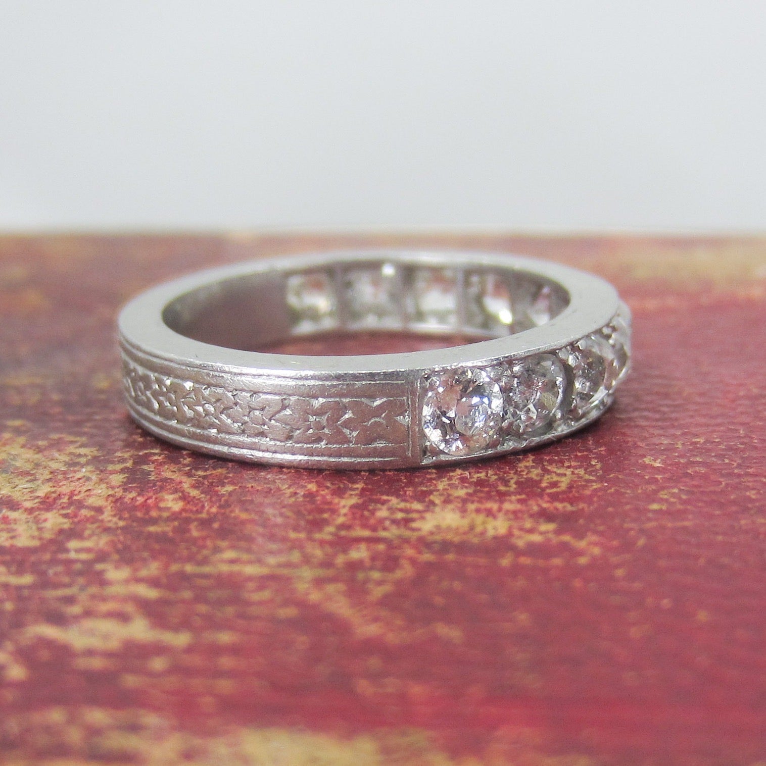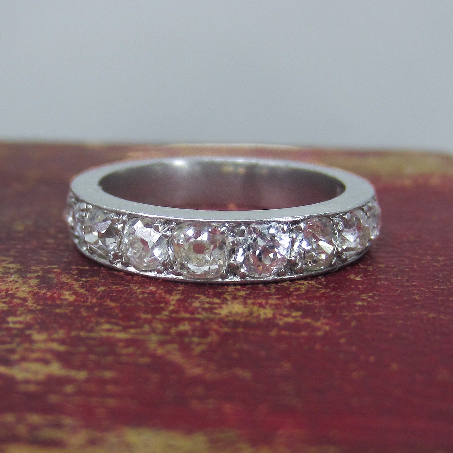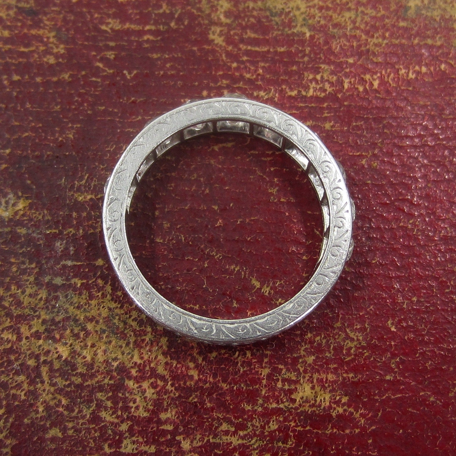 This is a stunner of a band, made in the Art Deco period circa 1920, in platinum with ten CHUNKY Old Mine cut diamonds set halfway around the band. It is GOOOD! Kind of the ultimate old cut diamond band look, these babies are big enough each that you can see their beautiful crowns pillowing up over that mounting--and of course they have that incredible old cut sparkle. The back of the very thick band is engraved with flowers and both sides are gorgeously engraved as well, though only one side is still intact. I'm in love but I'm not a size 6.5! If you are, and are looking for a reaaallly special antique wedding band you have got to try this one on!