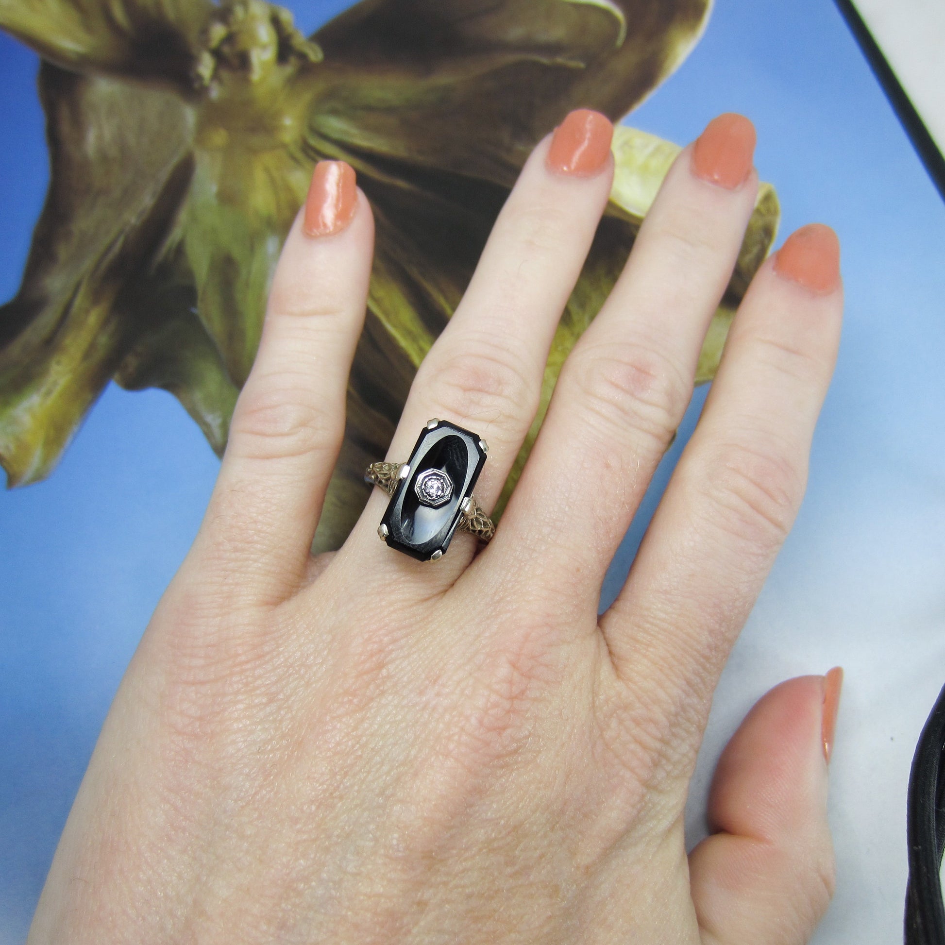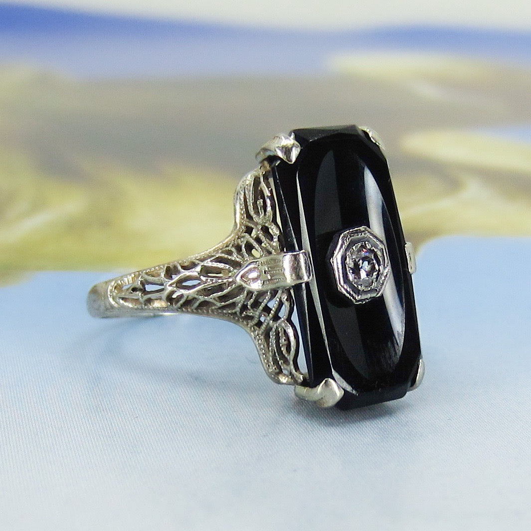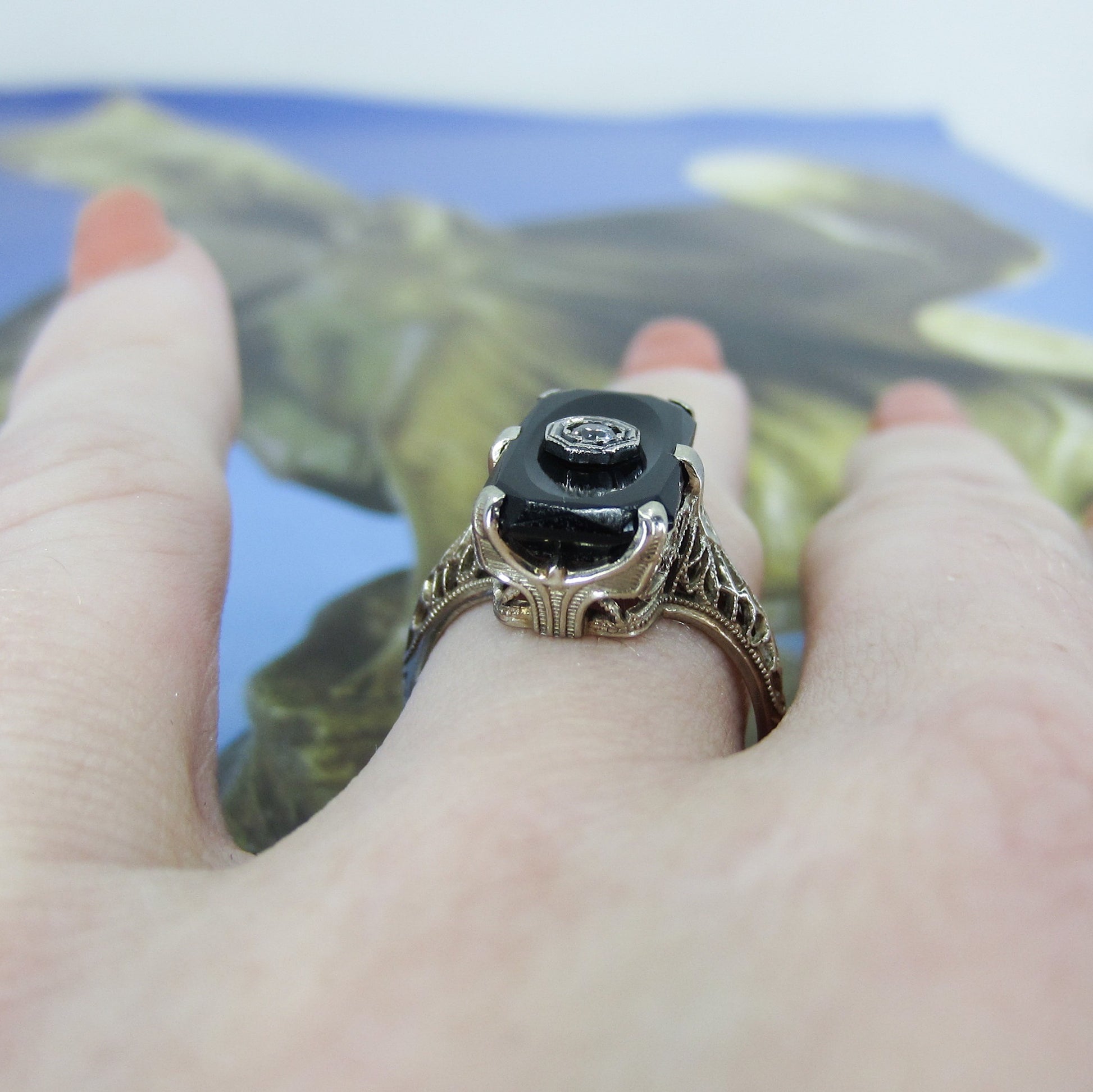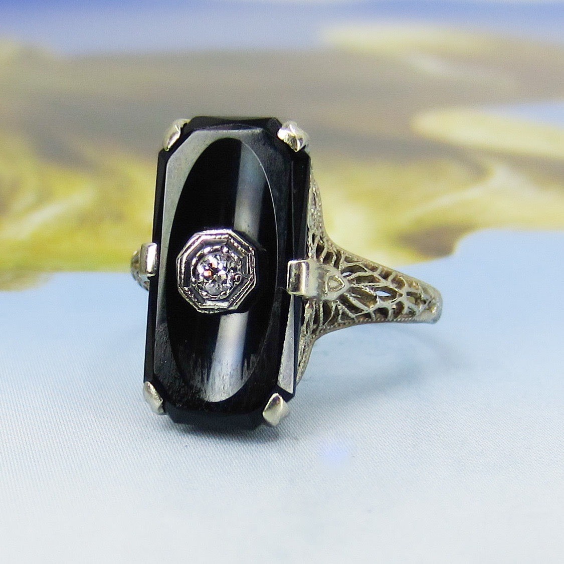 A classic, wearable Art Deco ring with a .10ct Old European Cut diamond inset in an onyx table in a 14k white gold filigree mounting. Beautiful and a great starter piece for a new collector!