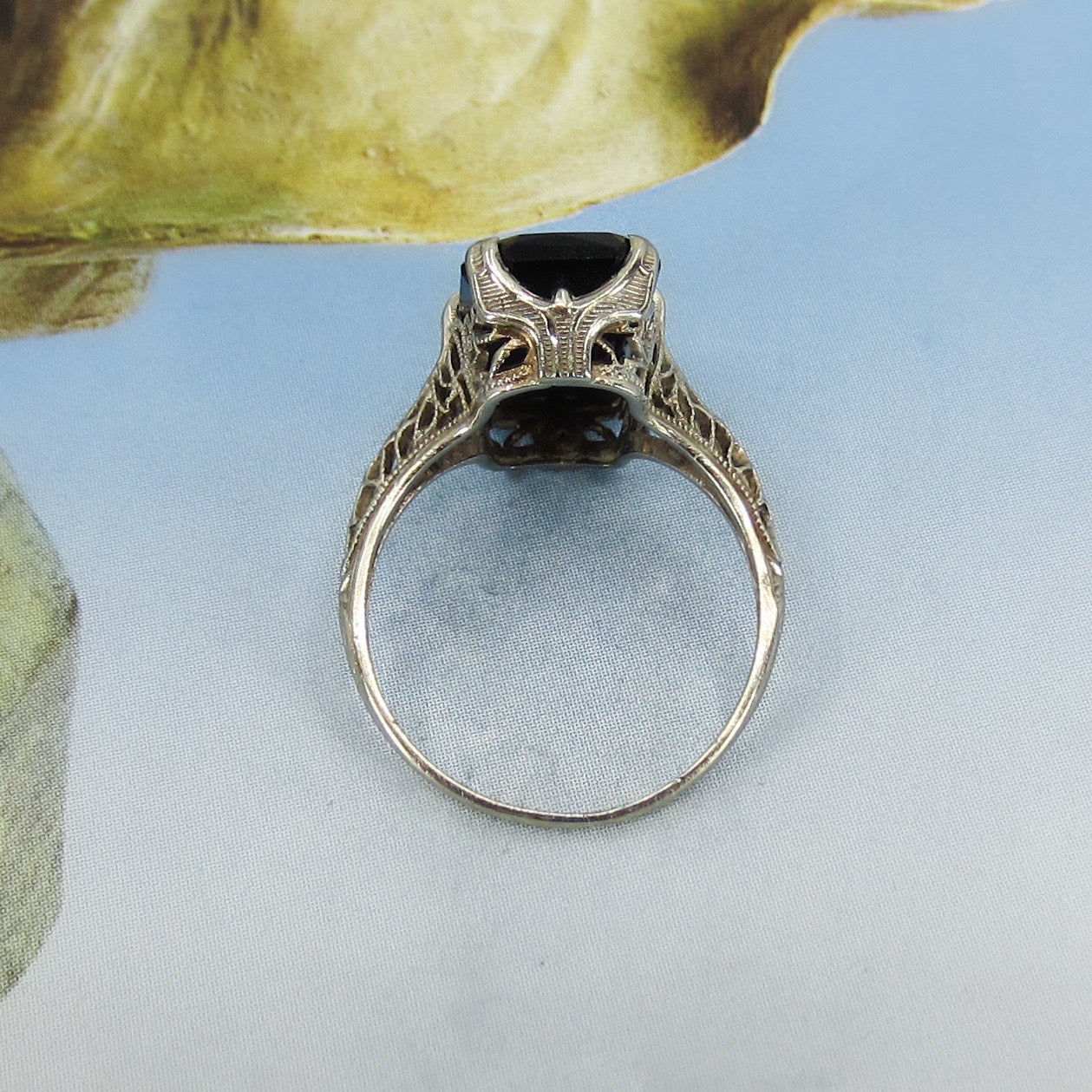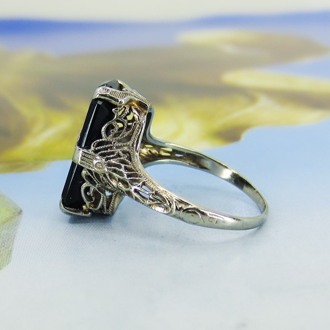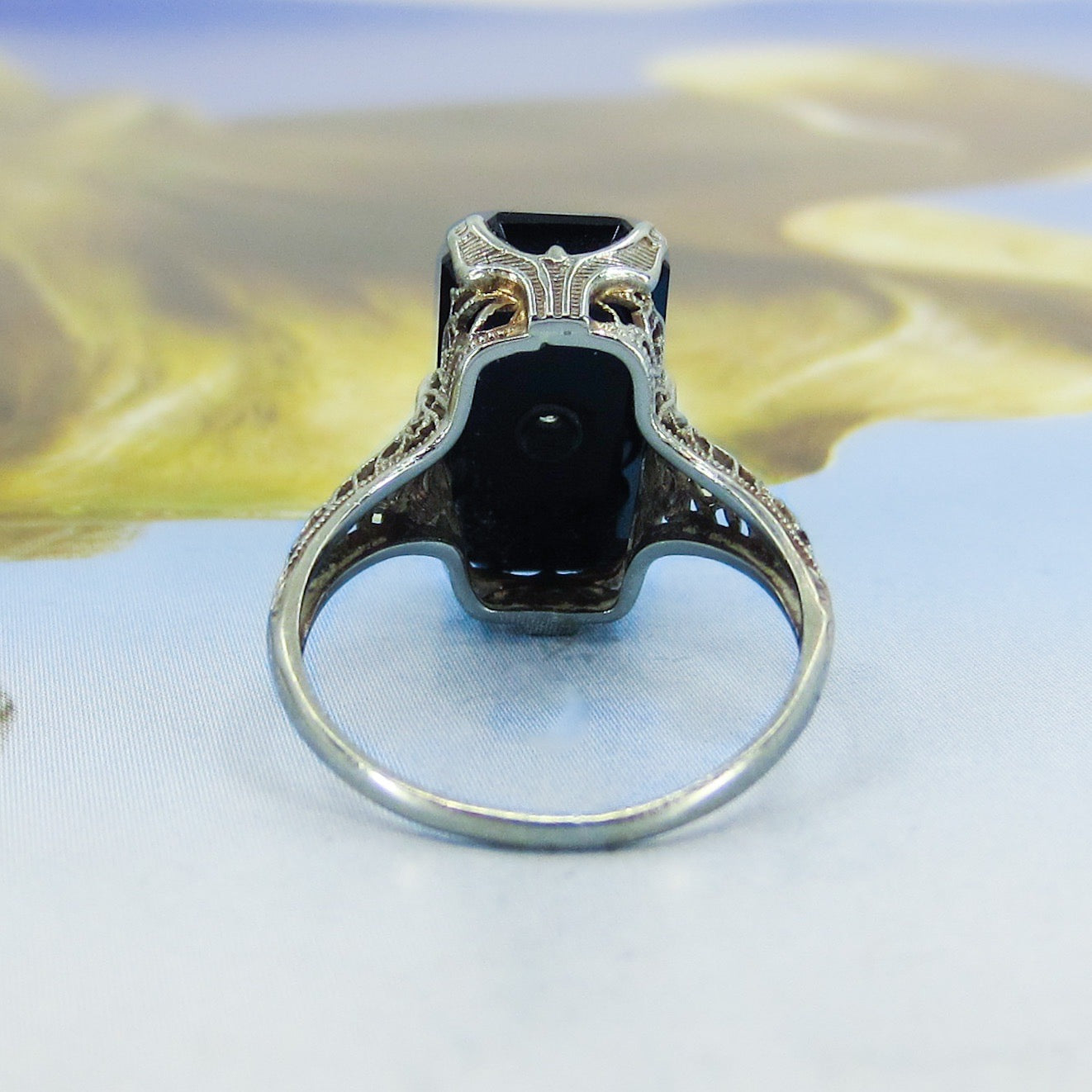 A classic, wearable Art Deco ring with a .10ct Old European Cut diamond inset in an onyx table in a 14k white gold filigree mounting. Beautiful and a great starter piece for a new collector!