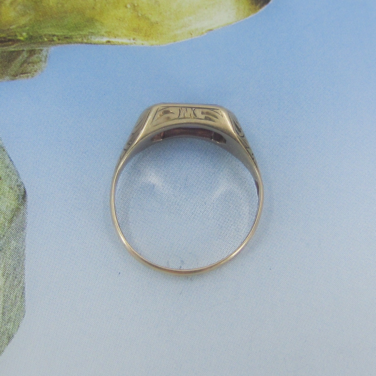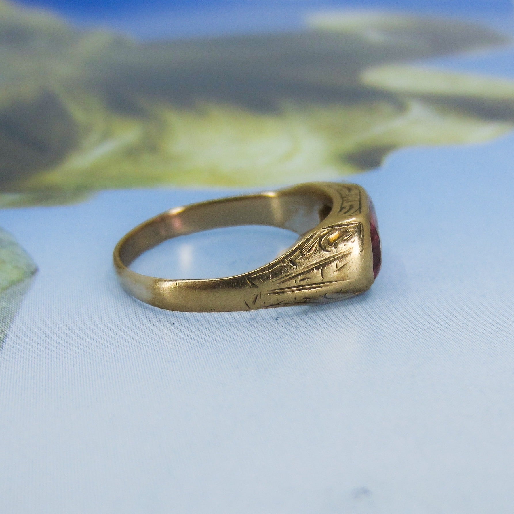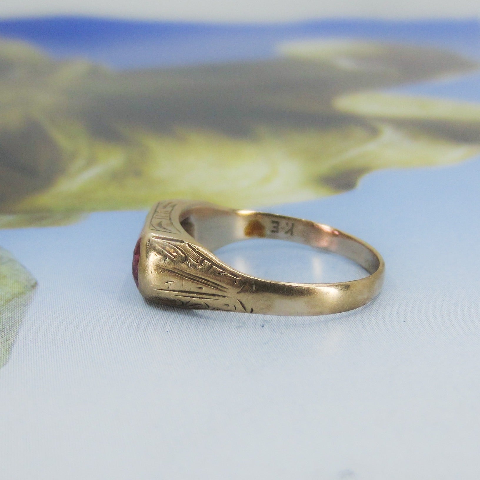 This beautiful little ring dates from the Art Deco era but quite possibly earlier, and holds a bright pink sapphire bezel set in a 14k engraved mounting. The shape of the ring and style of the engraving is very Deco, but the style of the bezel is usually seen in earlier Victorian pieces. It's not a typical Deco setting. But we're always conservative here in our time period estimates so let's say it's Deco at the latest! It's absolutely lovely, wearable and would make a great engagement ring for someone who wants a pink stone!