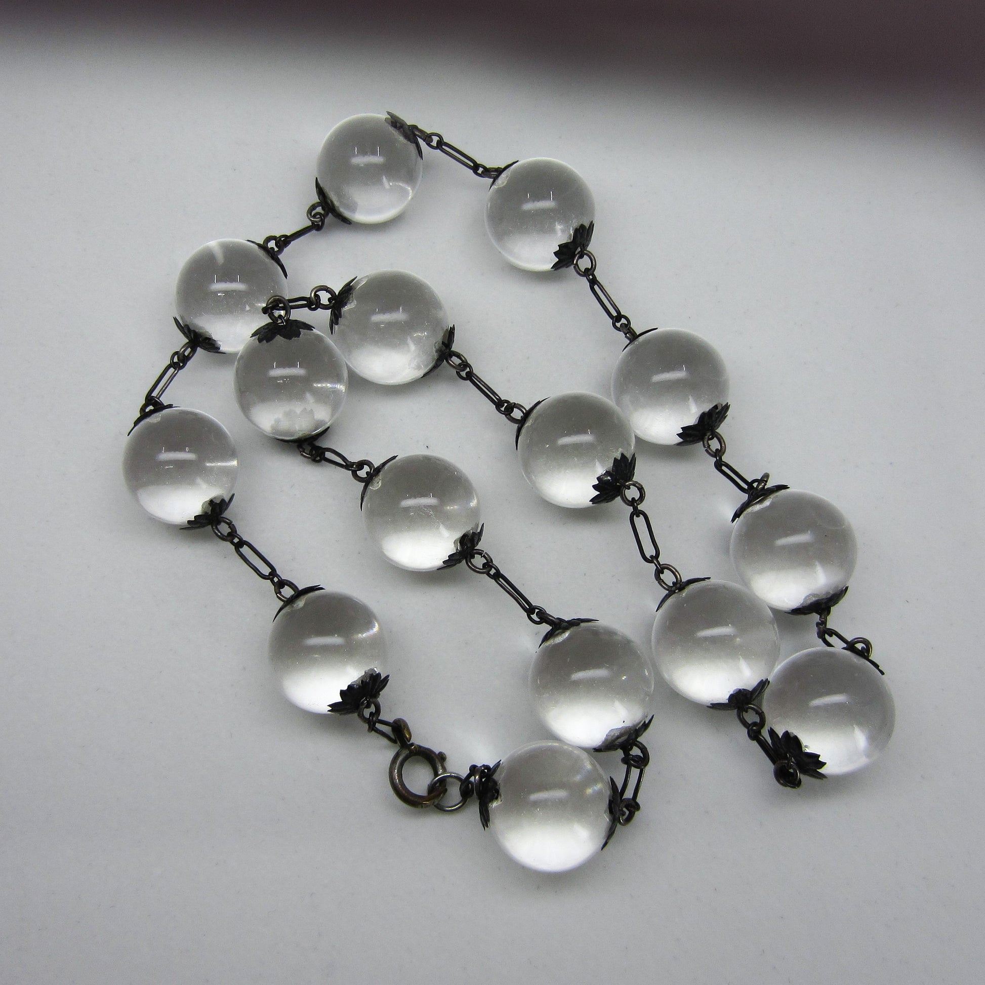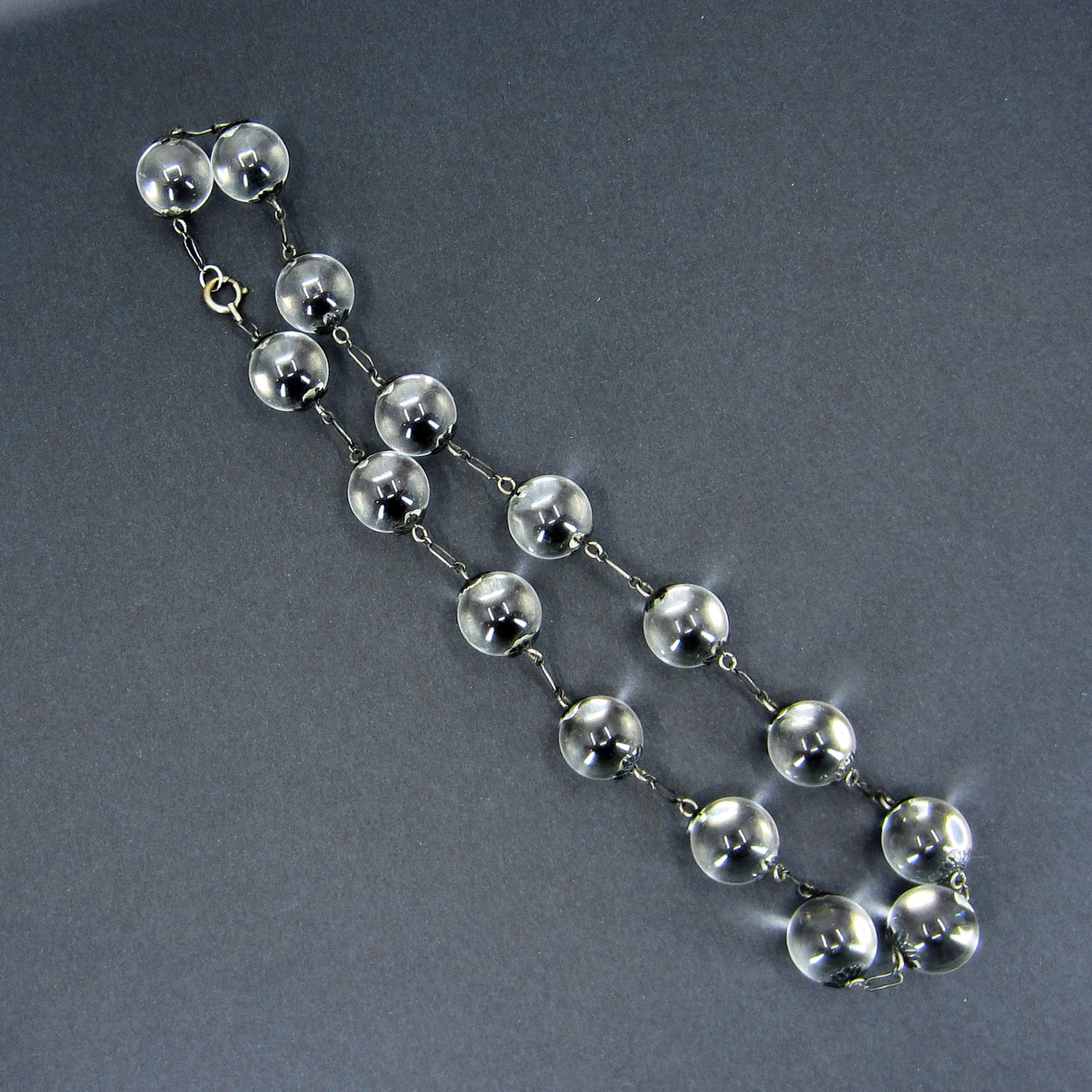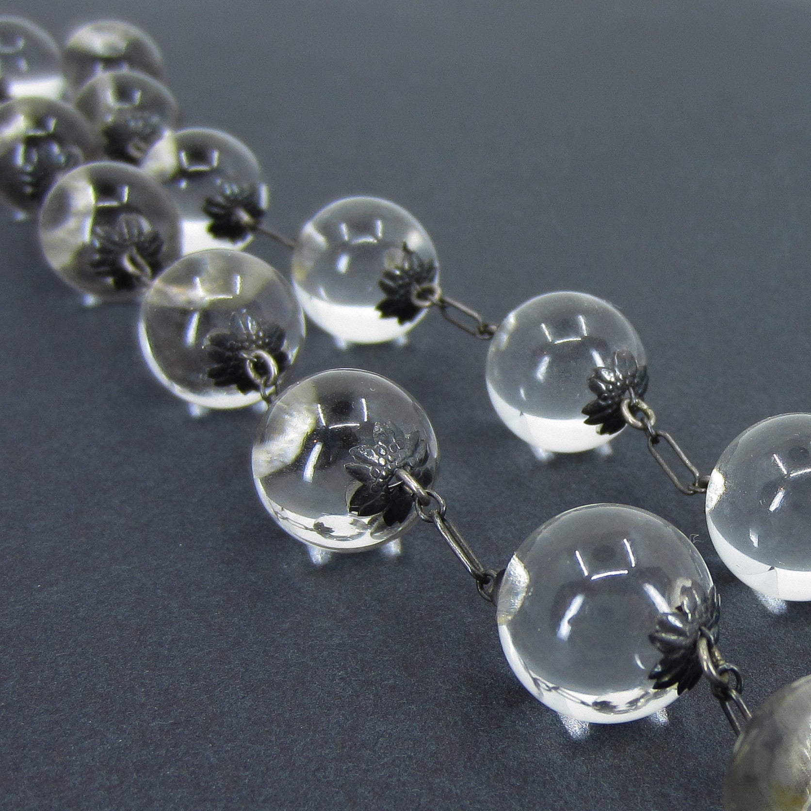 I found it very tough to capture a good photo of this necklace because it kept rolling all over the place! The best and most accurate depiction of what this magical piece looks like in real life is the shot of it on. They don't call them pools of light for nothing! Made in the Art Deco era circa 1930, this necklace holds undrilled orb-shaped rock crystal quartz stones between floral bead caps. Unincluded rock crystal, when fashioned as an orb, exhibits the most wonderful optical property when light hits it at the right angle--it glows! Pools of light necklace were mostly imported from China during the late 1800's to late Deco period and are becoming very scarce. Try one on and you will be hooked!
