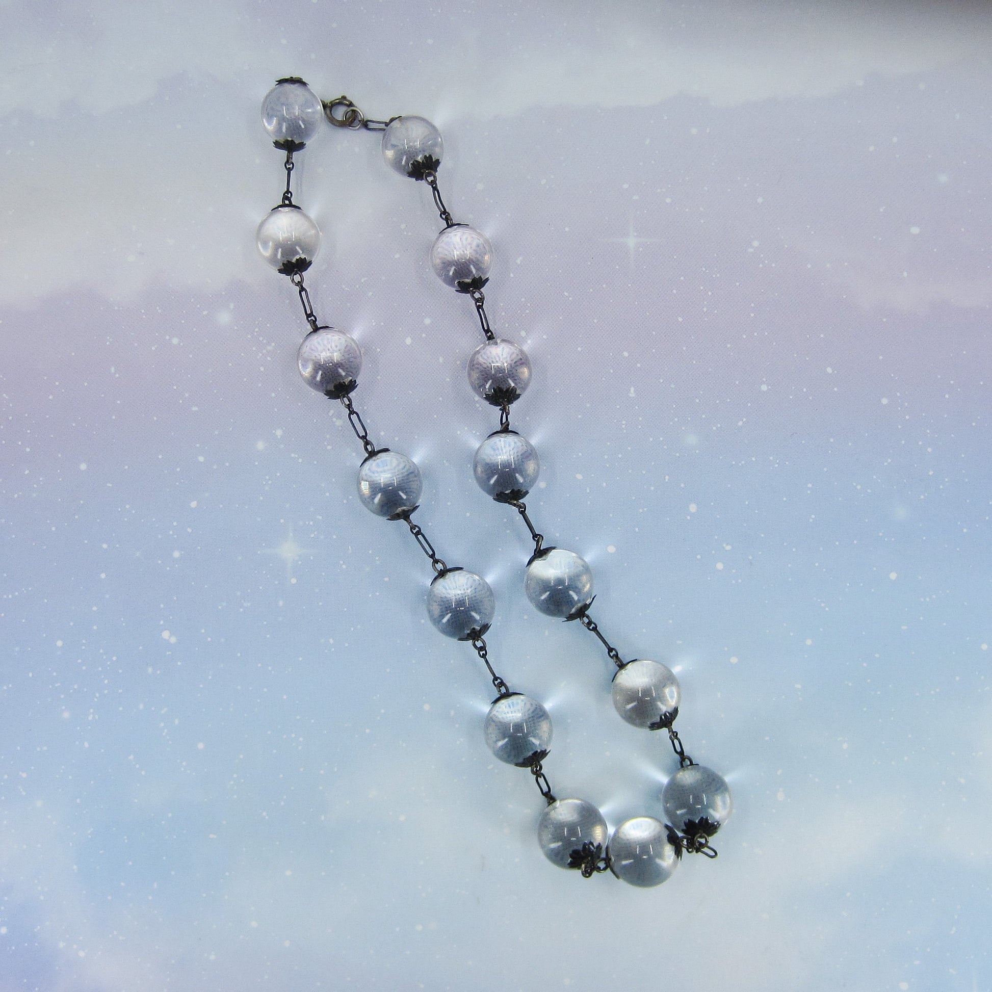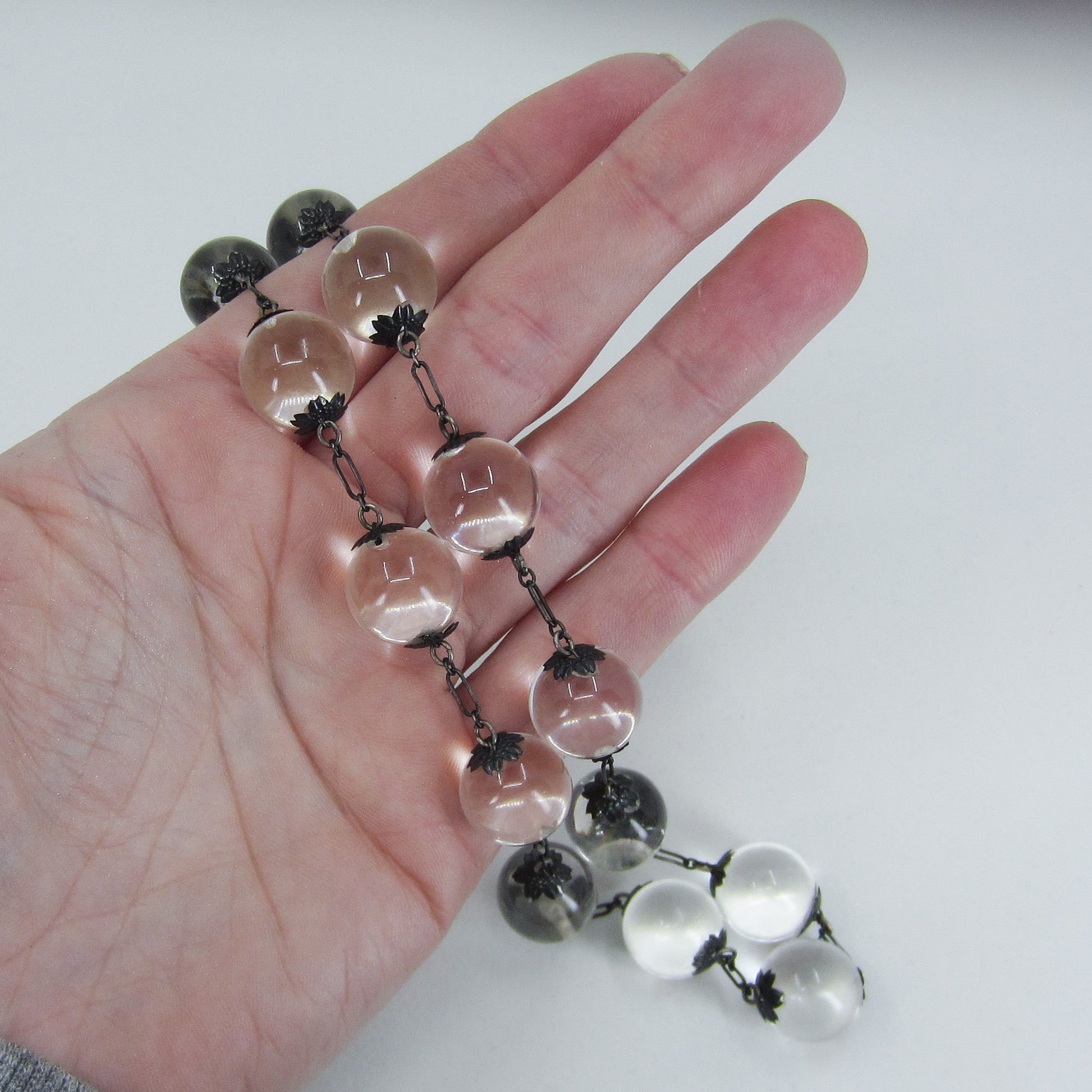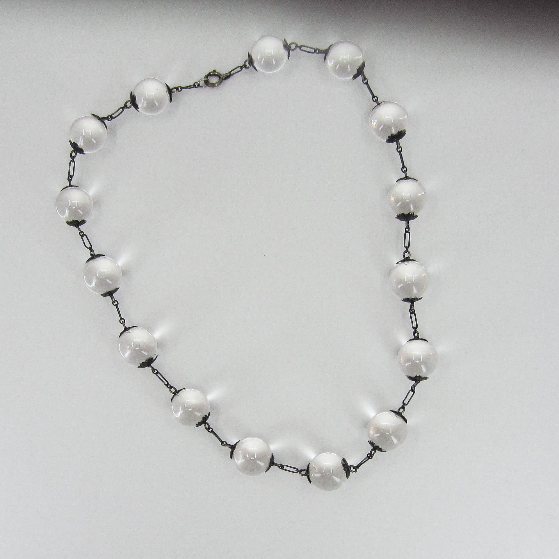 I found it very tough to capture a good photo of this necklace because it kept rolling all over the place! The best and most accurate depiction of what this magical piece looks like in real life is the shot of it on. They don't call them pools of light for nothing! Made in the Art Deco era circa 1930, this necklace holds undrilled orb-shaped rock crystal quartz stones between floral bead caps. Unincluded rock crystal, when fashioned as an orb, exhibits the most wonderful optical property when light hits it at the right angle--it glows! Pools of light necklace were mostly imported from China during the late 1800's to late Deco period and are becoming very scarce. Try one on and you will be hooked!