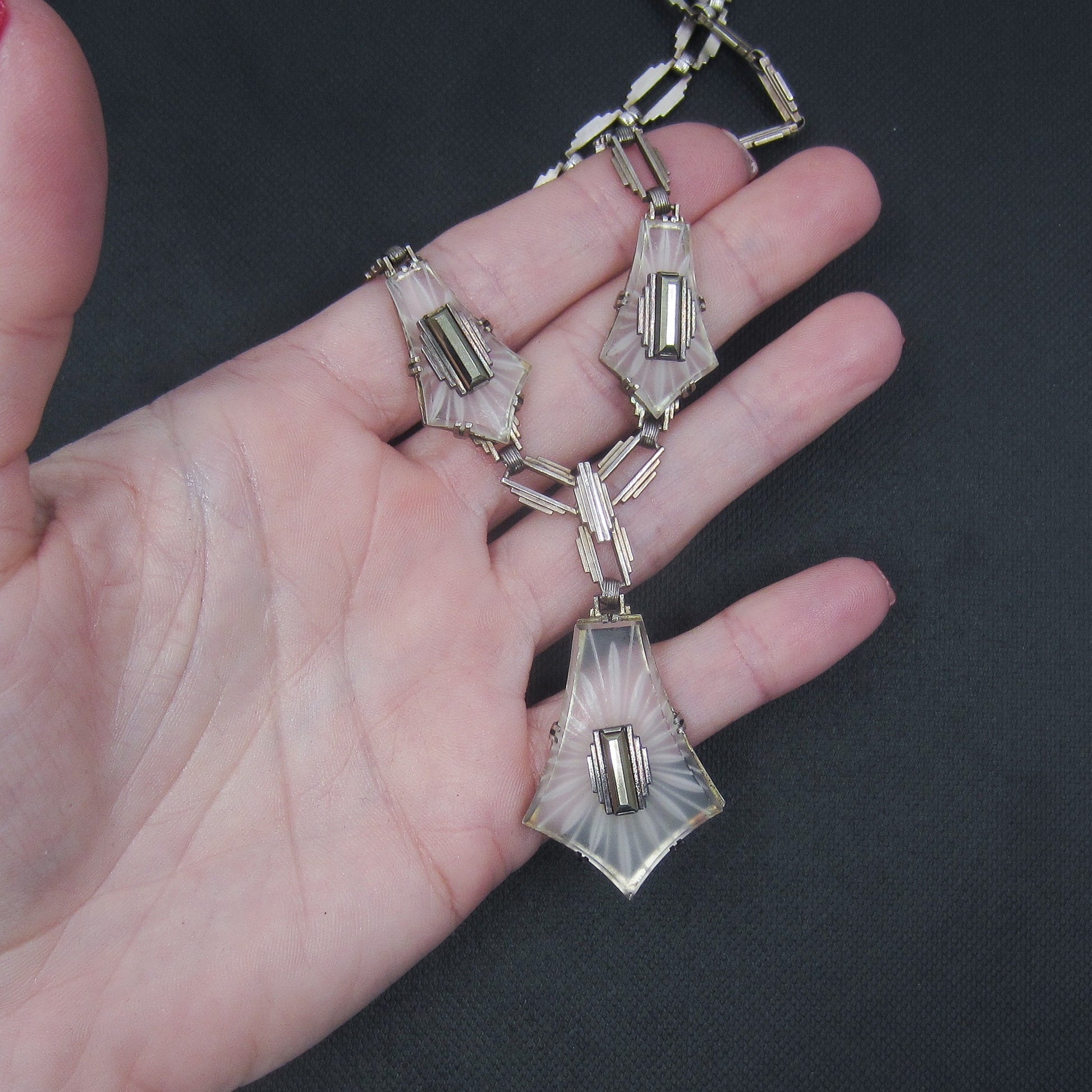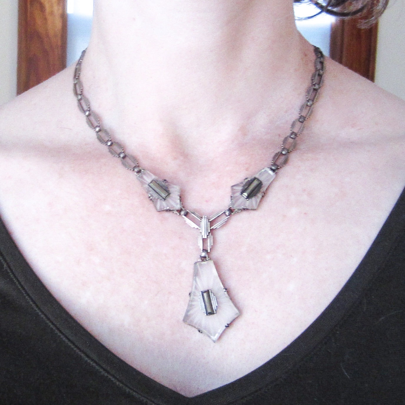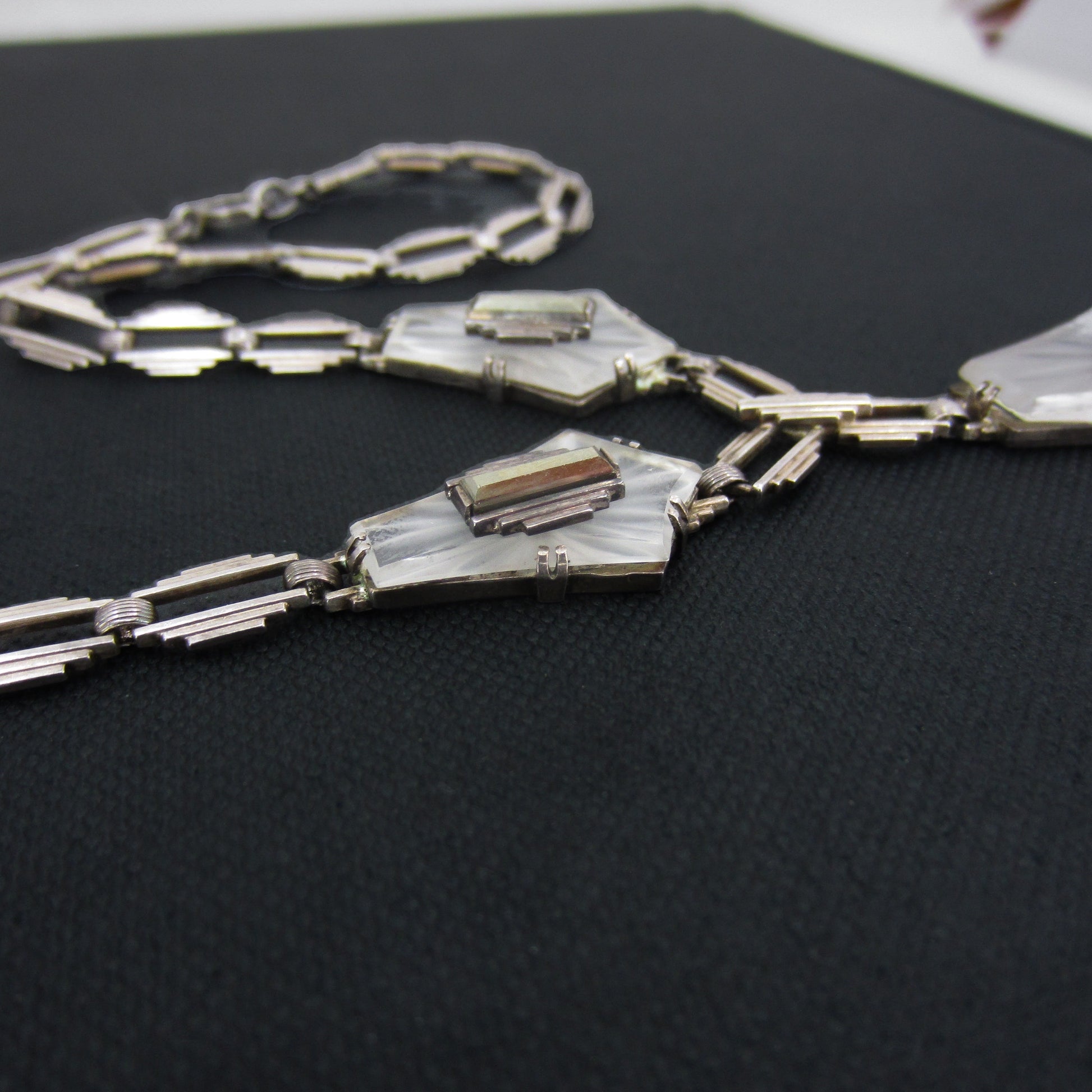 A gorgeous and high-end Art Deco era necklace featuring carved rock crystal quartz plaques set with faceted pyrite in sterling silver circa 1930. This would make a spectacular necklace for a bride! But you don't have to be getting married to enjoy this ethereal piece, it's pure Deco design will delight any antique jewelry lover!
