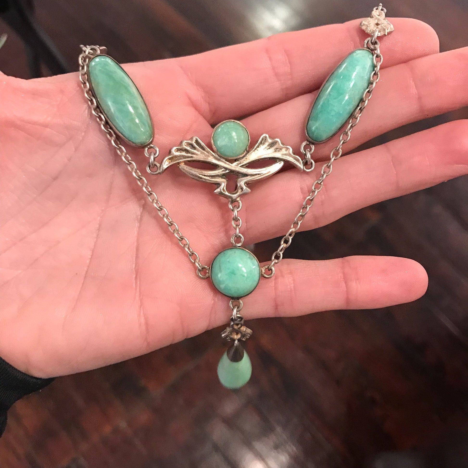 Look at this gorgeous necklace! This one is for the Art Nouveau lover, as you can see in the photo it is just spectacular on. It is so dreamy and romantic! This festoon necklace features green quartz in sterling silver and was made circa 1900. A little bit Art Nouveau, a little Arts & Crafts with a touch of Jugendstil--this piece captures all that was great about the turn of the century!