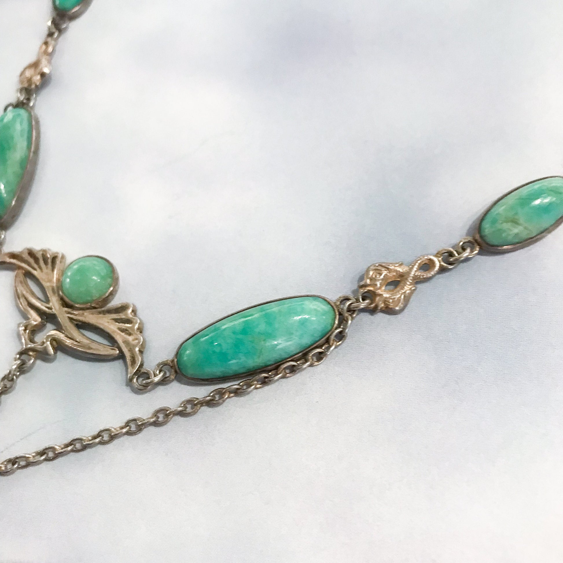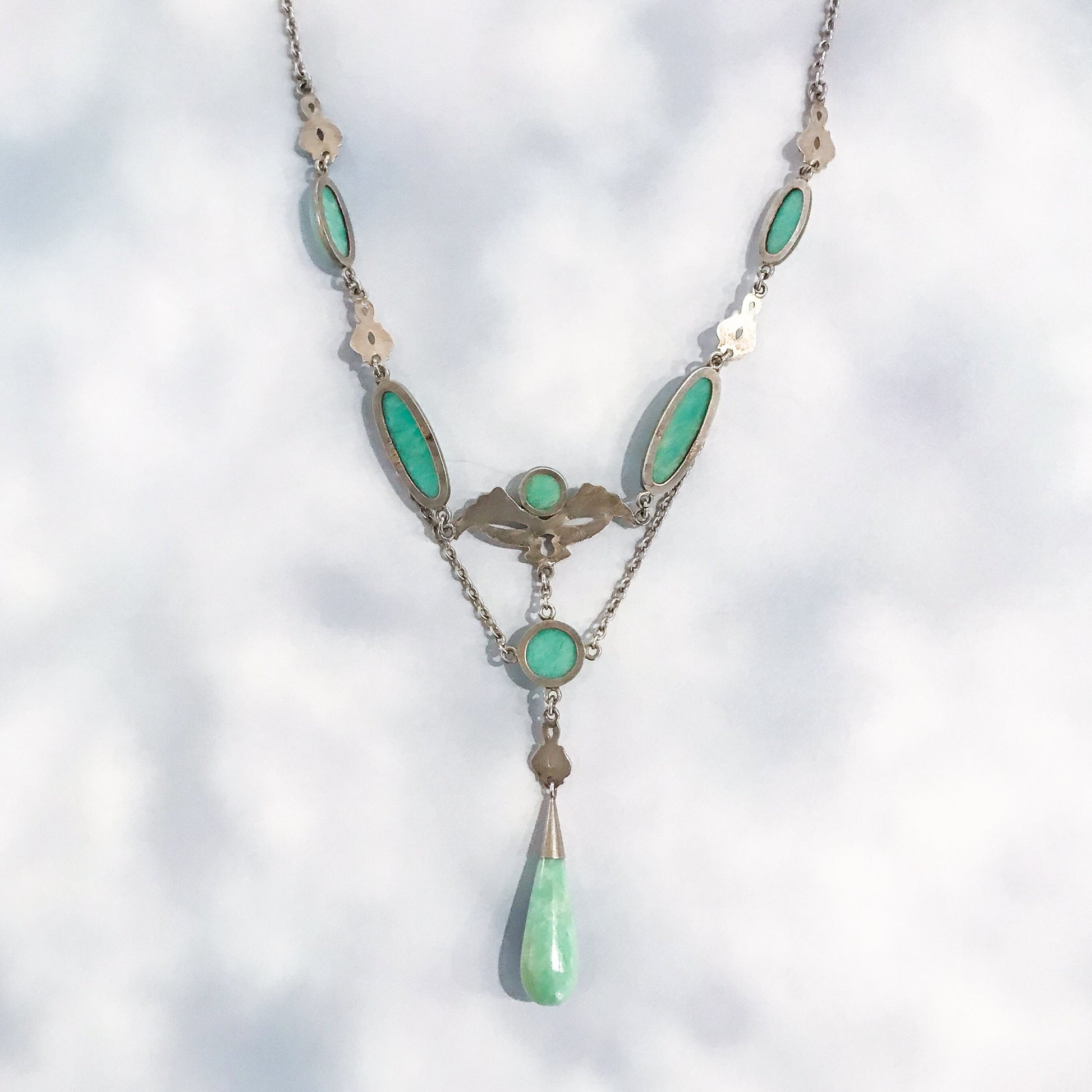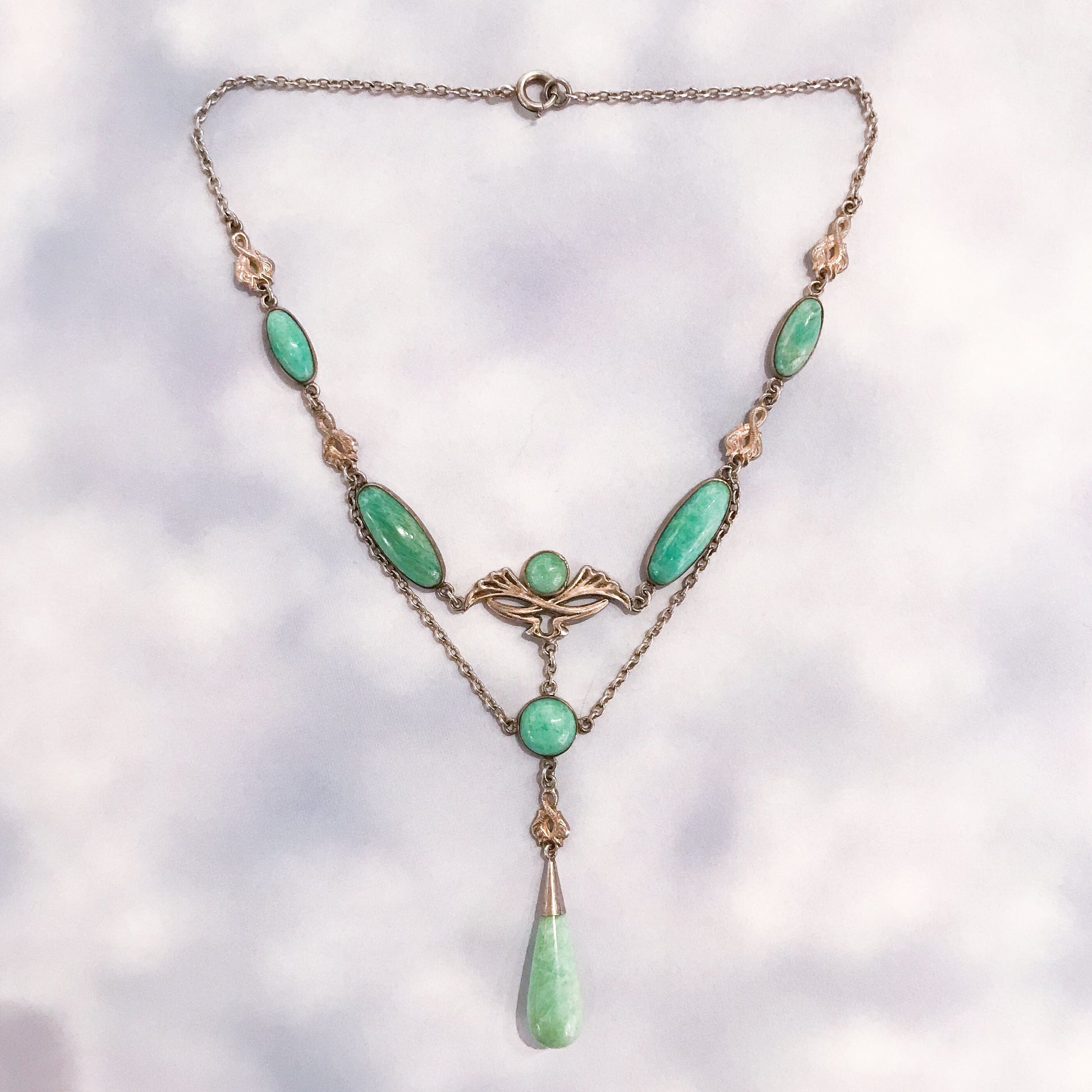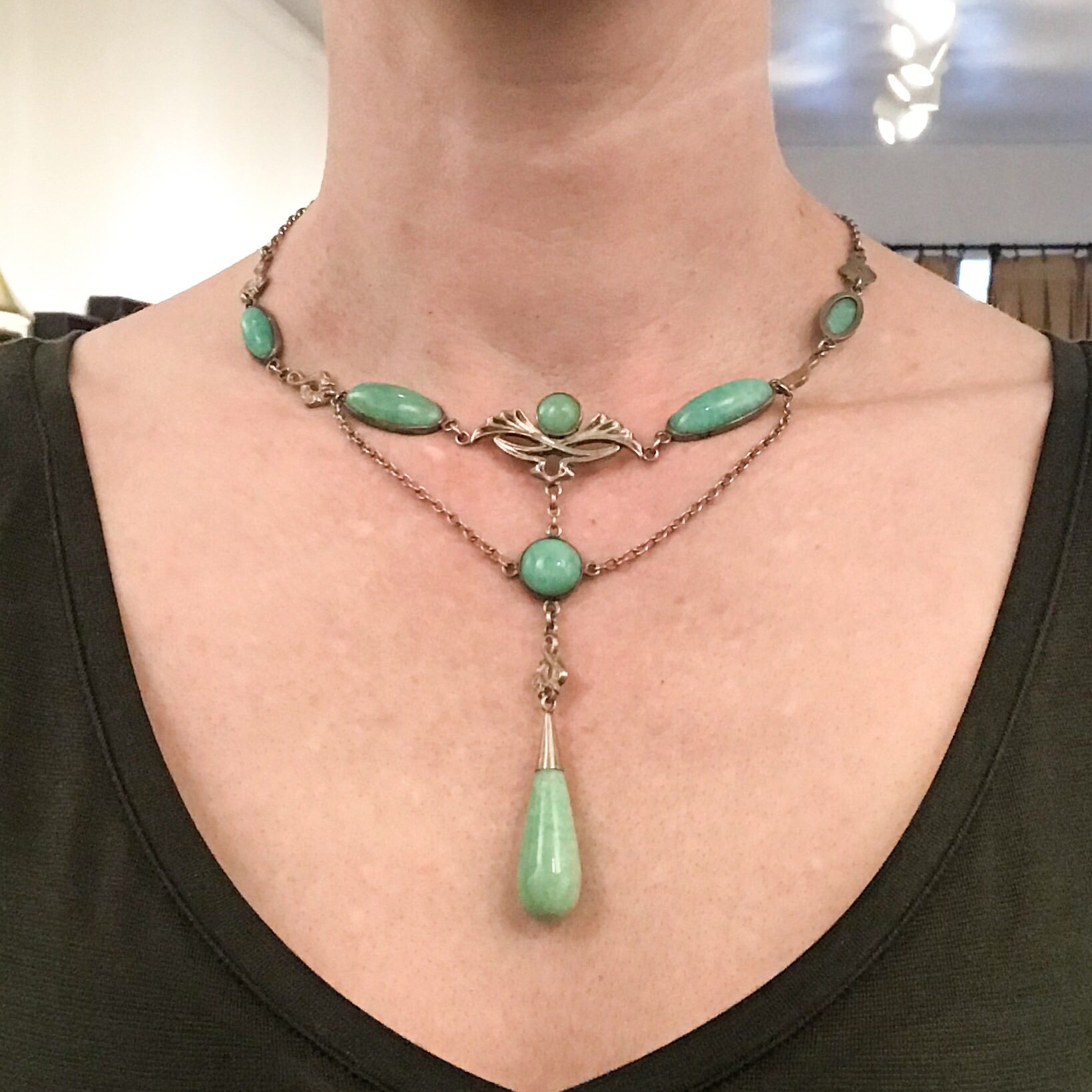 SOLD--Art Nouveau Green Quartz Drop Necklace Sterling c. 1900