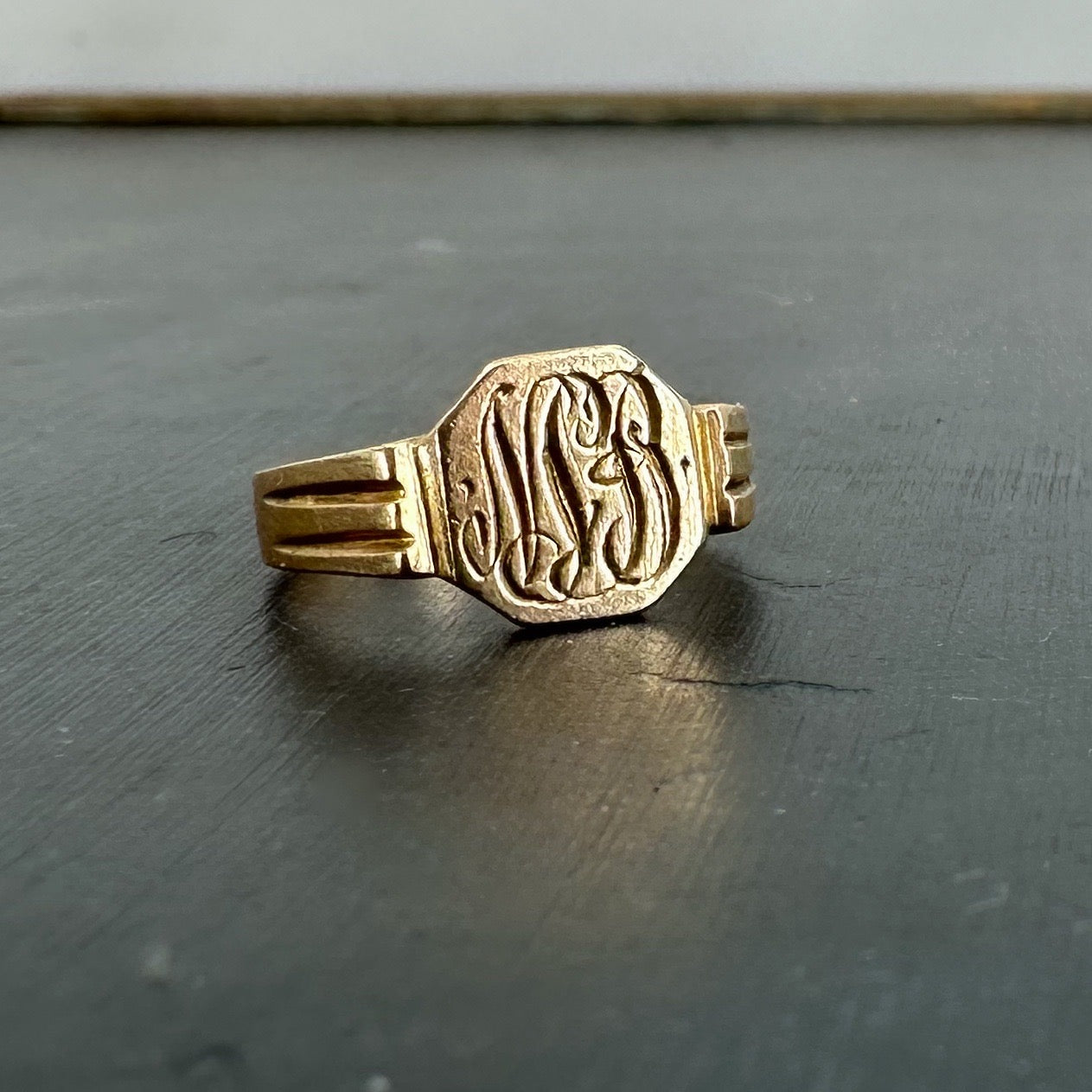 An Art Deco dainty signet ring in 14k circa 1920, nicely designed and really pretty on the hand! Initials appear to be “MSB”.
