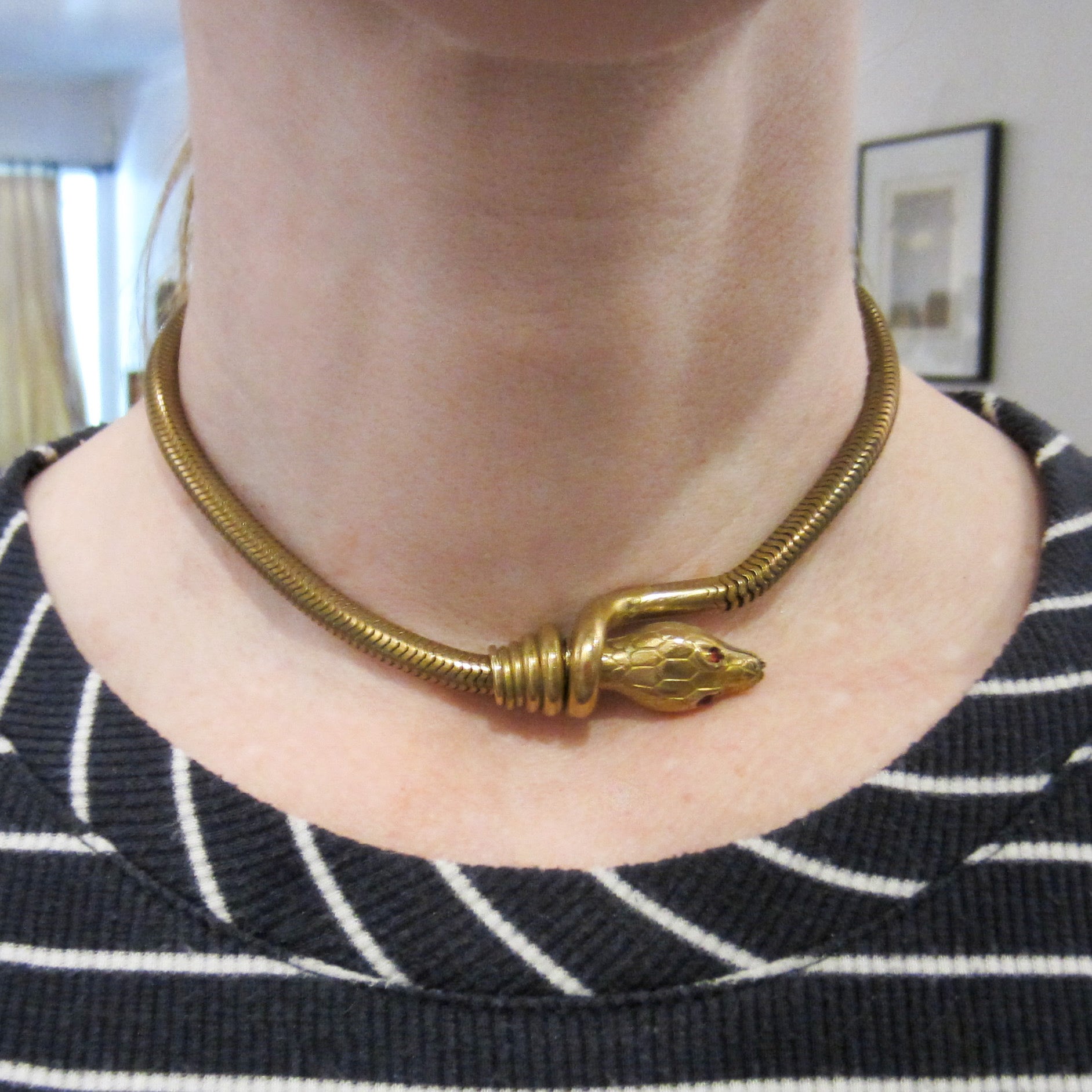 I've seen a lot of Deco snake necklaces in my day, but I've never seen one with this design or clasp mechanism before! This beautifully made piece is from the 1930's and is constructed of gilt brass with little red glass eyes in the head. This is a true choker folks! You're going to need to have a pretty thin neck to wear this comfortably because when it is clasped the wearable length is just 13". Measure your neck before ordering! If you've got that Deco sized neck then you are in for a treat because look at how incredible this piece looks on--I LOVE the way it sits with that asymmetrical coil. This piece looks very German to me in design though there are no marks, but it does have that high quality feel of German Deco snake jewelry. The clasp is so fantastic--so you unscrew the head, put that piece through the smaller opening of the coil, and then screw the head back on. Wow! It is just so chic. Put this snake necklace on and you are truly transported back in time to the Art Deco era, it is too fabulous!!