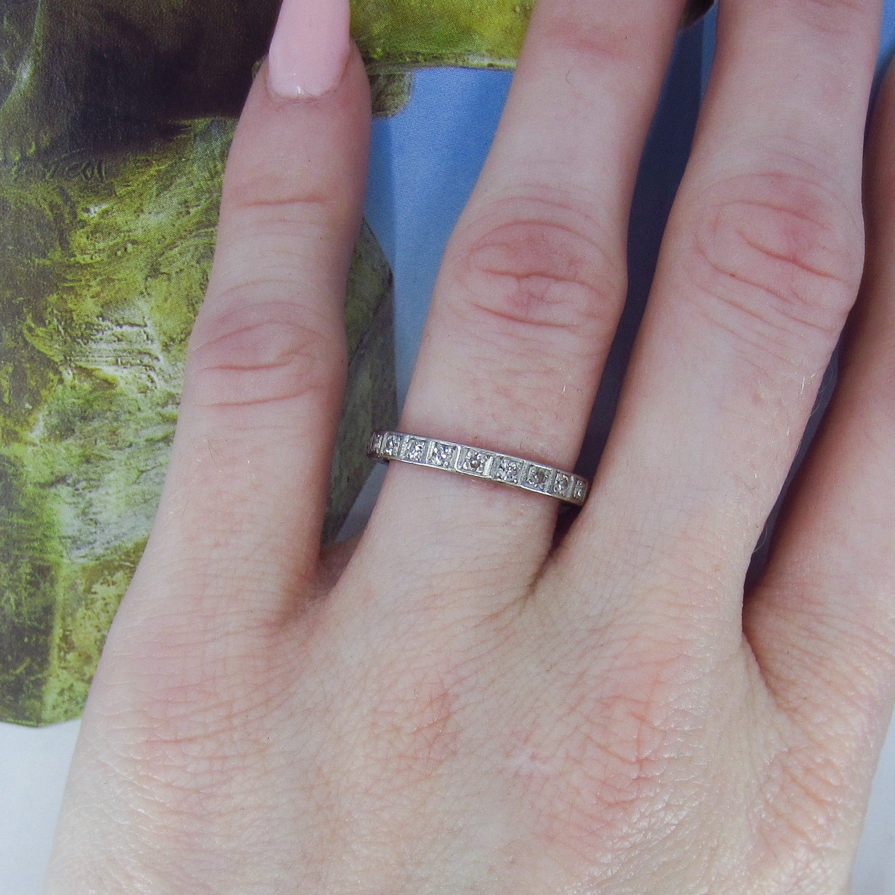 These engraved Art Deco wedding bands are so special—sometimes they’re referred to as “add-a-Diamond” bands as the wearer might add a diamond at any anniversary or at the birth of a child. This band was made in platinum cIrca 1930 and holds ten bead set single cut diamonds with an engraved orange blossom pattern and a wheat pattern on the sides.