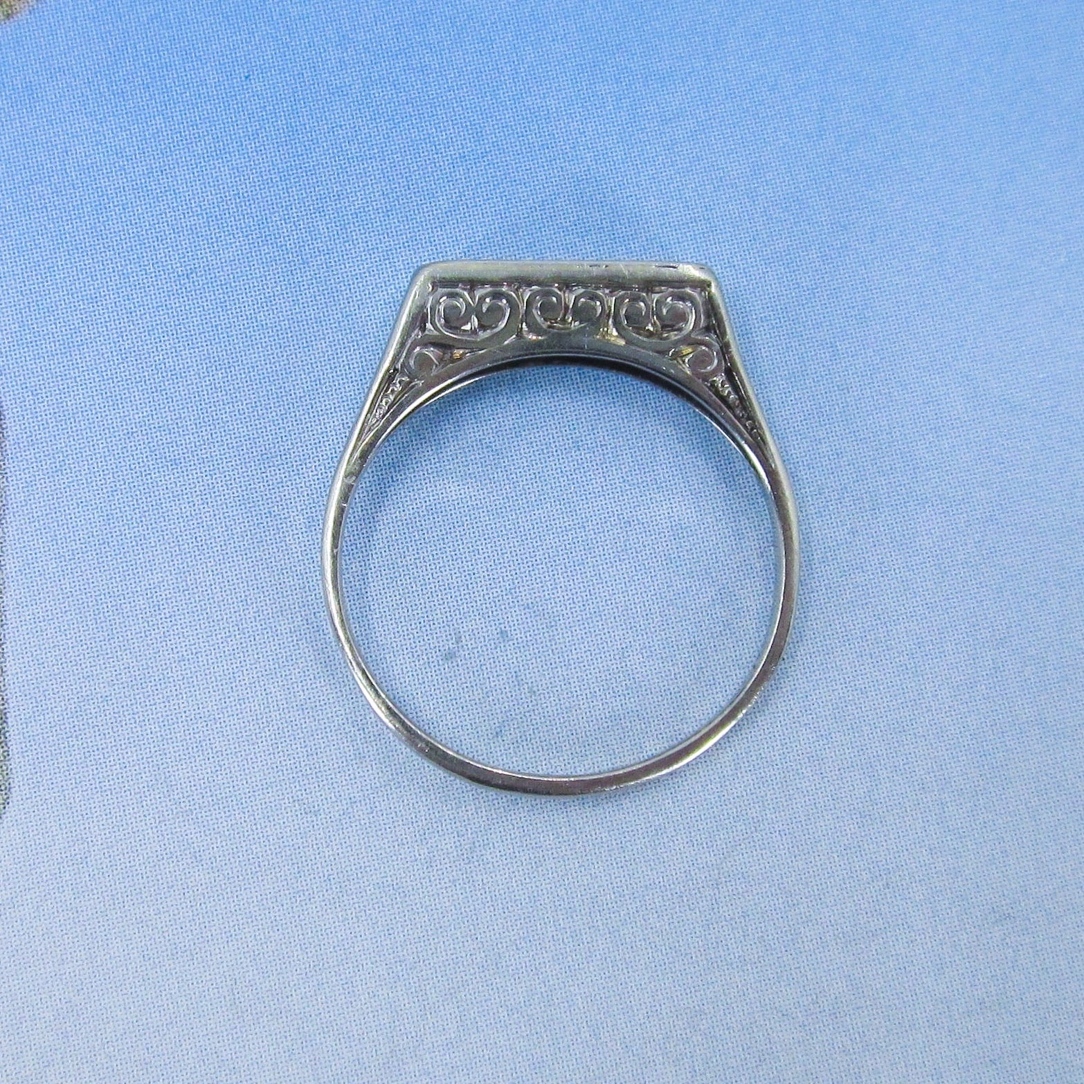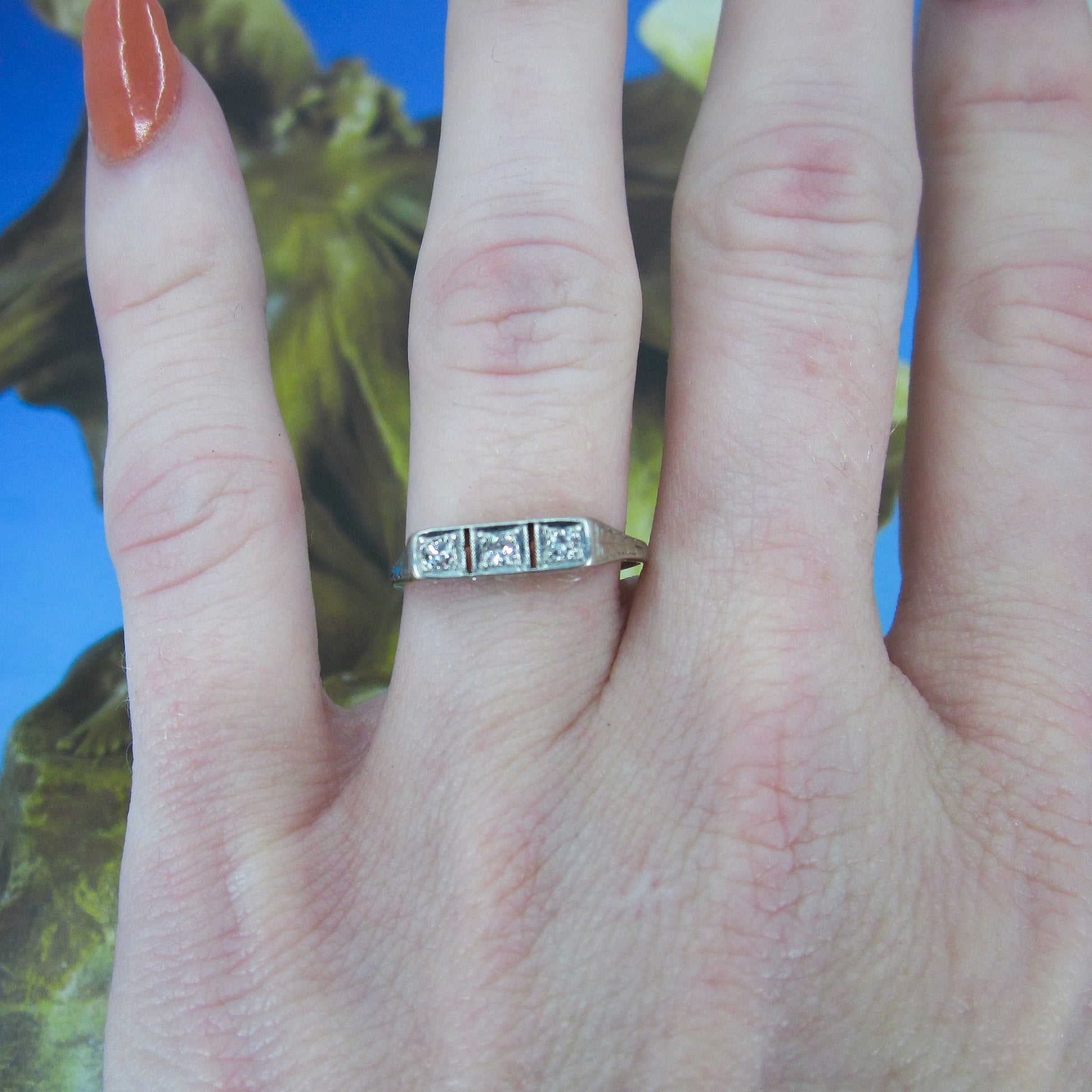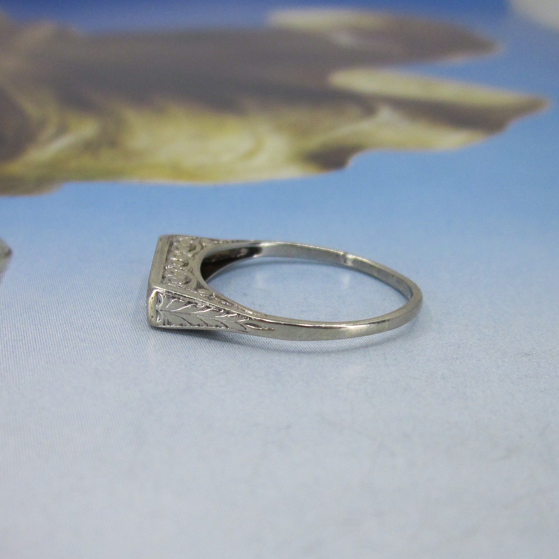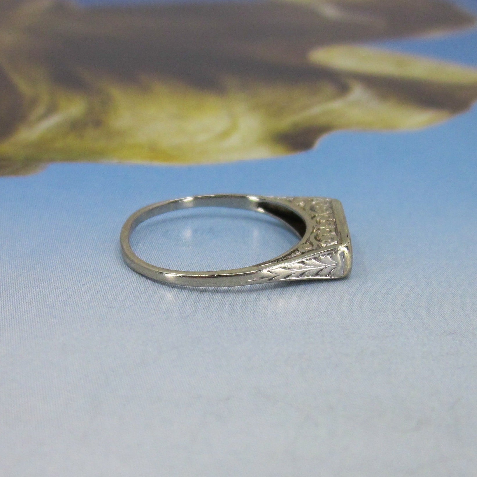 This beautiful Art Deco band packs a lot of great Deco design in a dainty, delicate look. Made cIrca 1920, this ring features three old cut diamonds in 18k white gold with scrolling engraved sides. A great stacker but can also be worn alone—or even as a sweet engagement ring!