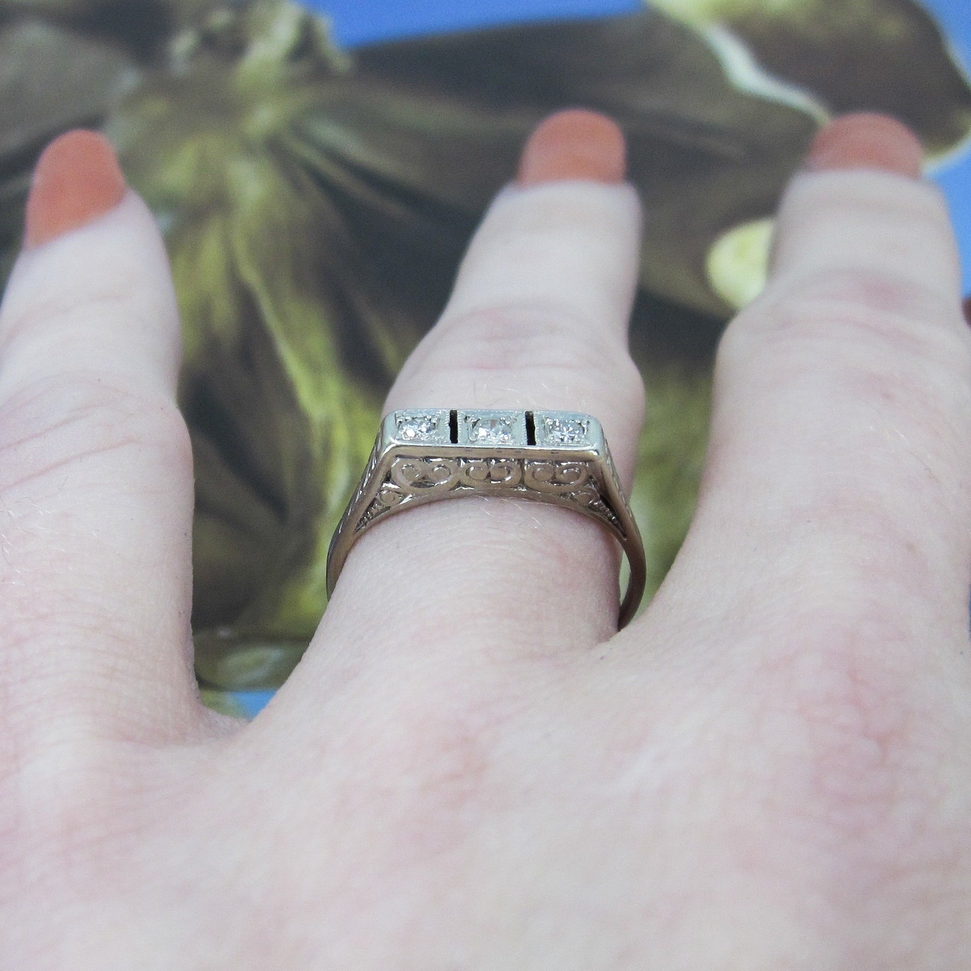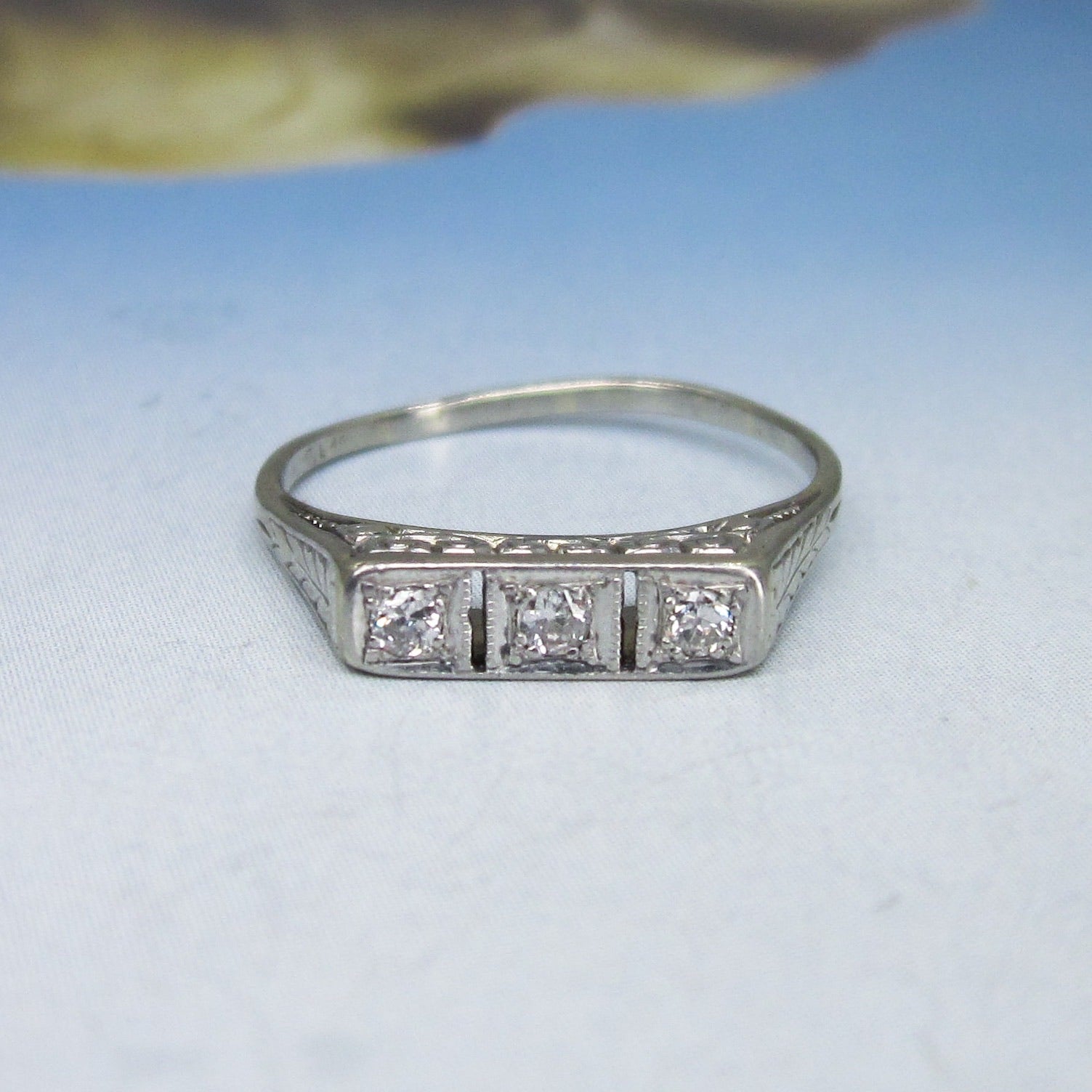 SOLD--Art Deco Three Diamond Engraved Band 18k c. 1920