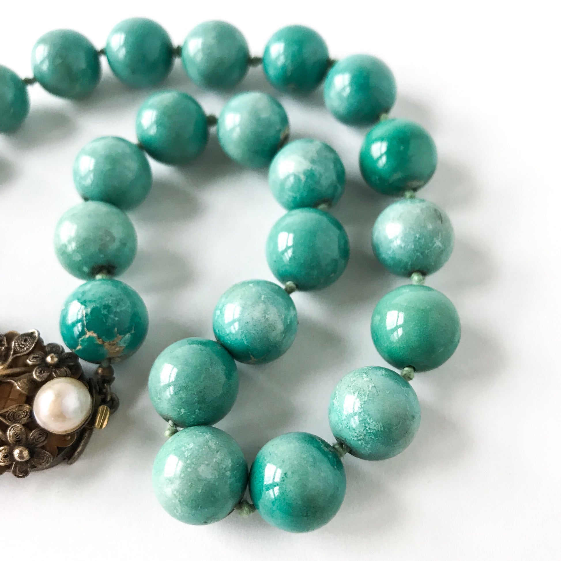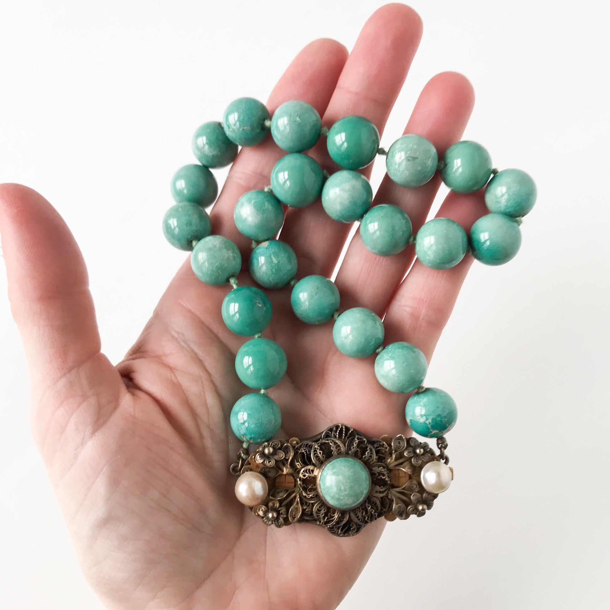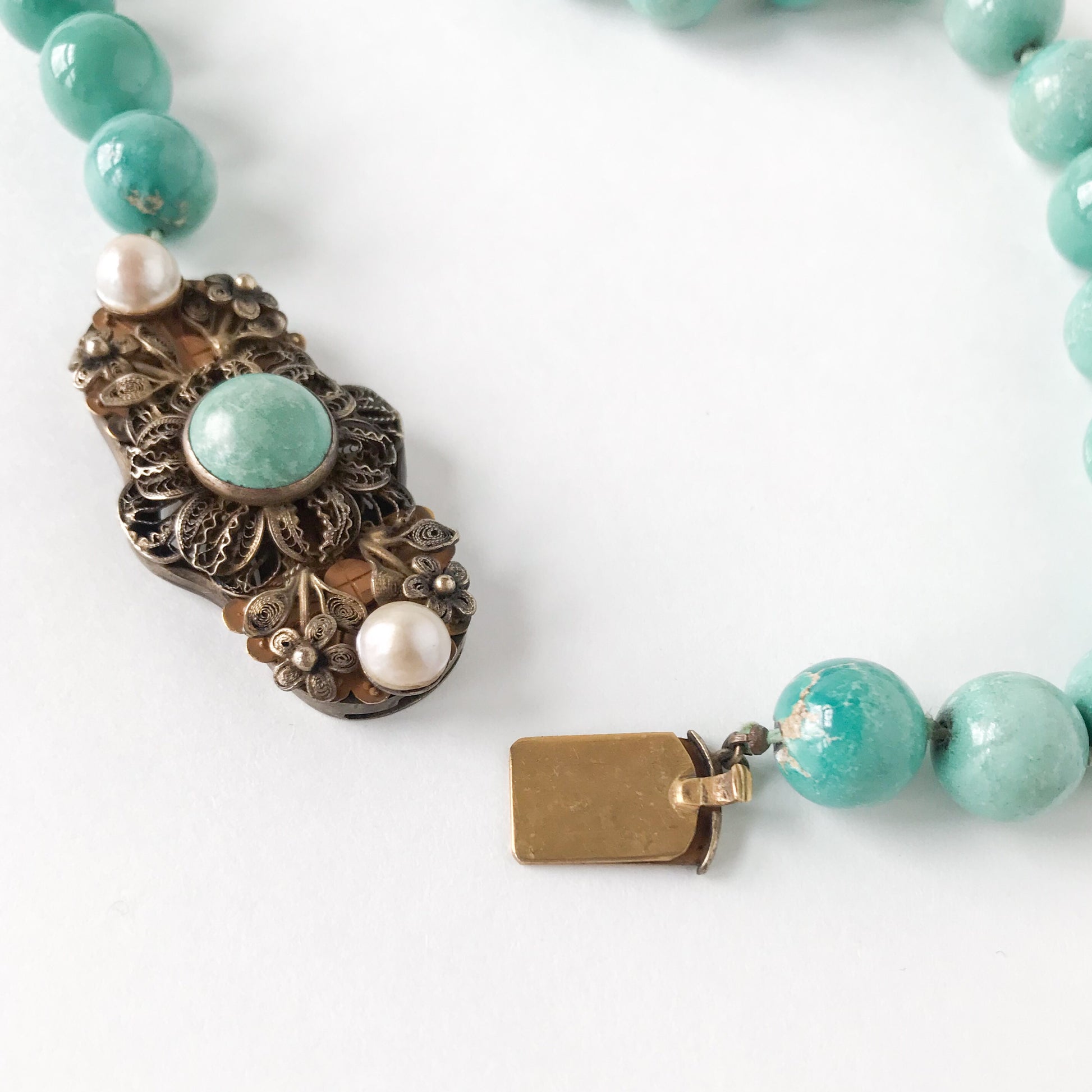 Look at this gorgeous Art Deco era necklace! Made circa 1930's with round turquoise beads of the most gorgeous green-blue color and topped off with a large gilt silver filigree clasp with turquoise and pearls. If you look closely at the clasp you can see that it has multiple textured layers, it is really special. Wear the clasp in the front or back, it looks amazing either way!