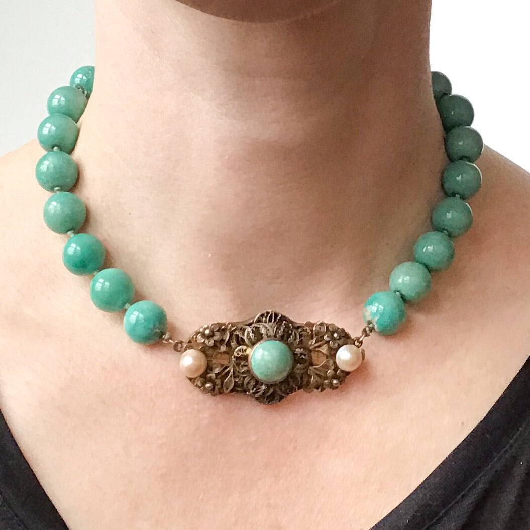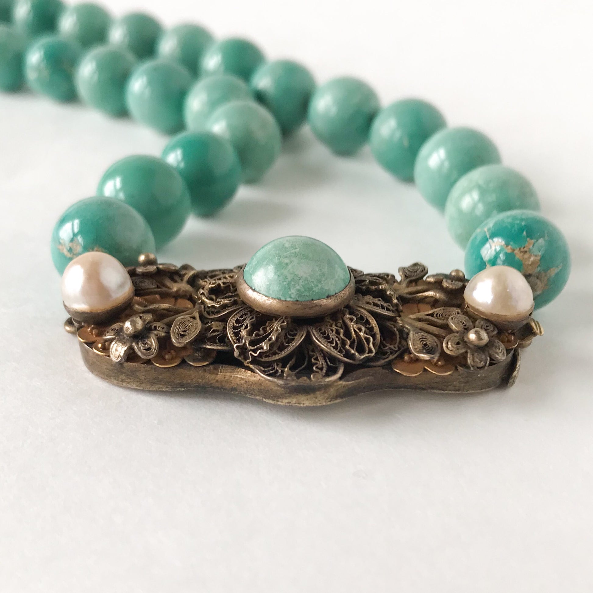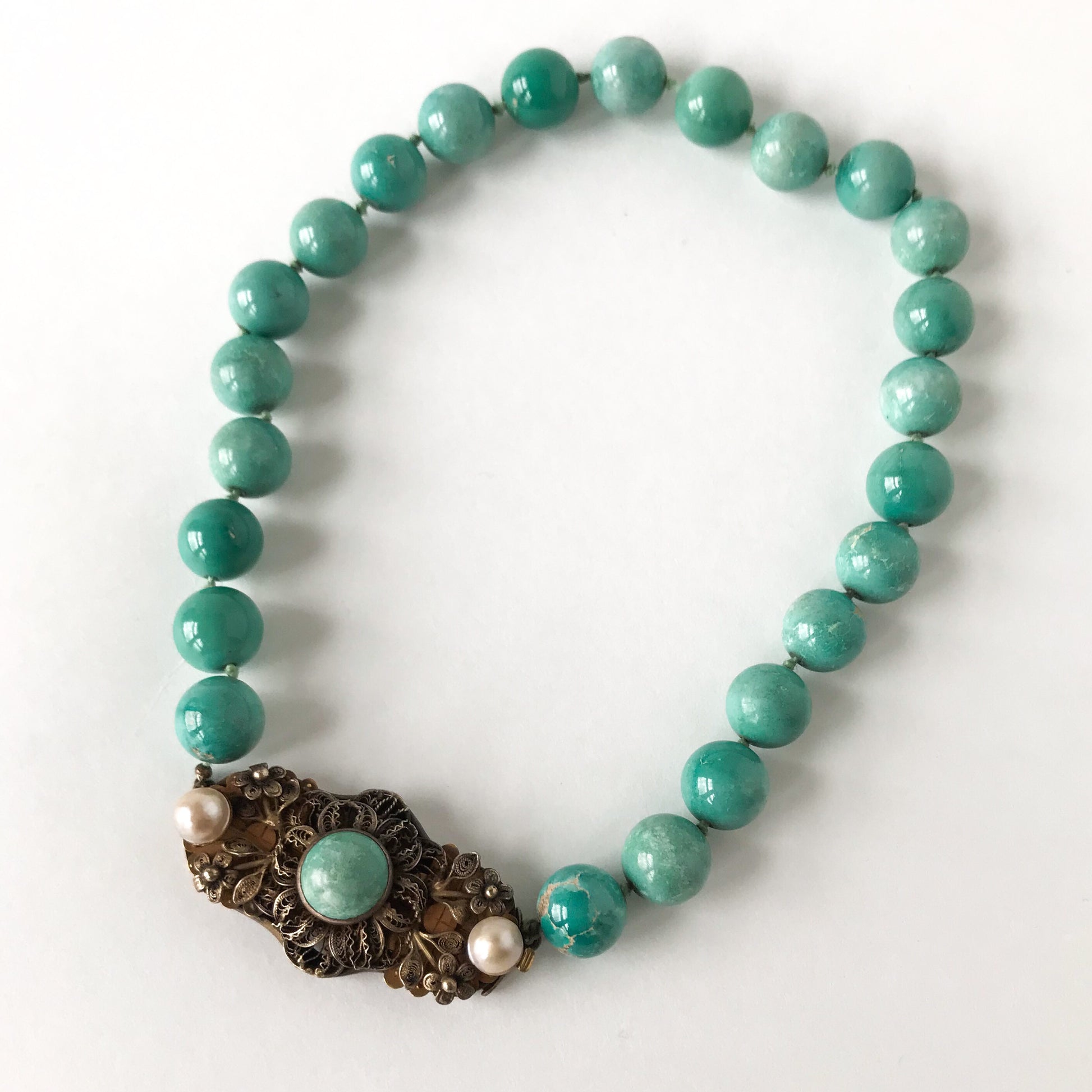 Look at this gorgeous Art Deco era necklace! Made circa 1930's with round turquoise beads of the most gorgeous green-blue color and topped off with a large gilt silver filigree clasp with turquoise and pearls. If you look closely at the clasp you can see that it has multiple textured layers, it is really special. Wear the clasp in the front or back, it looks amazing either way!
