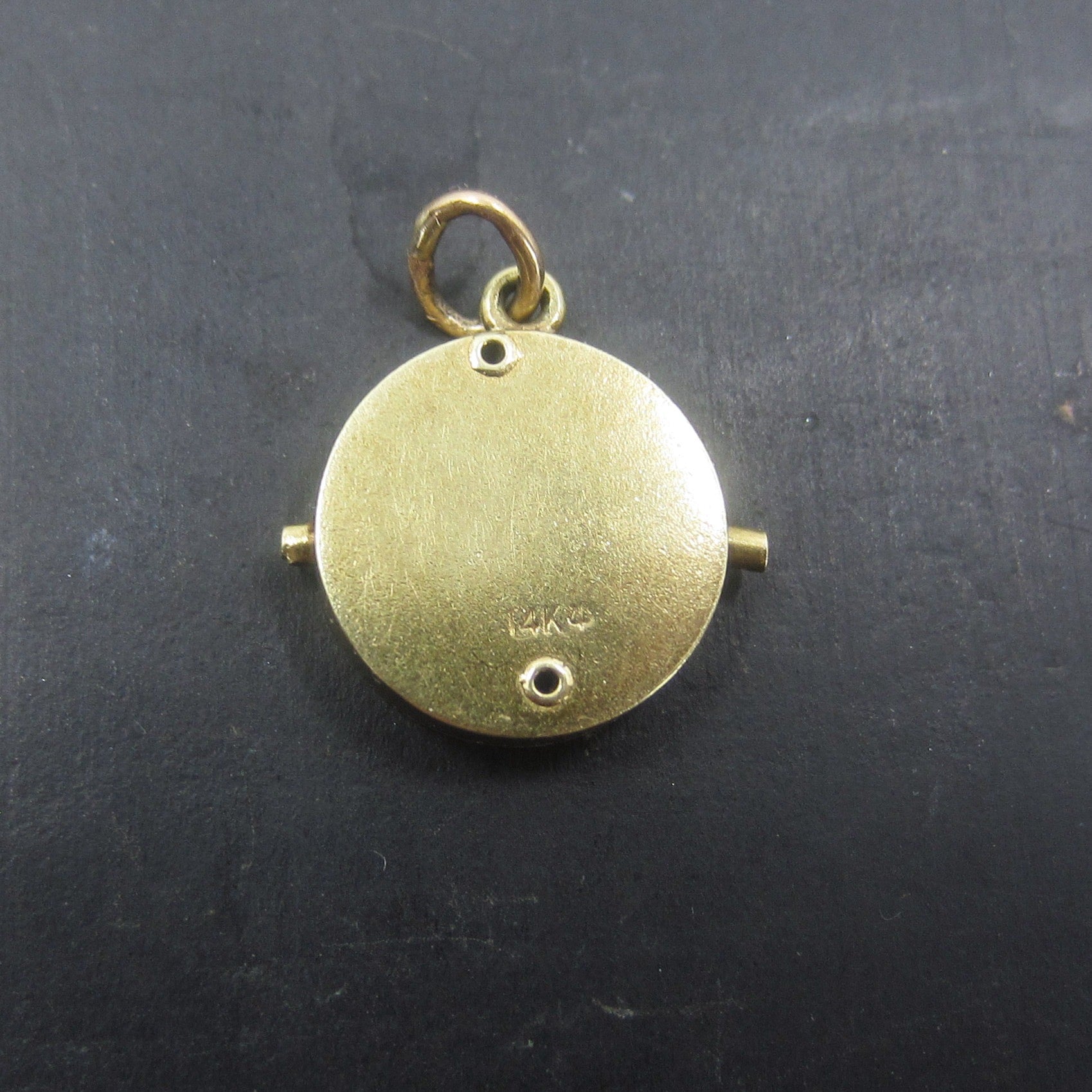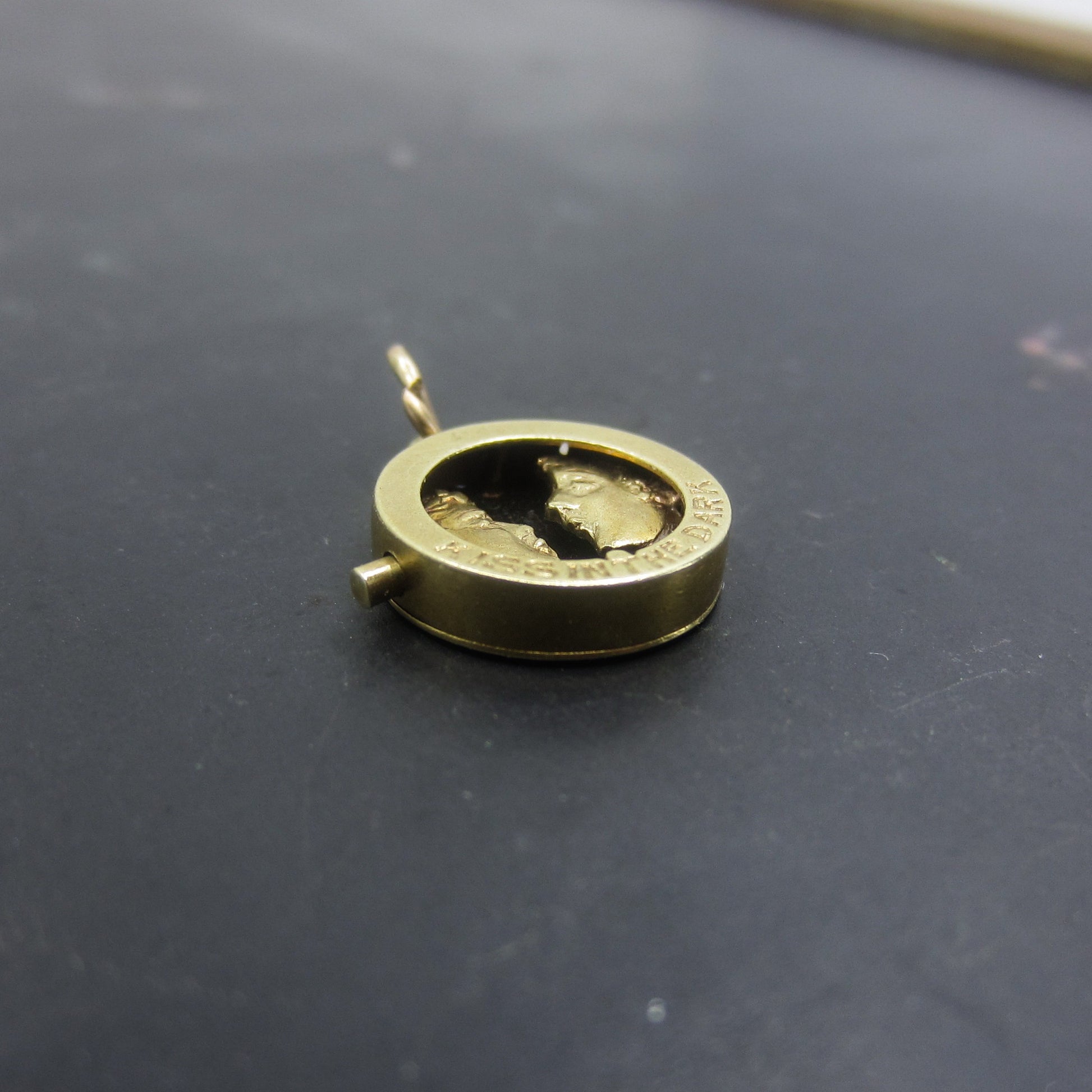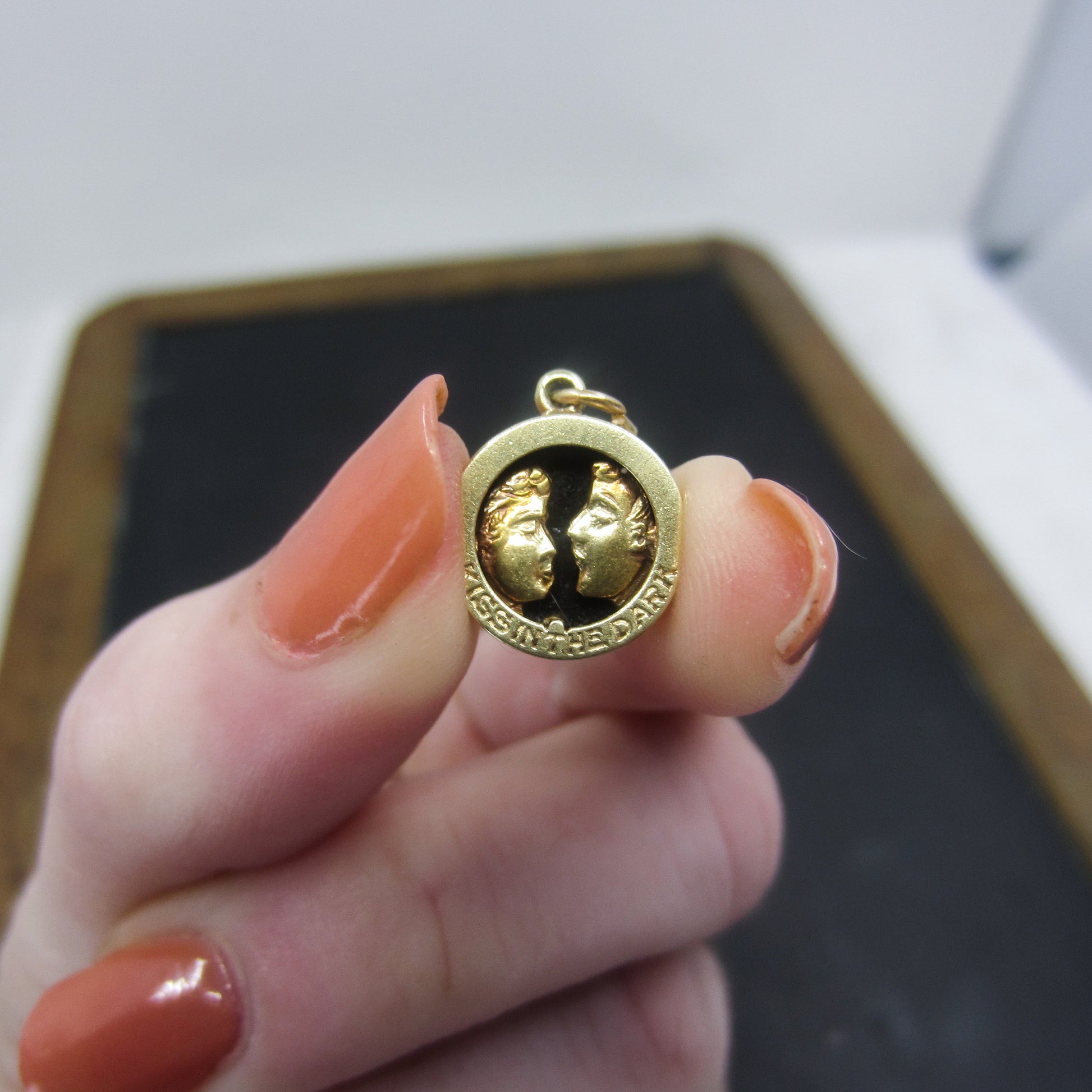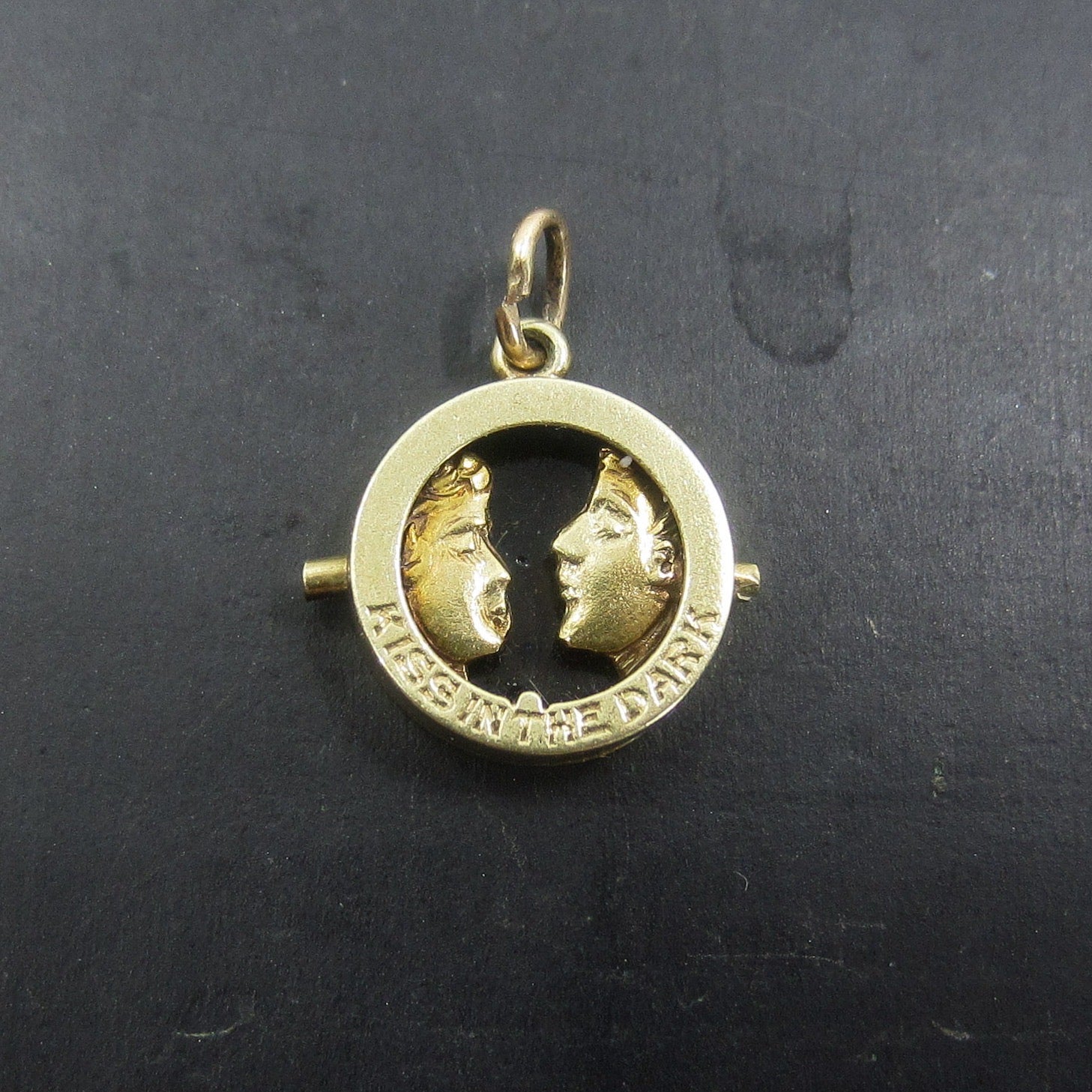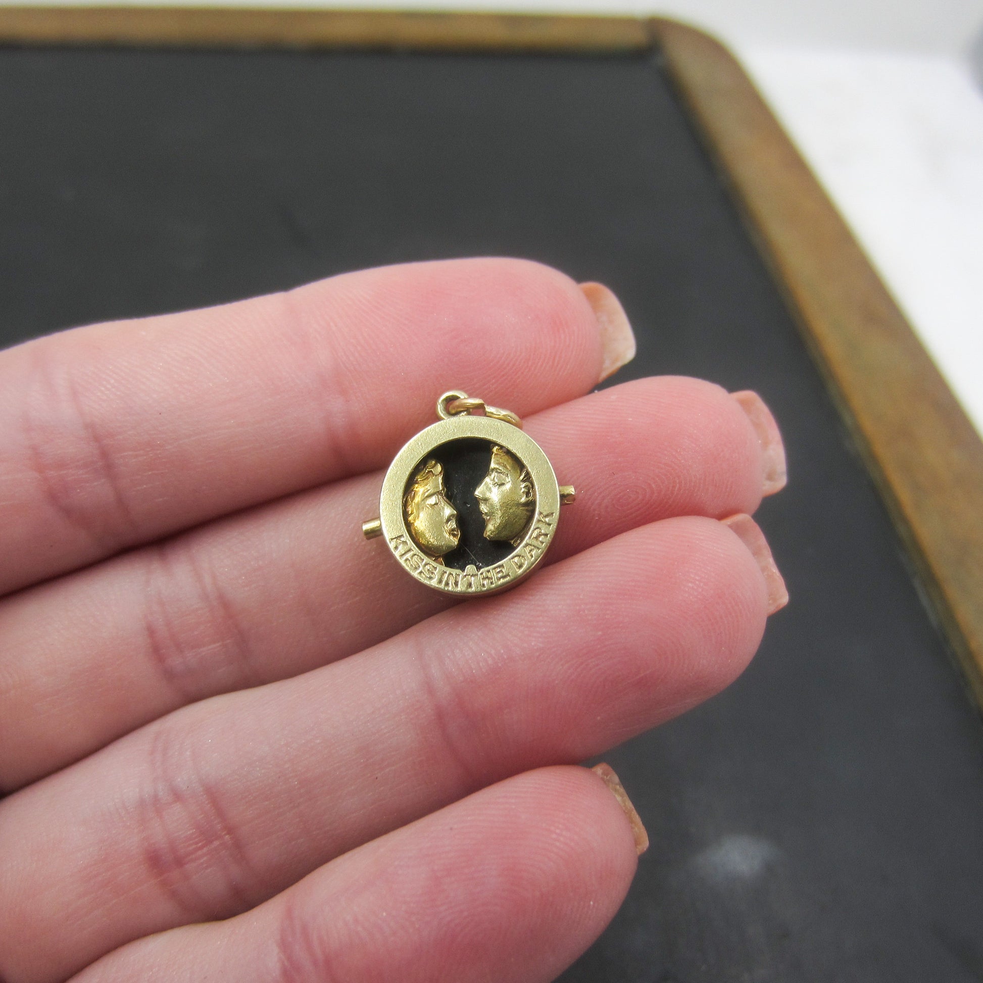 This is a rare charm, made in 14k by Sloan & Co circa 1930's-40's. Engraved "KISS IN THE DARK", this figures of this charm move towards each other to kiss when you depress the buttons on either side. A black enamel background provides the "dark"! A delightful and difficult to find piece for the hardcore romantic or charm collector!