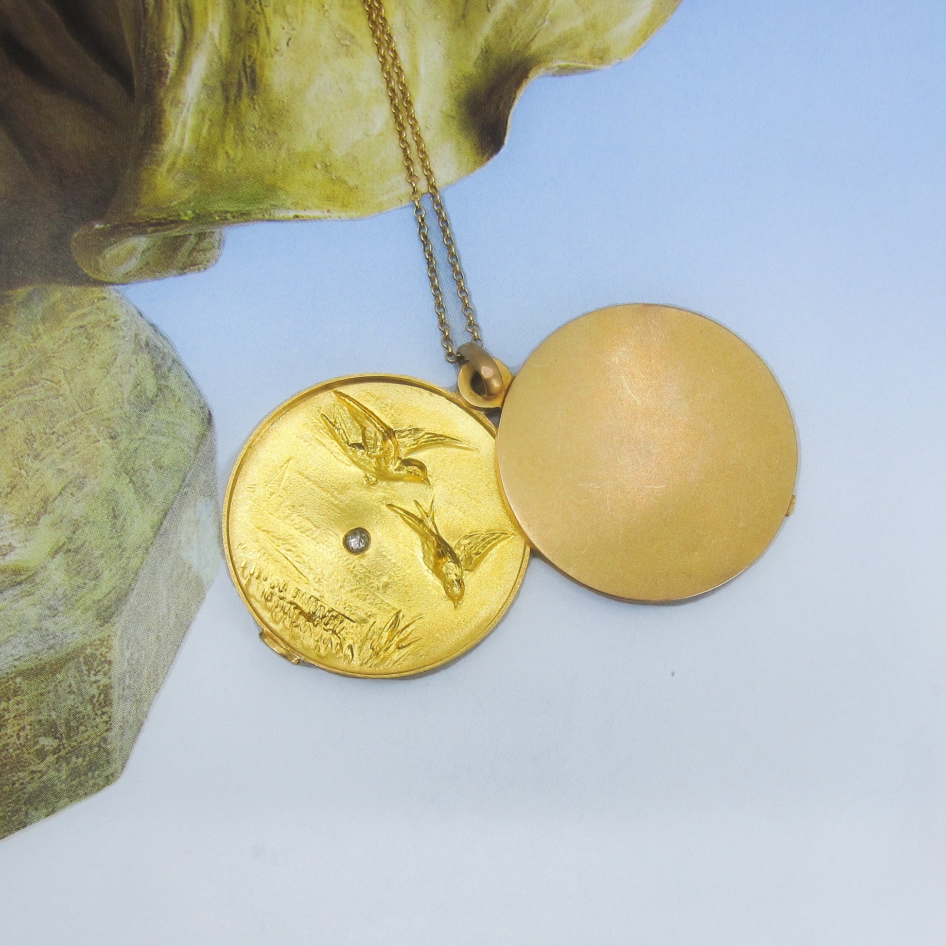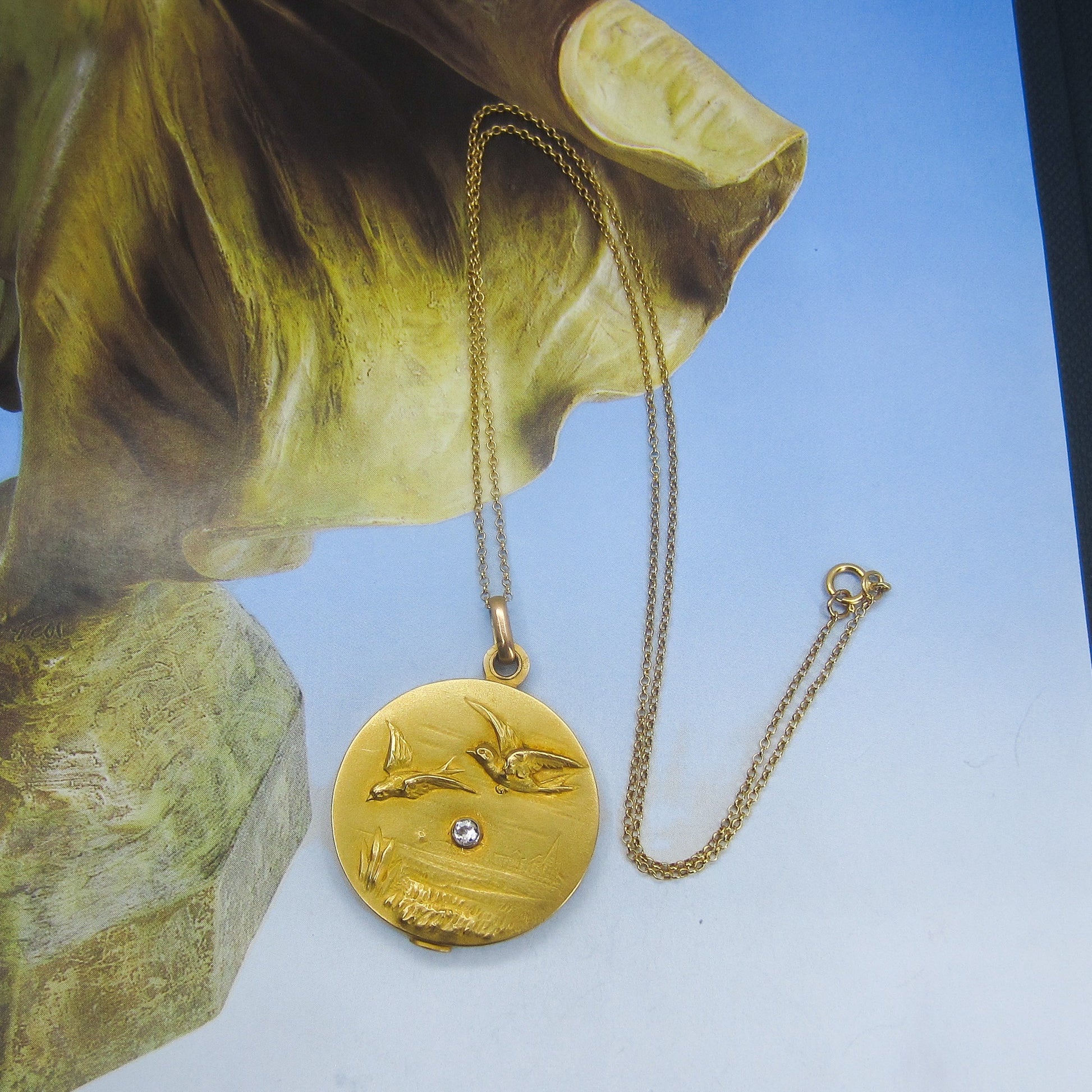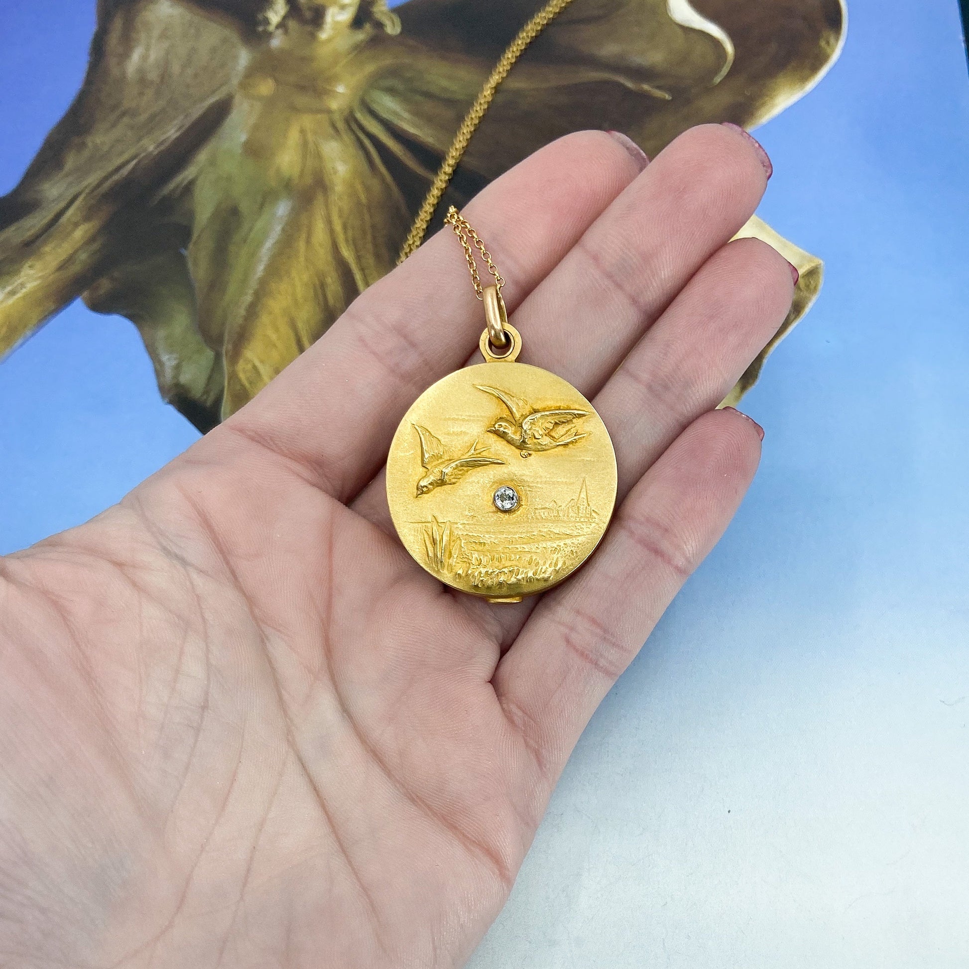 This exquisite locket straddles both the Art Nouveau style of design as well as the Victorian Aesthetic period, both of which happened concurrently in the late 1800's. Made in France circa 1890, this locket features two swallows flying over a landscape with a platinum bezel set Old Mine Cut diamond. This is a French piece so it is the French gold standard of 18k and boy is it GOLDEN. In the Victorian period swallows symbolized eternal love and partnership, as swallows mate for life. The fact that we see two swallows here adds an extra romantic vibe to an already extremely romantic piece!