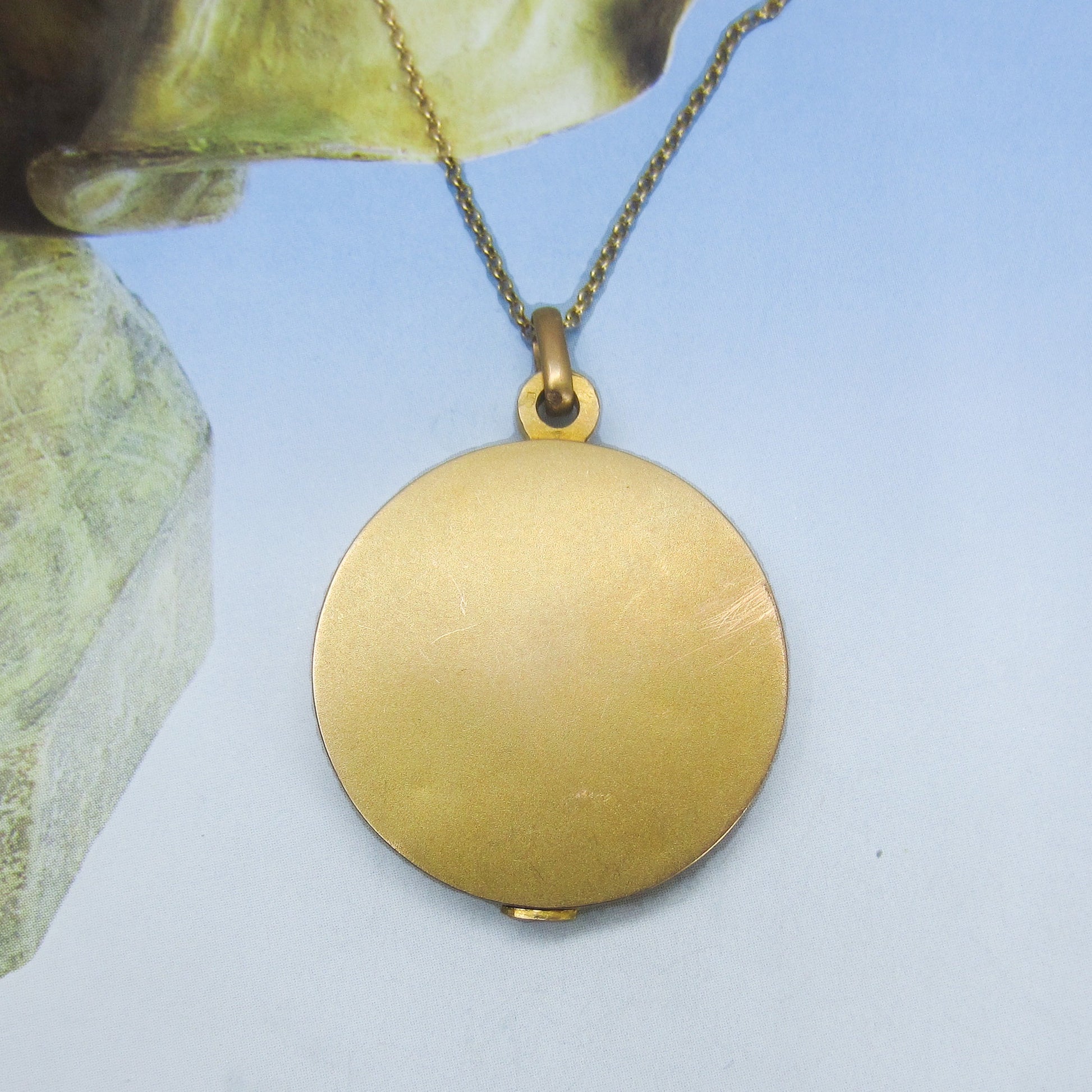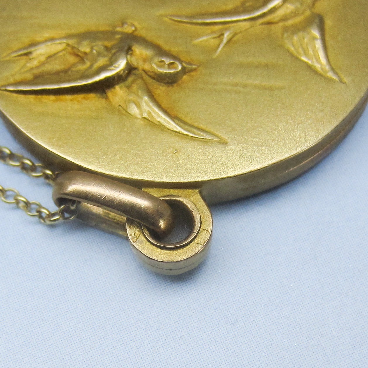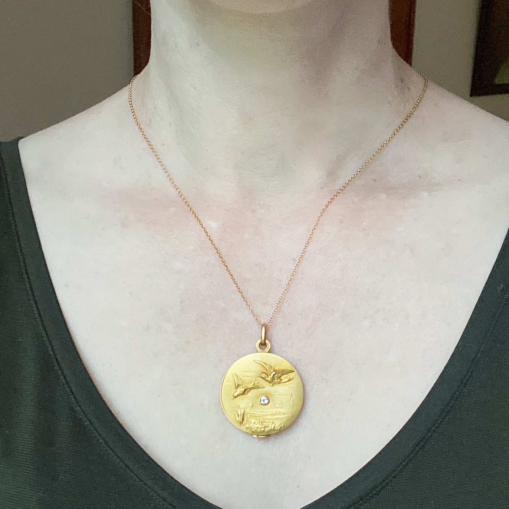This exquisite locket straddles both the Art Nouveau style of design as well as the Victorian Aesthetic period, both of which happened concurrently in the late 1800's. Made in France circa 1890, this locket features two swallows flying over a landscape with a platinum bezel set Old Mine Cut diamond. This is a French piece so it is the French gold standard of 18k and boy is it GOLDEN. In the Victorian period swallows symbolized eternal love and partnership, as swallows mate for life. The fact that we see two swallows here adds an extra romantic vibe to an already extremely romantic piece!