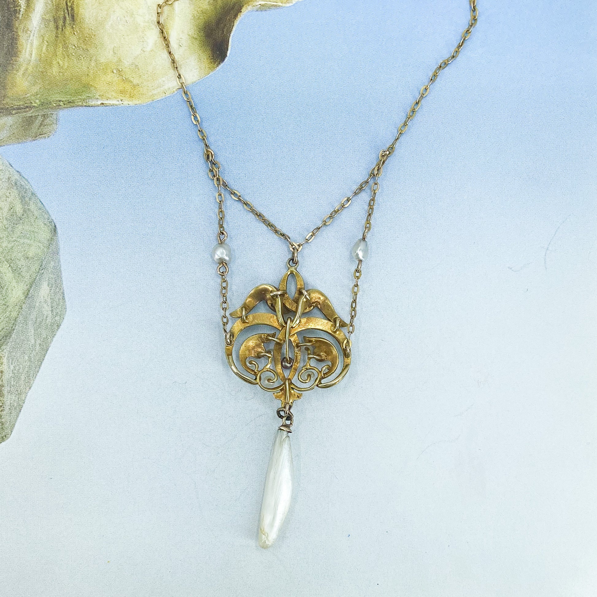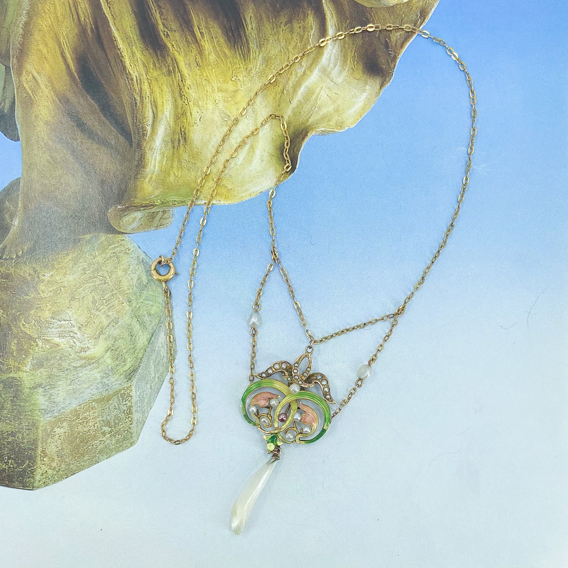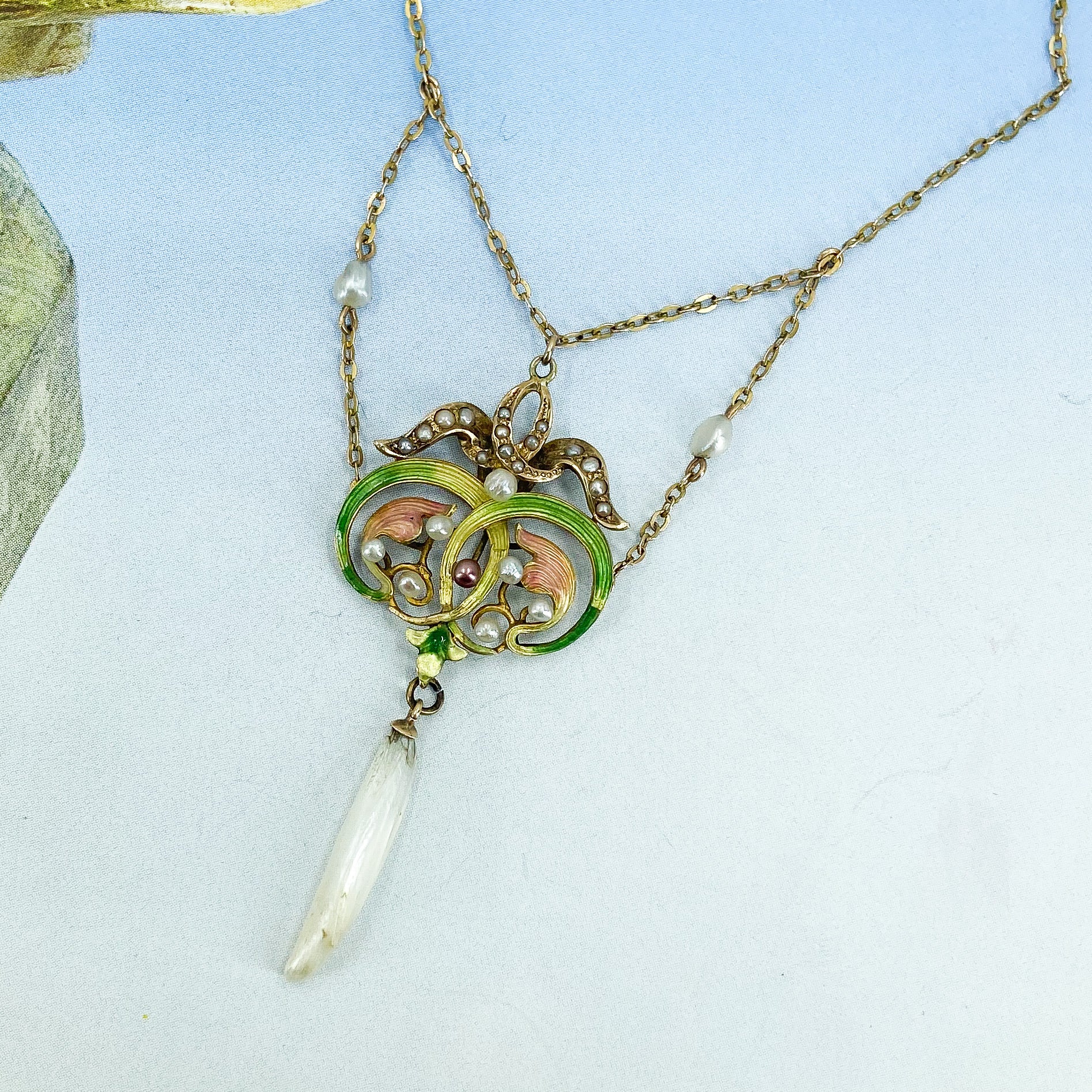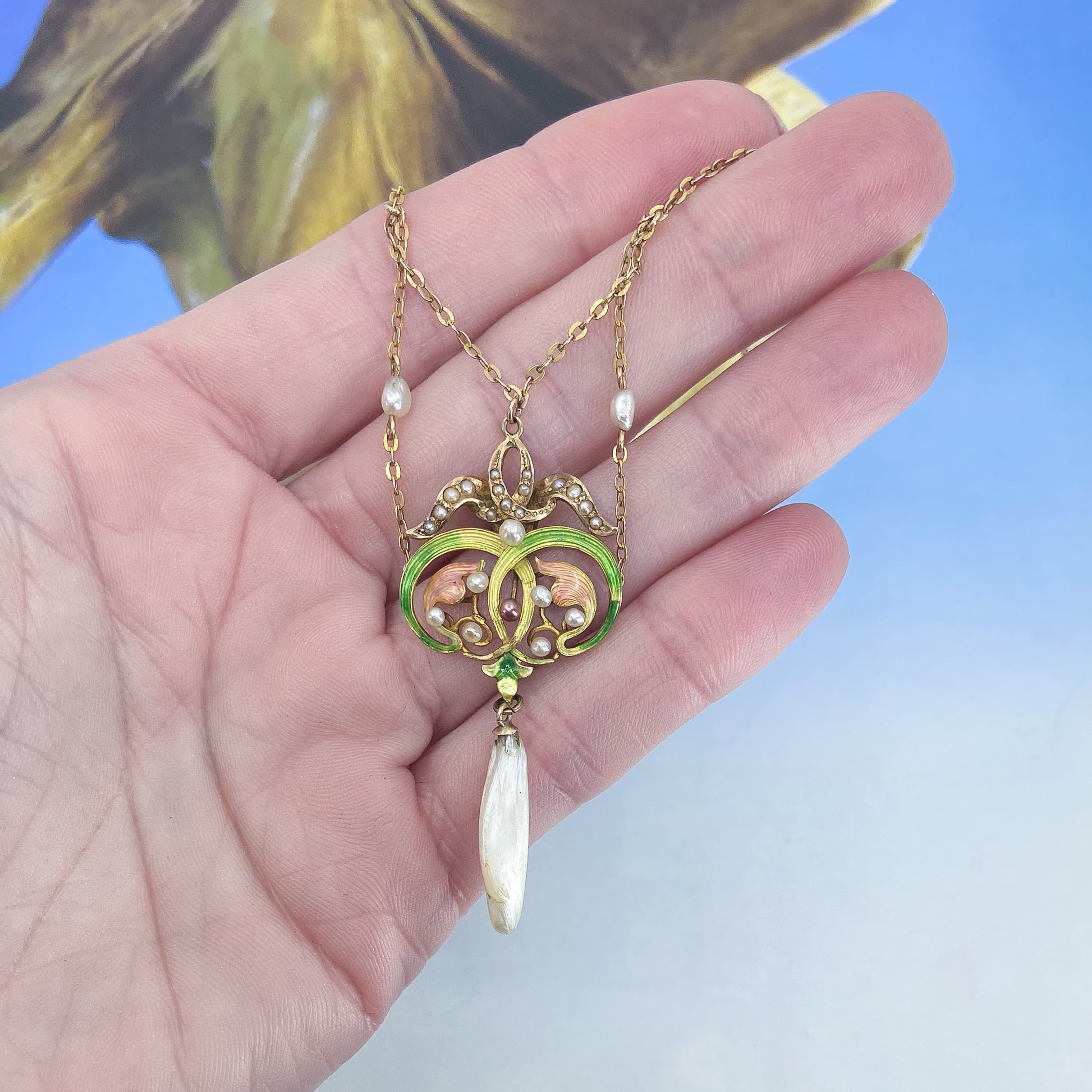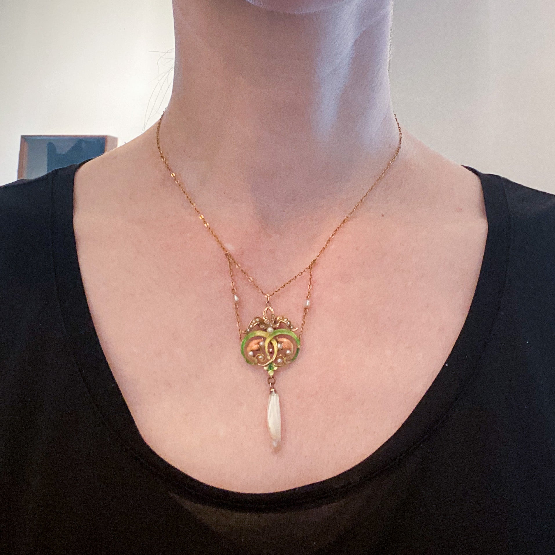 This ethereal necklace is from the heart of the Art Nouveau period, circa 1890s. What an amazing time in design history that was, can you imagine being surrounded by objects and architecture and jewelry that looked like this?!! This necklace has layers of iridescent green, pink and white enamel set over an arabesque style pendant dotted with seed pearls, and a long natural tooth pearl drop. Two natural pearls are stationed in each length of the festoon chain. As you can see in the photo of the necklace on, this piece is vibrant yet delicate, and ultra feminine. Another miniature, wearable work of art from over 100 years ago, this is a jewel in every sense of the word!