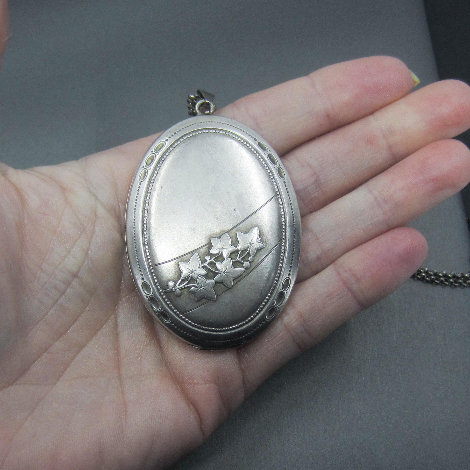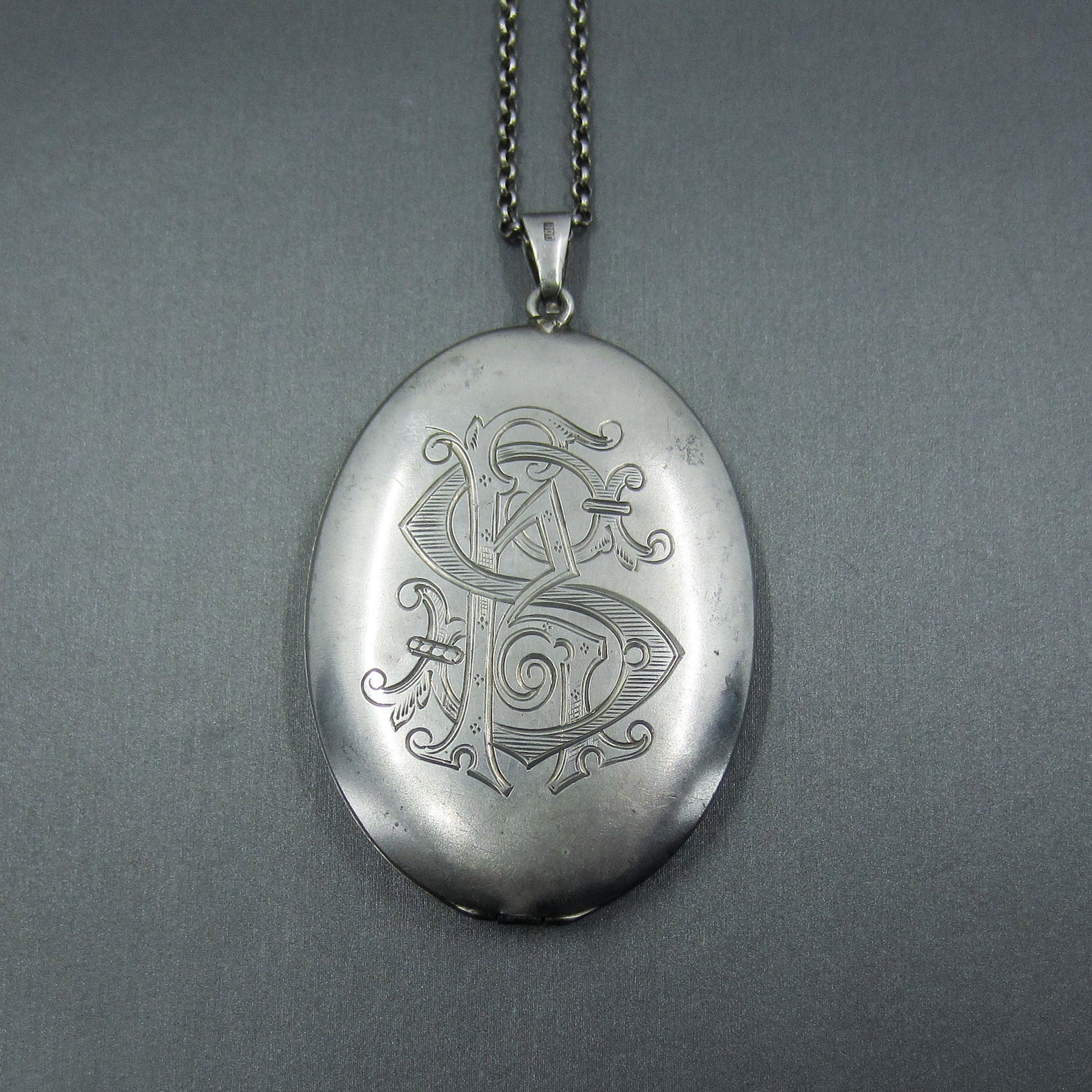I love this GORGEOUS locket! Made in Germany circa late 1800's, this is designed in the Bohemian Art Nouveau style of the area called Jugendstil. A sprig of ivy climbs asymmetrically up this locket, set within two dotted frames in 800 sterling silver, the German standard. In Victorian jewelry, an ivy motif signifies fidelity, so this was no doubt a romantic gift of the period. Engraved on the back with initials and there is definitely an "S" in there but the other letters morph into each other in such a way that I can't quite make out the rest. This locket is big, measuring 2 3/4" length including the bail. Absolutely lovely!
