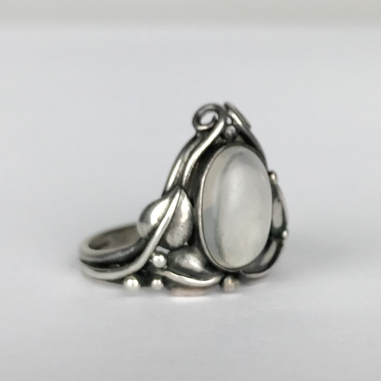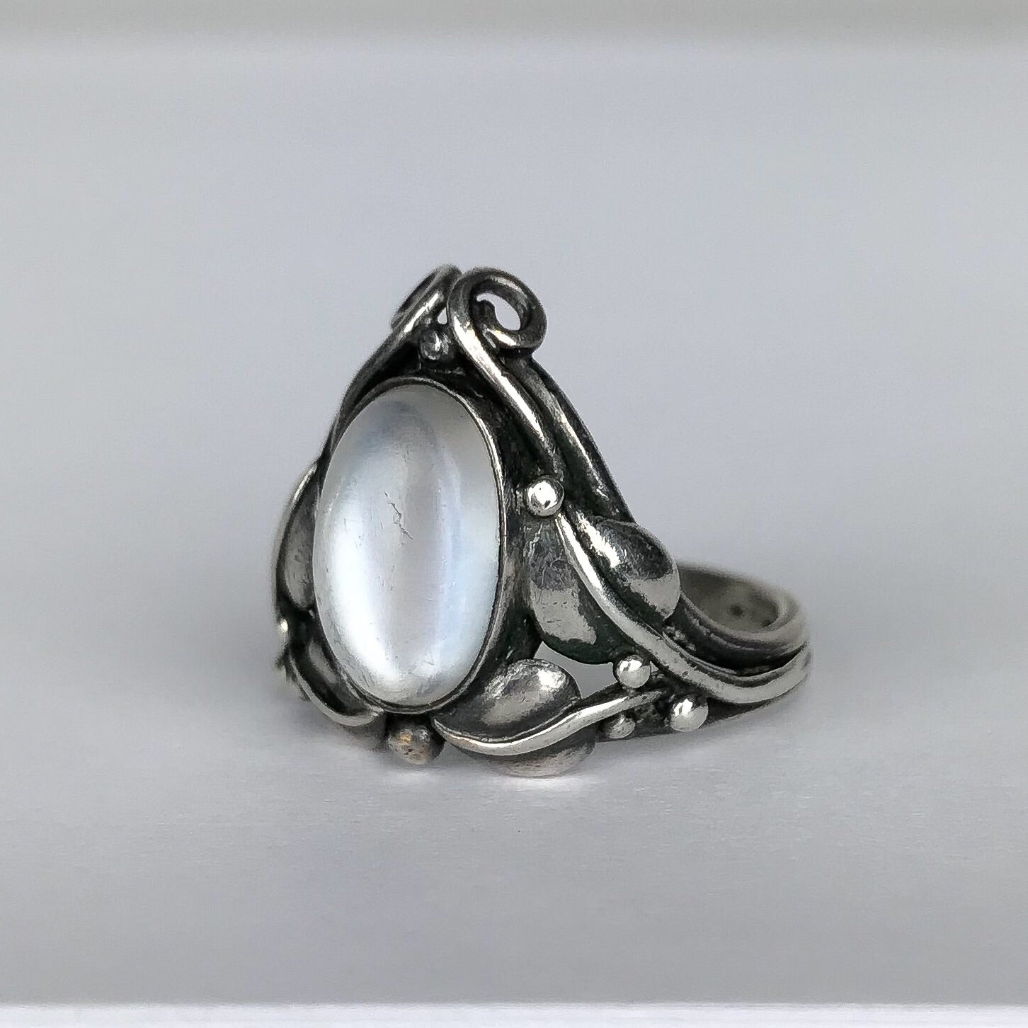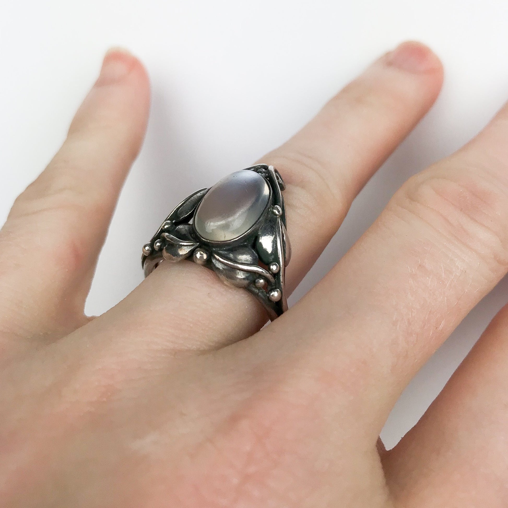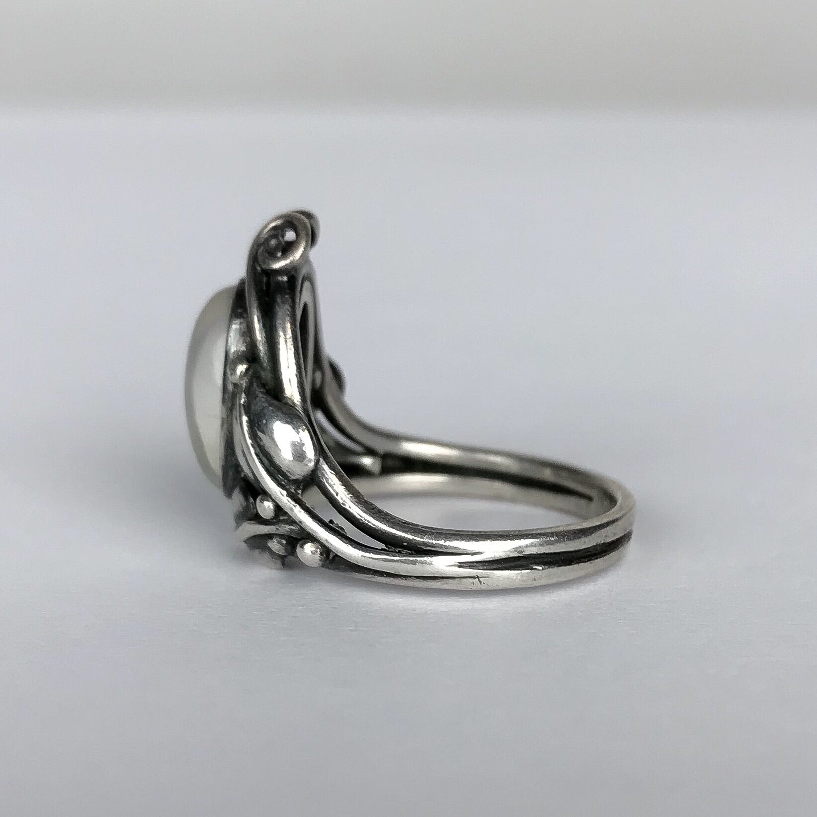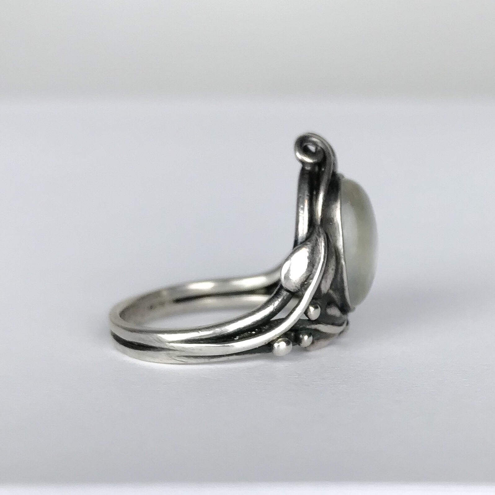 This is a beautiful, unusual handmade Art Nouveau/Arts & Crafts era ring with a central bezel set oval cabochon moonstone in a leafy frame of sterling silver circa 1900. This stone has lovely blue adularescence, which is that mysterious glow that all good moonstones have. The shape of this ring is interesting, as it sits on your finger like a little crown! It would make an AMAZING pointer finger ring.