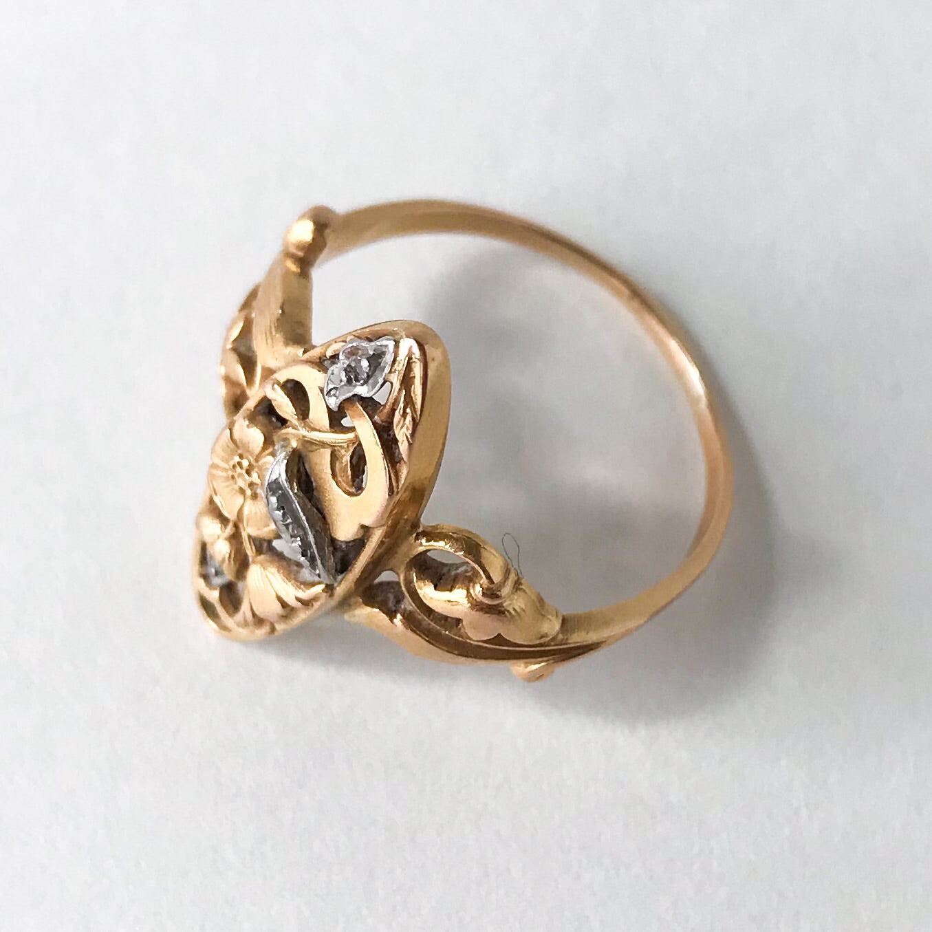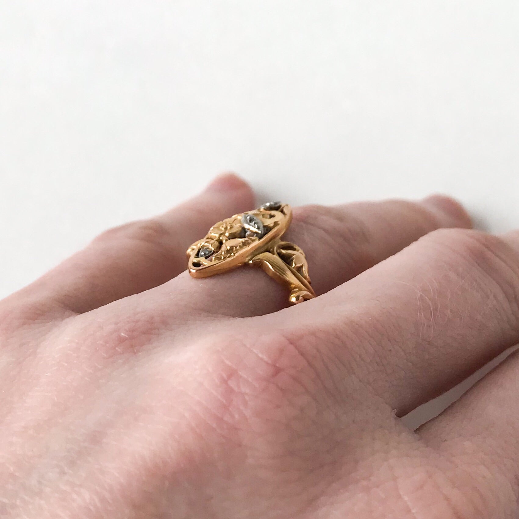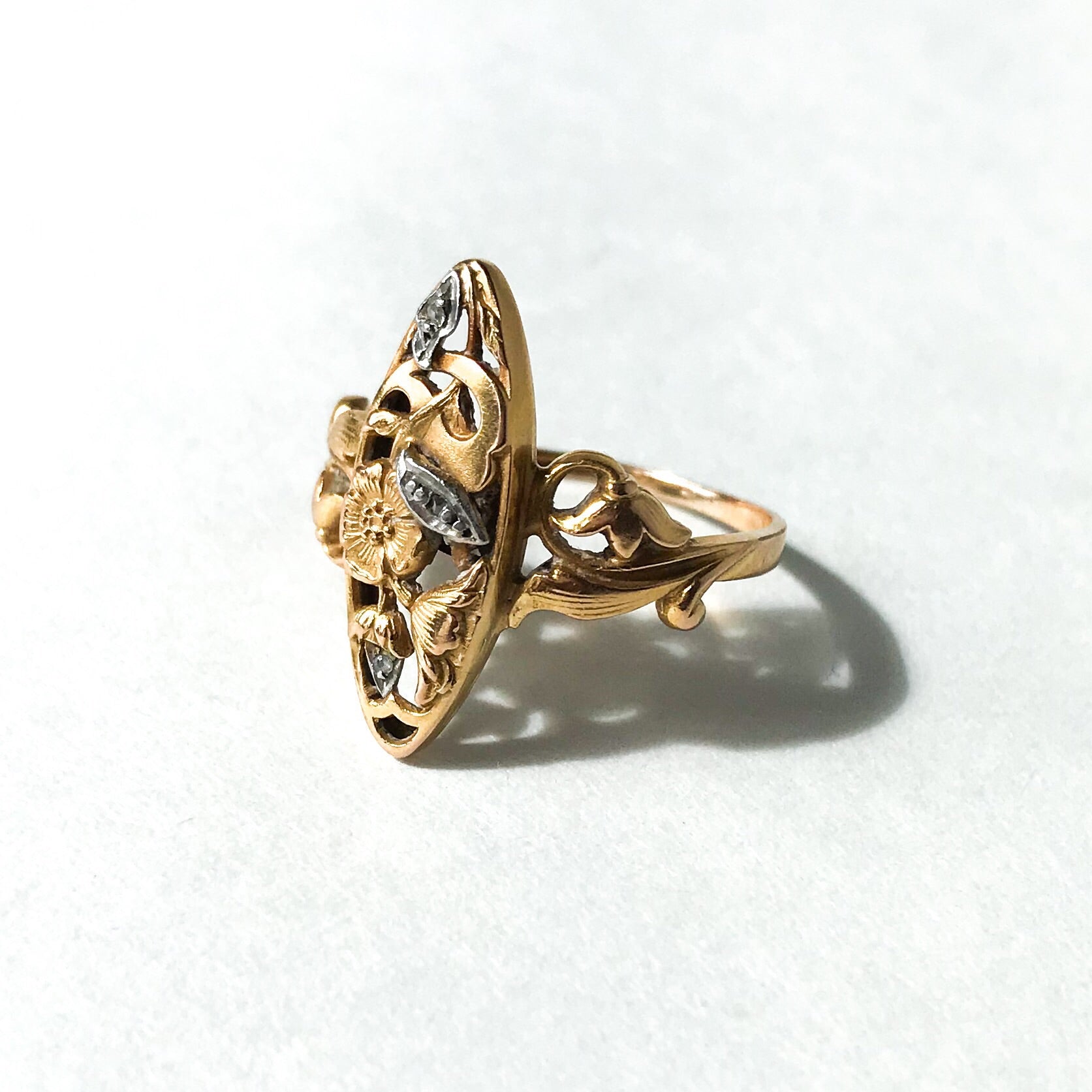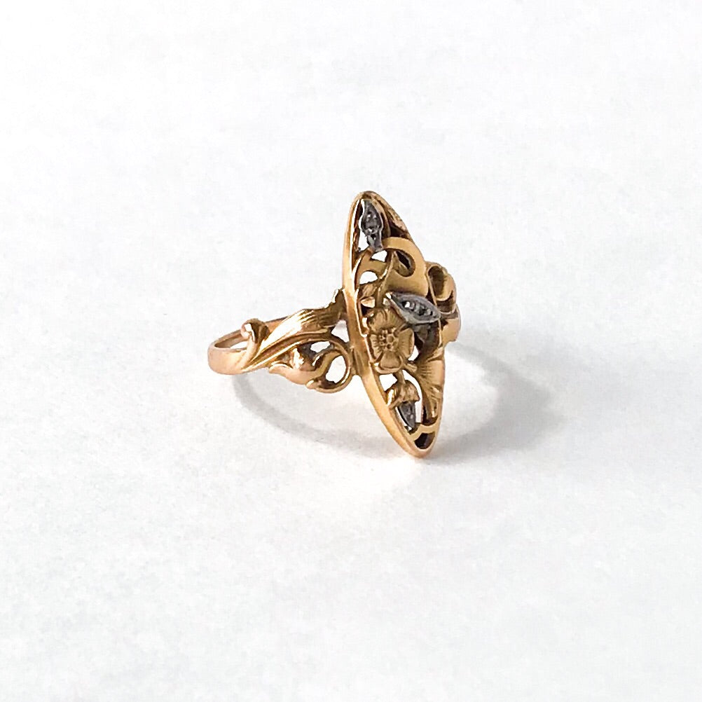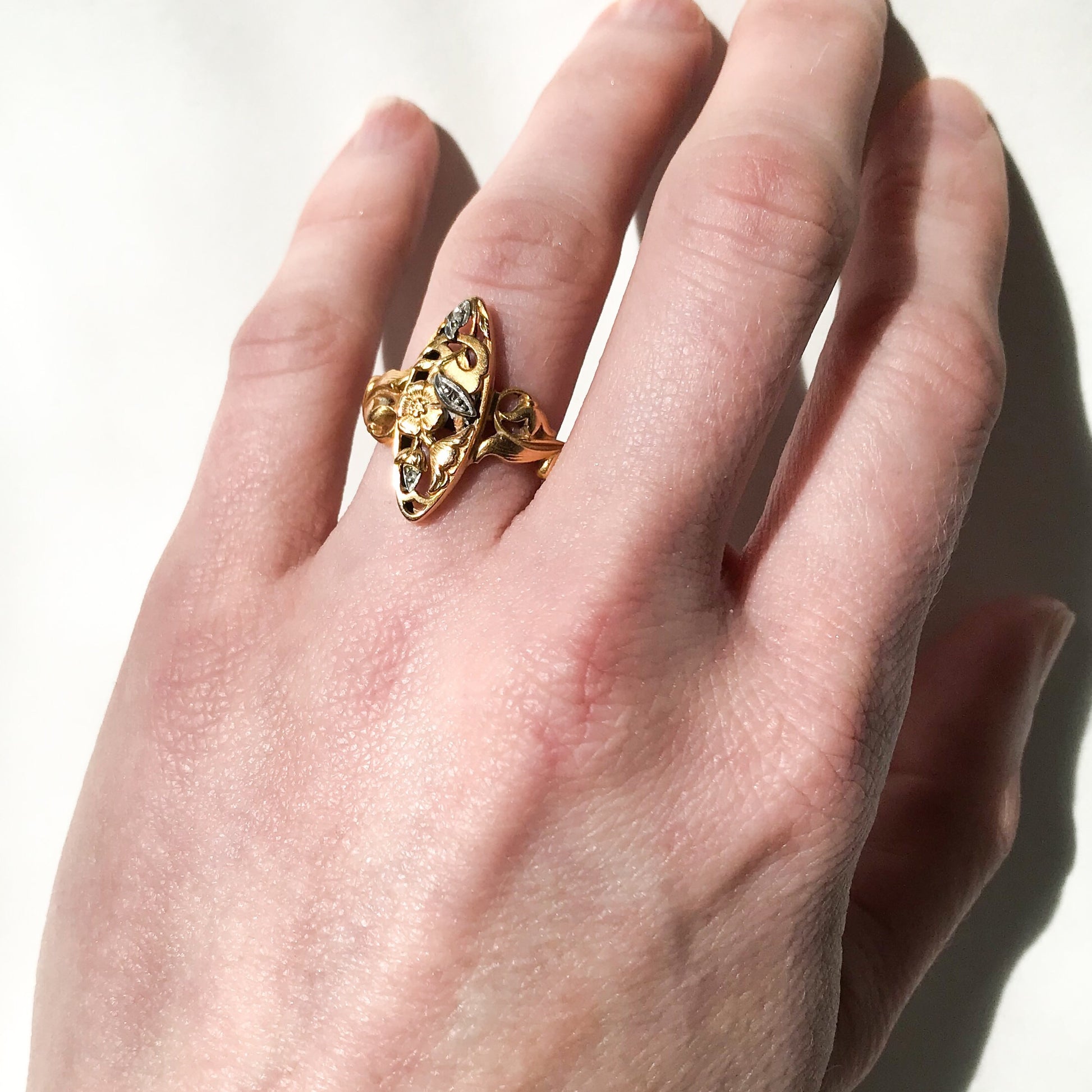 A beautiful, romantic navette shaped diamond ring from the early 1900's featuring three tiny rose cut diamonds set in silver leaves amongst an 18k yellow gold floral openwork mounting. This ring looks very French to me, but it has been resized at some point and there are no hallmarks. I love the gorgeous, flowing, intricate design on this ring-- it is reminiscent of a fairytale!